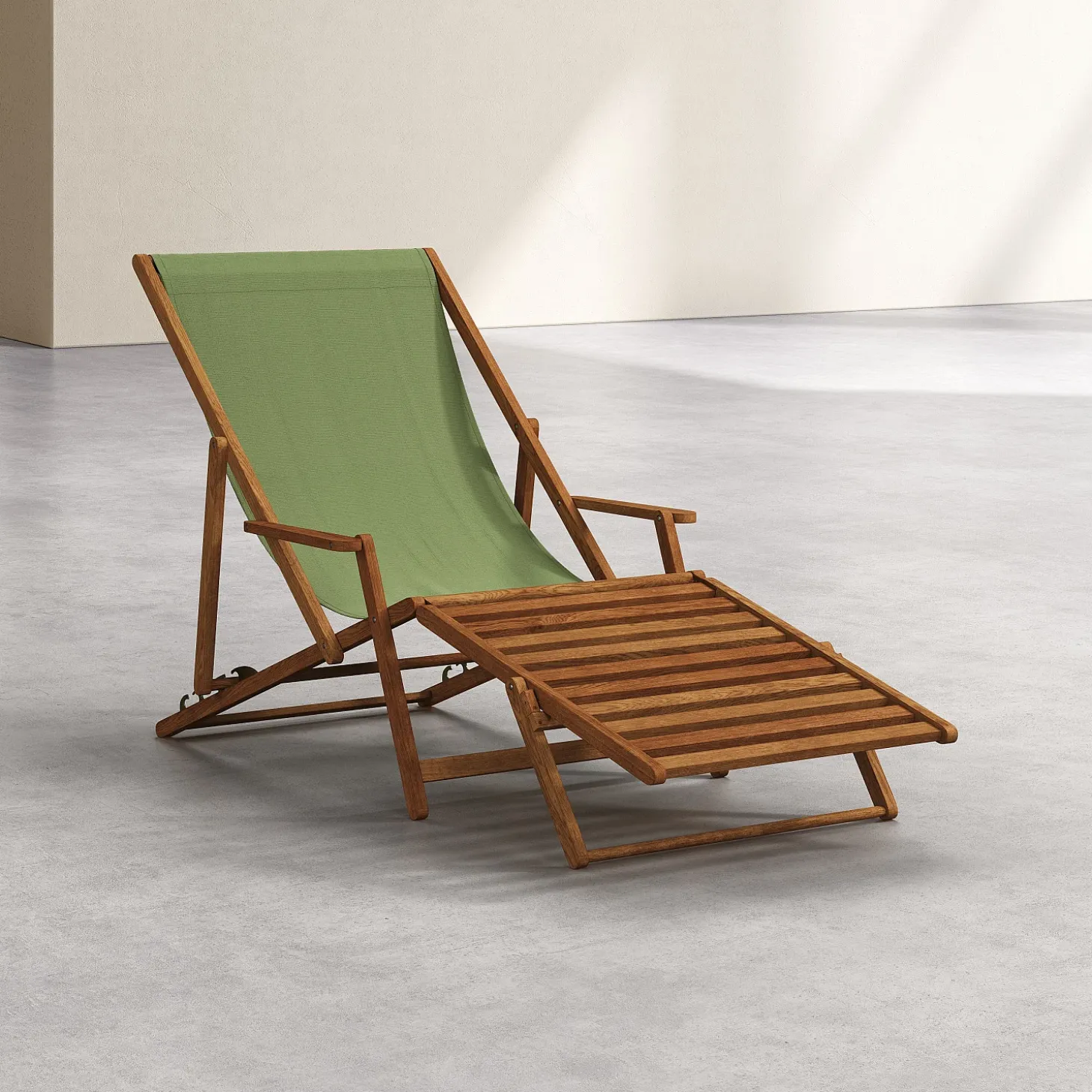 La chilienne Maui avec accoudoirs et repose-pieds associe chêne massif huilé et toile en coton vert olive dans un esprit léger et nomade.