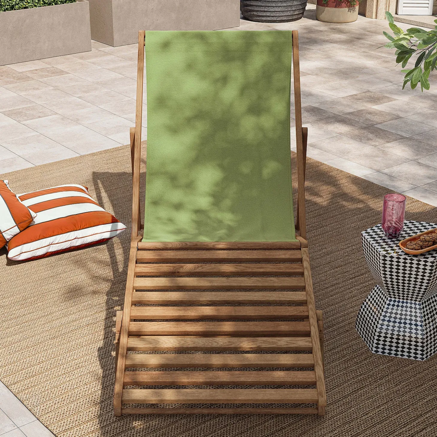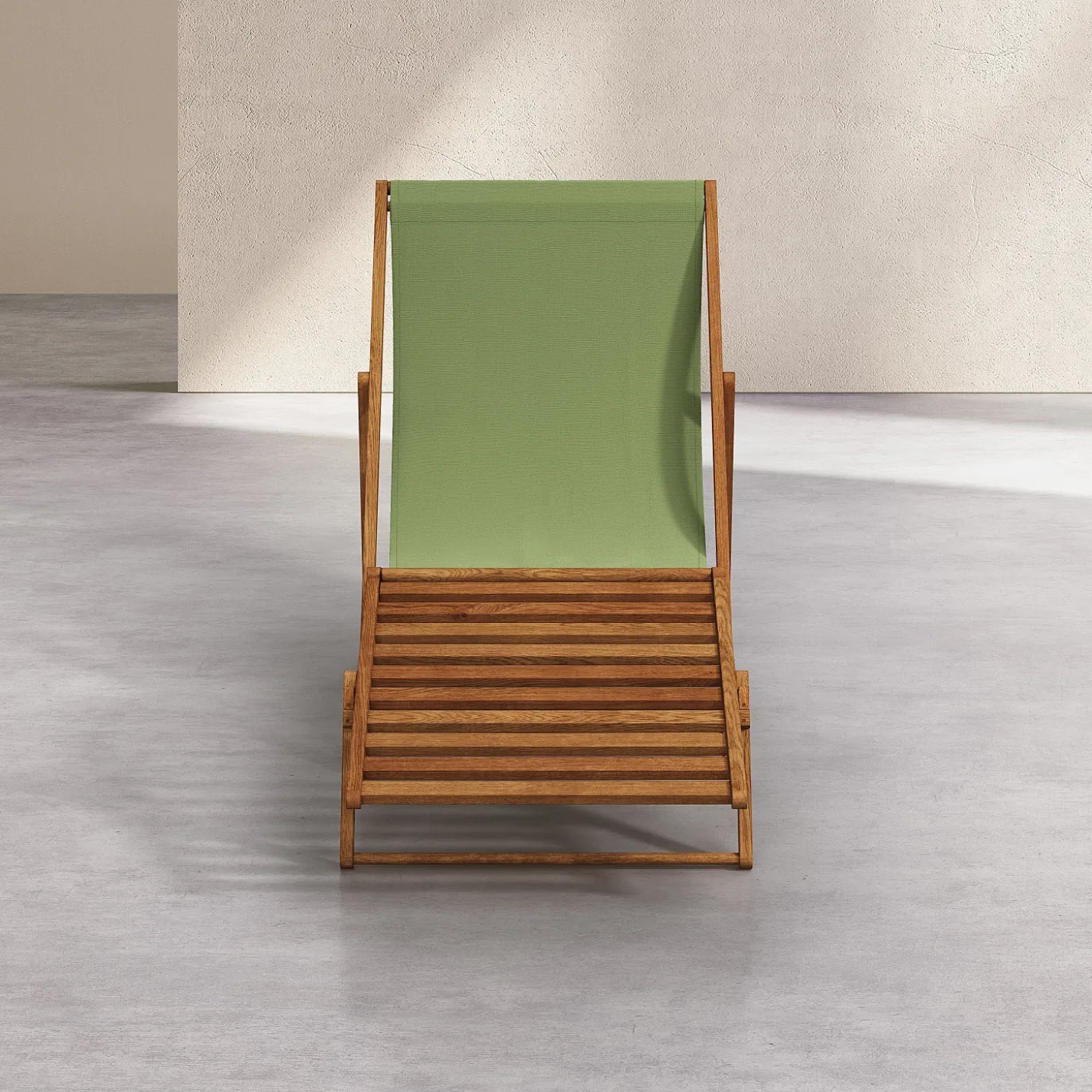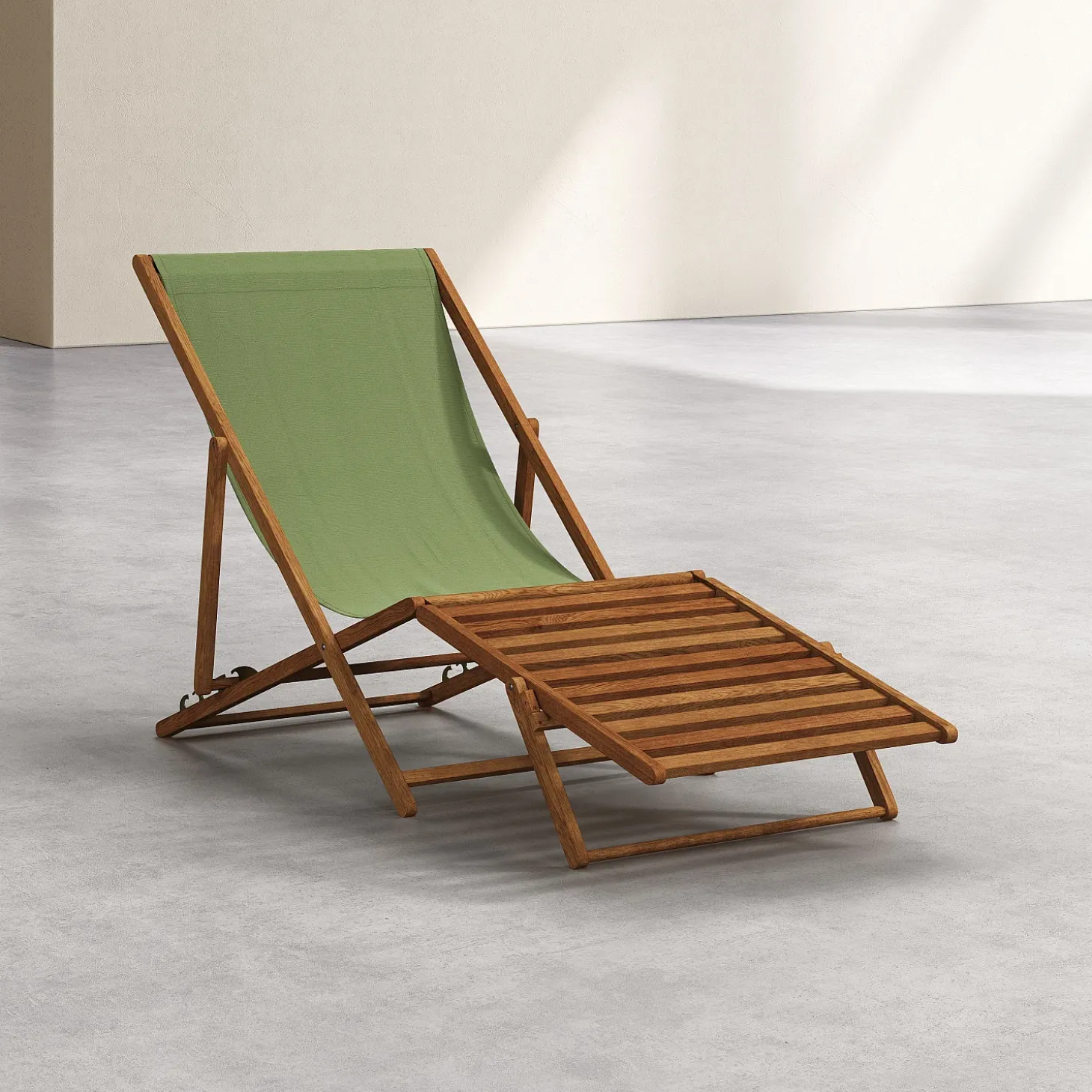 Prolongée par un repose-pieds, le dossier incliné accompagne la détente, tandis que la toile vert olive insuffle une note douce et lumineuse aux extérieurs.