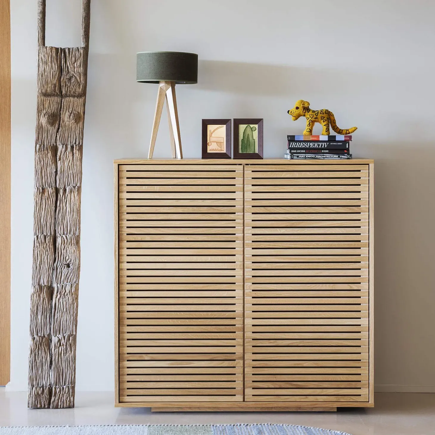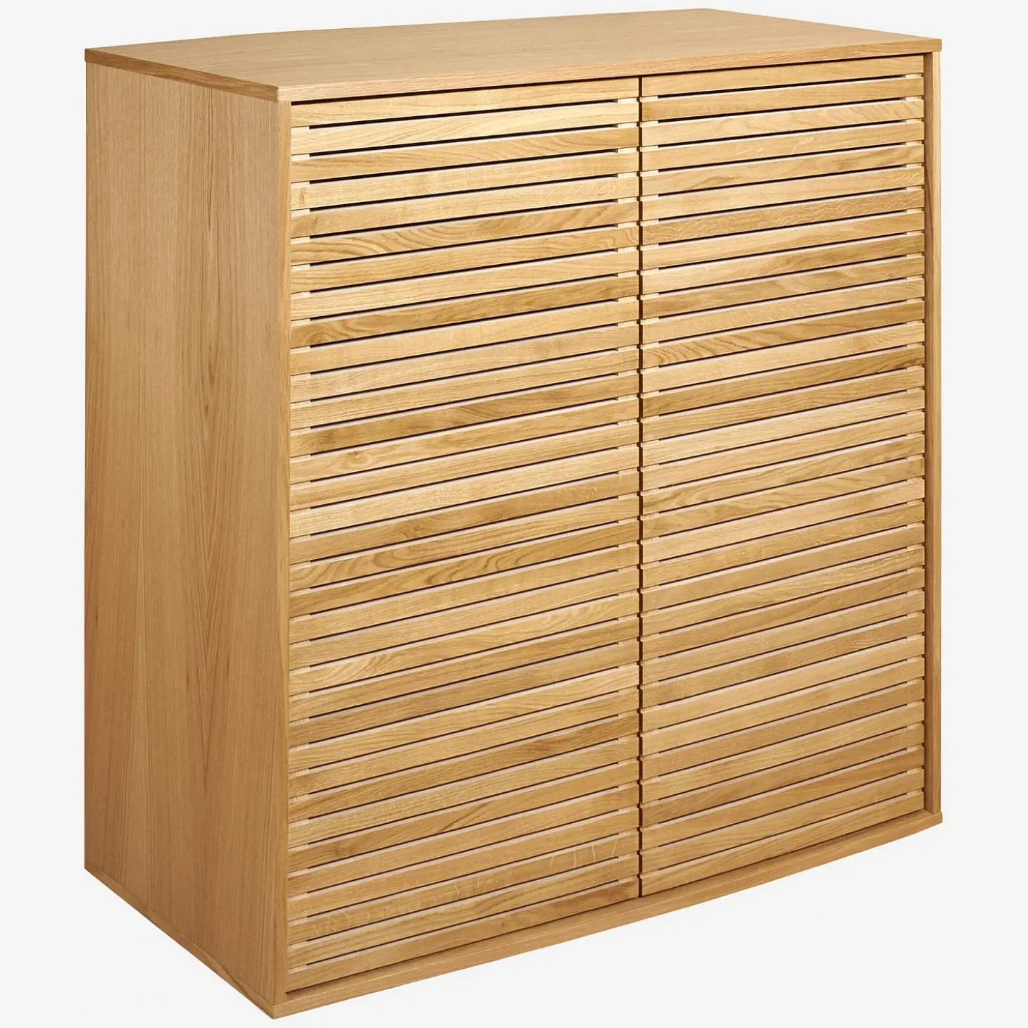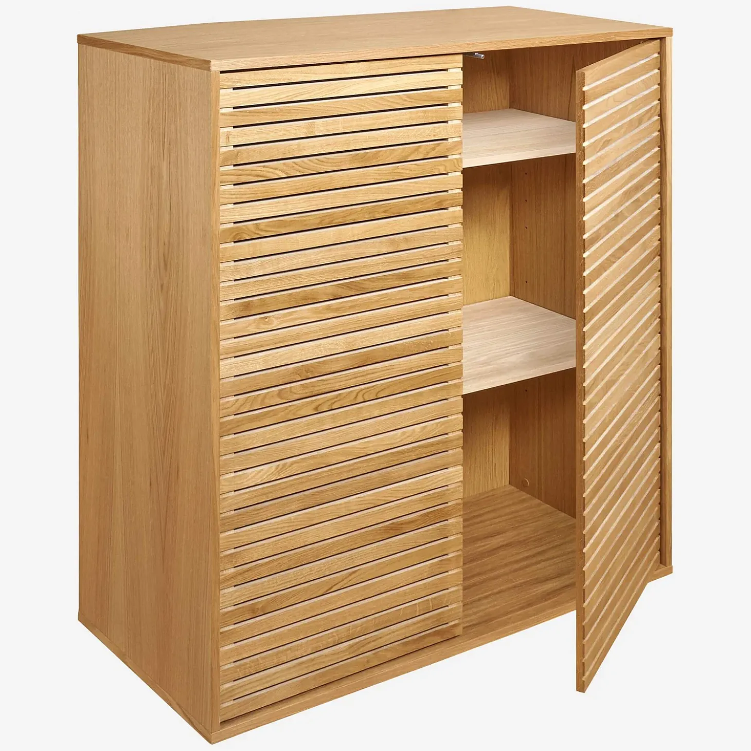 Ce buffet 2 portes, fabriqué en chêne massif et plaqué chêne, vous réserve un vaste espace de rangement. Ses deux portes à latte possèdent un système d’ouverture et de fermeture