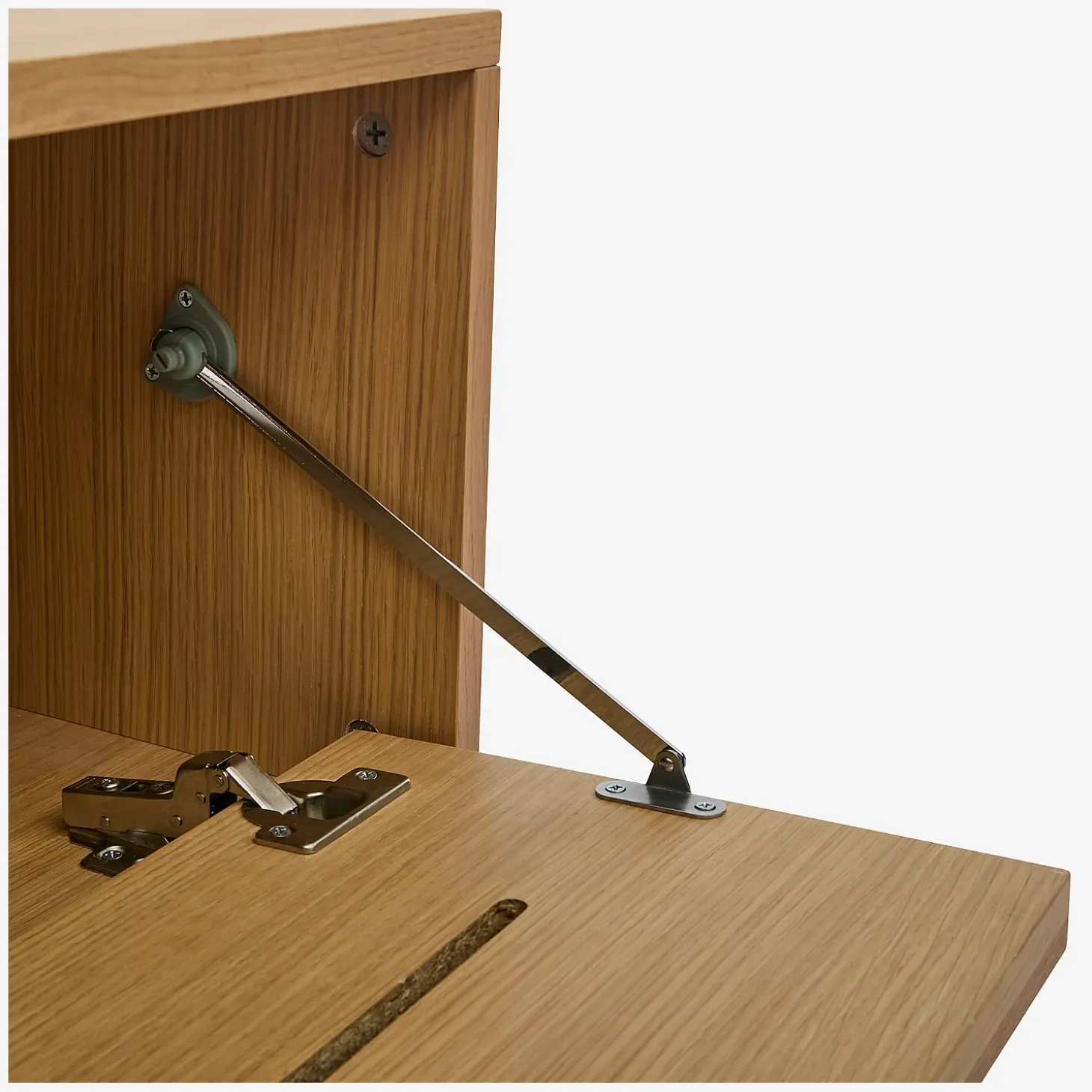 Sa porte s’ouvrant à l’horizontale cache 2 cases de rangements, complétées par un tiroir. Au dos se trouve un passage pour les câbles, afin d’assurer un espace ordonné.