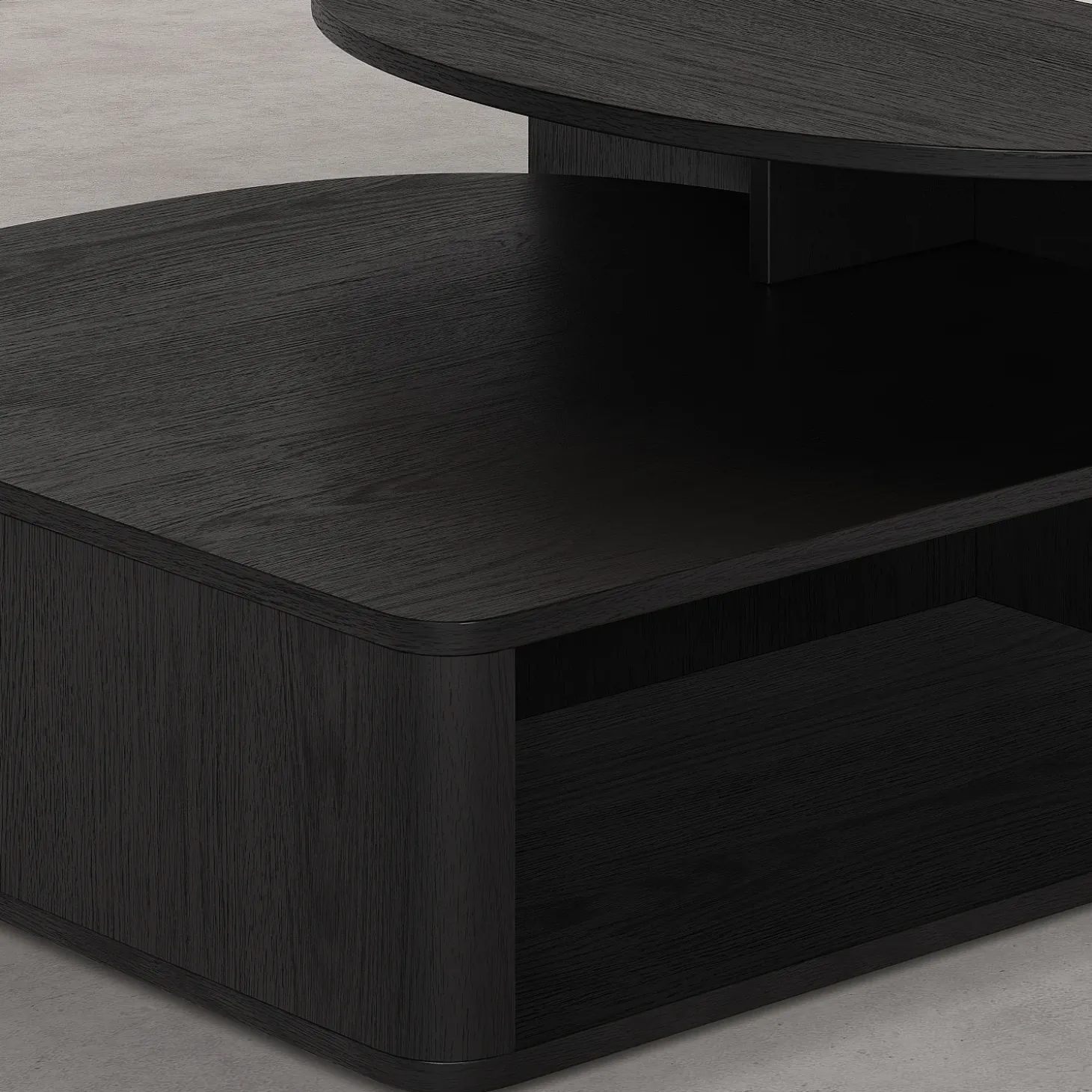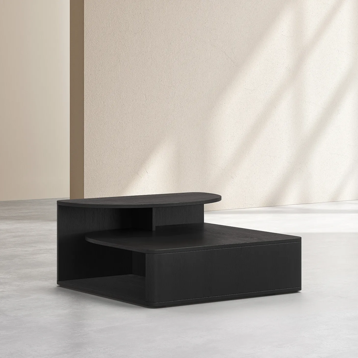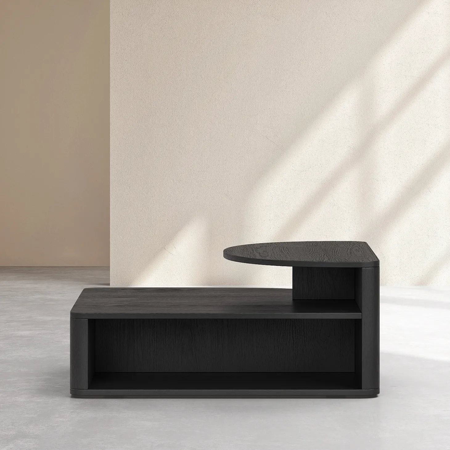 La table basse Milord propose une silhouette contemporaine qui attire le regard grâce à sa forme asymétrique singulière. Le contraste des courbes douces et des lignes droites crée un équilibre graphique subtil, accentué par la teinte profonde du frêne noir.