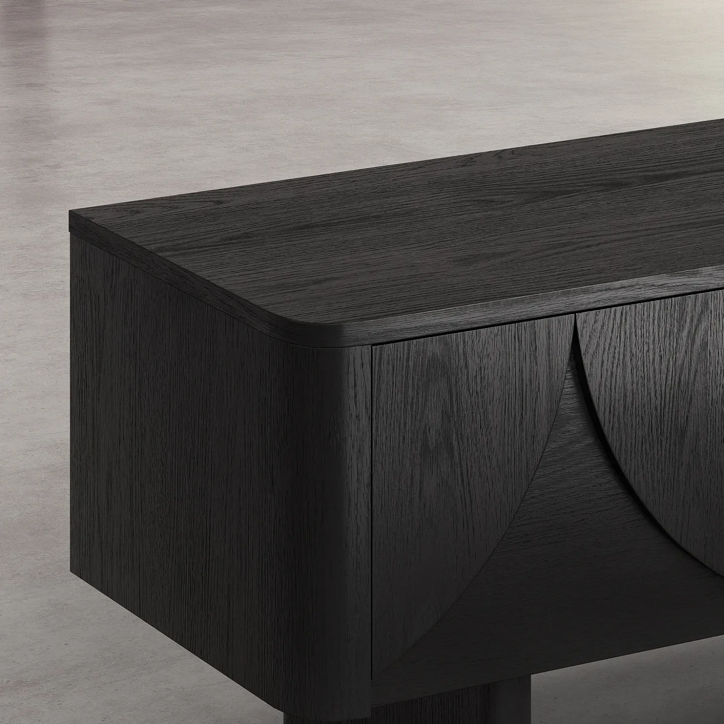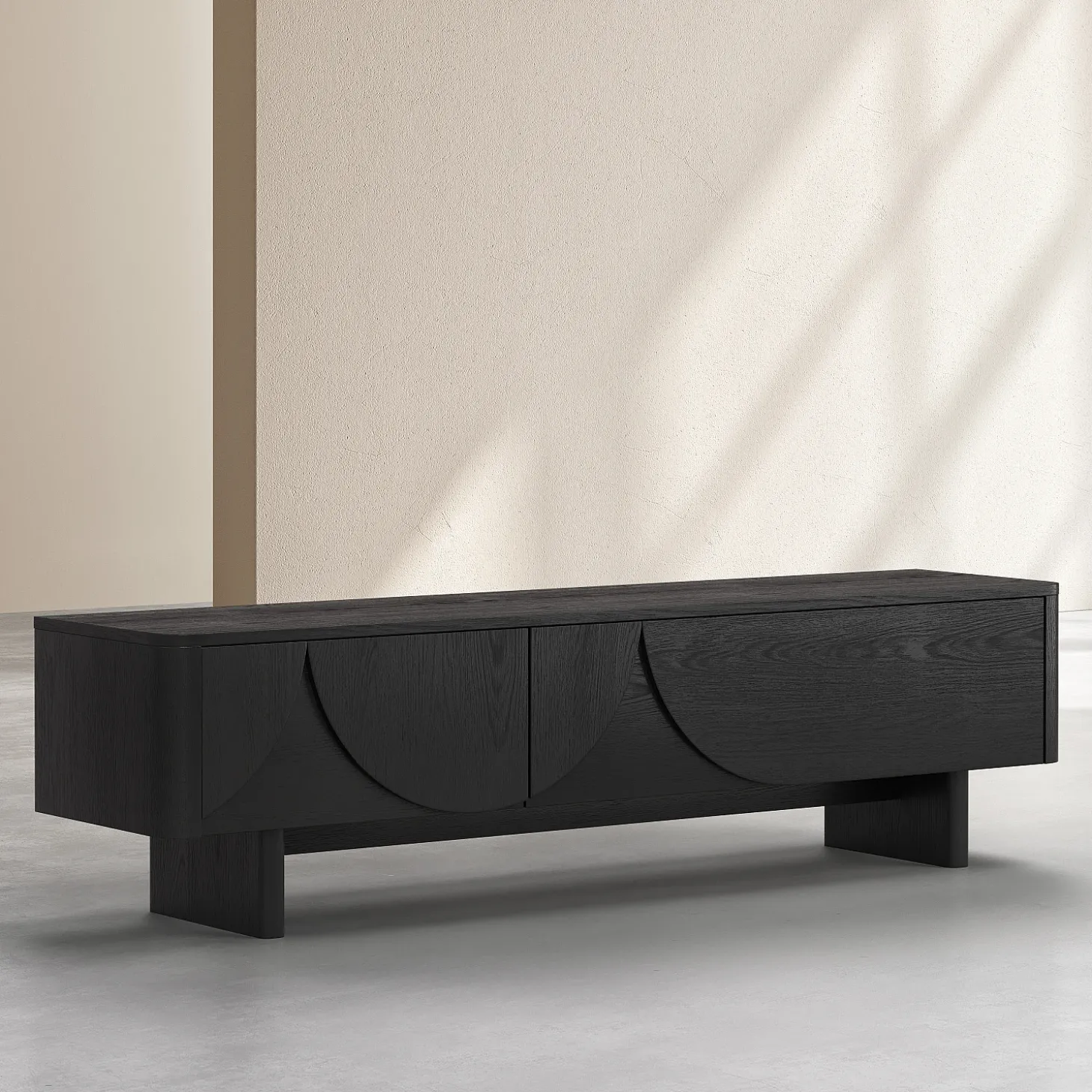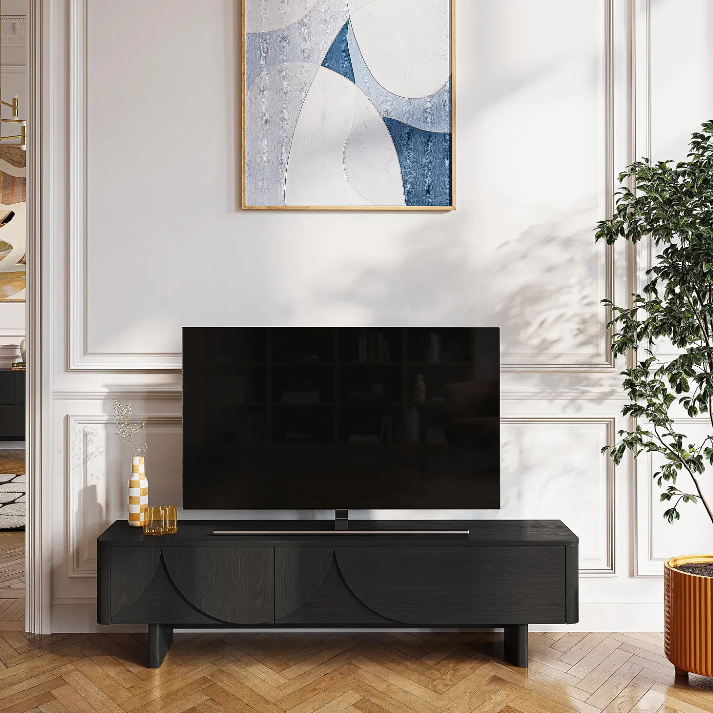 Le meuble TV Milord en frêne noir s’ouvre grâce à deux abattants dotés d’un système à compas, dissimulant un grand volume de rangement, idéal pour les équipements multimédia. Sa ligne basse allège visuellement l’espace et permet de structurer le salon avec justesse.