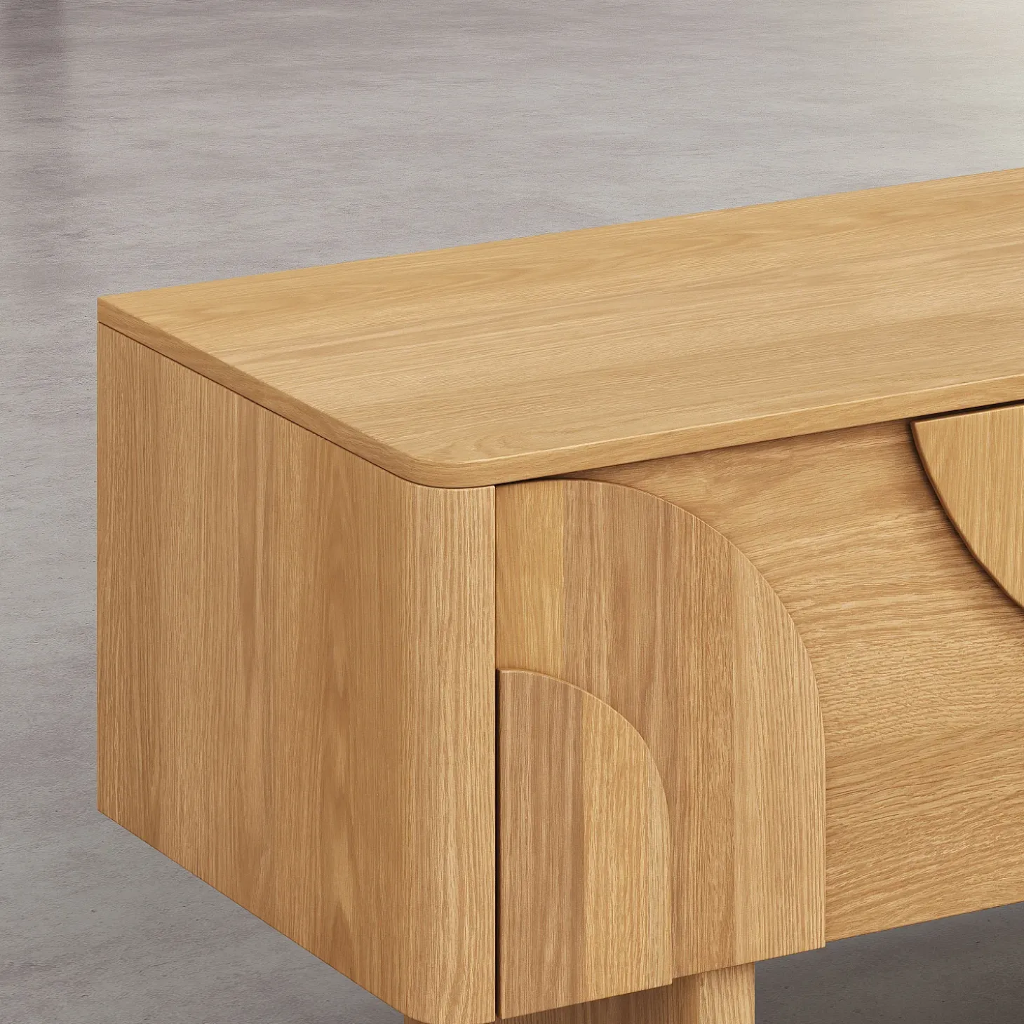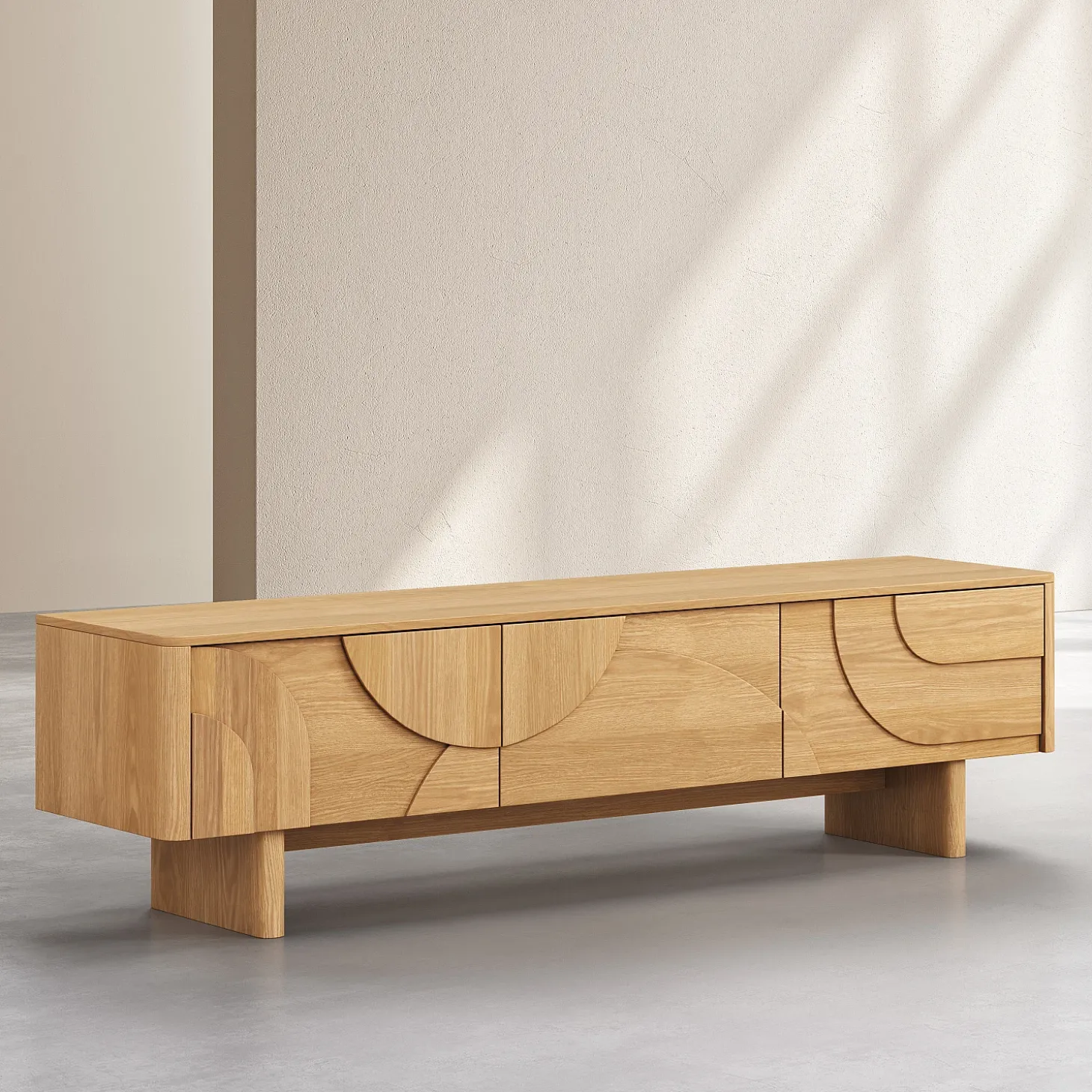 Le meuble TV Milord en chêne clair est doté de trois tiroirs parfaits pour camoufler les équipements multimédia. Sa ligne basse allège visuellement l’espace et permet de structurer le salon avec justesse.