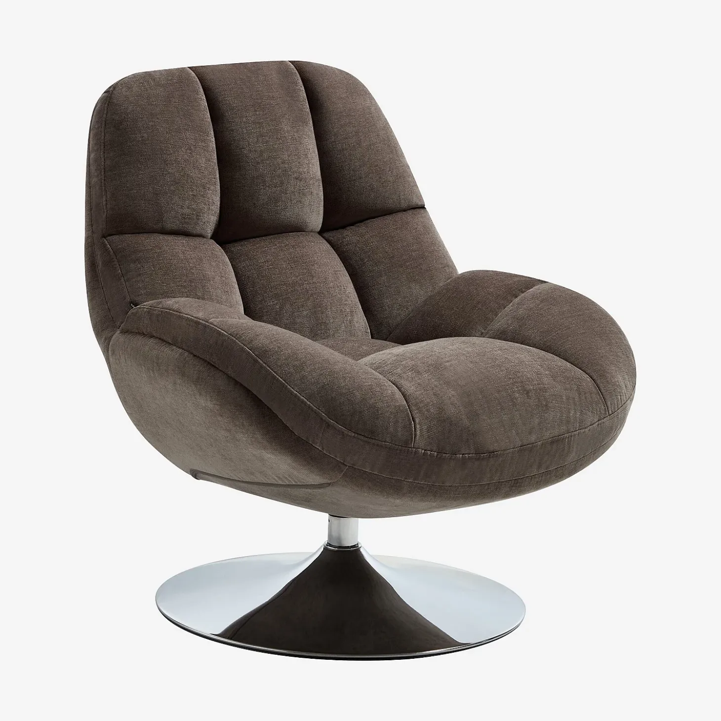Inspiré par le style rétro, ce fauteuil marie harmonieusement une esthétique vintage avec des matériaux modernes comme son pied central en métal chromé. Sa teinte taupe réchauffe l’espace avec douceur.