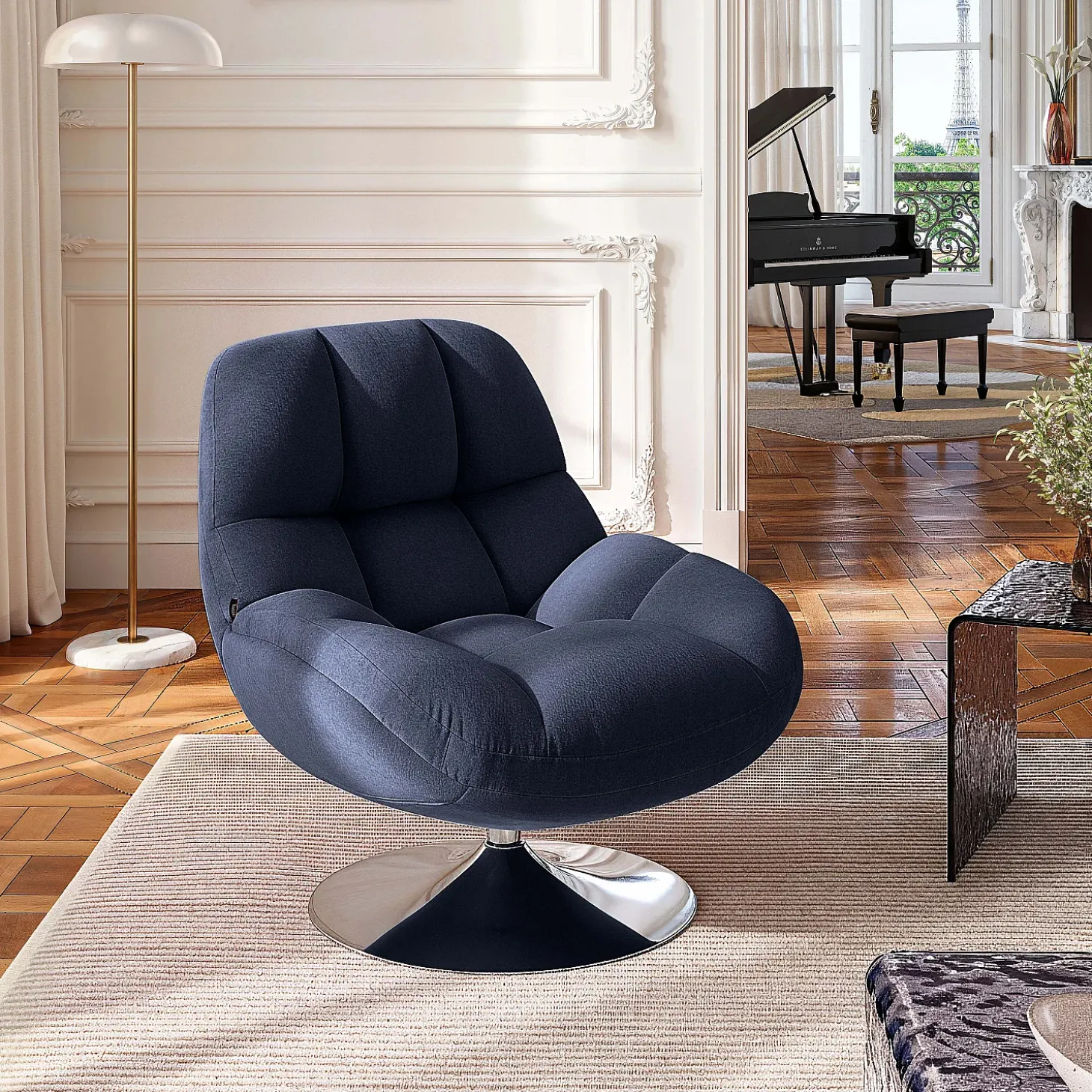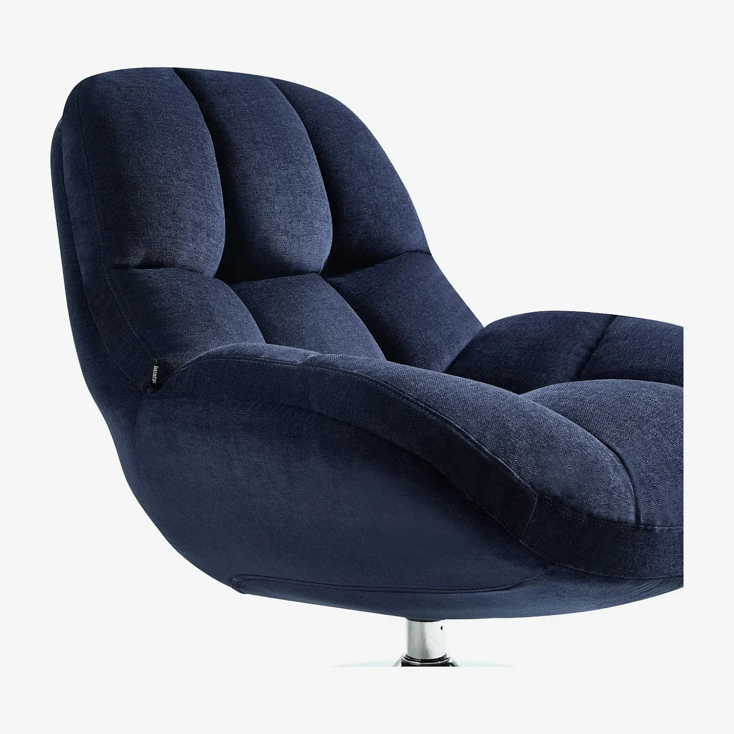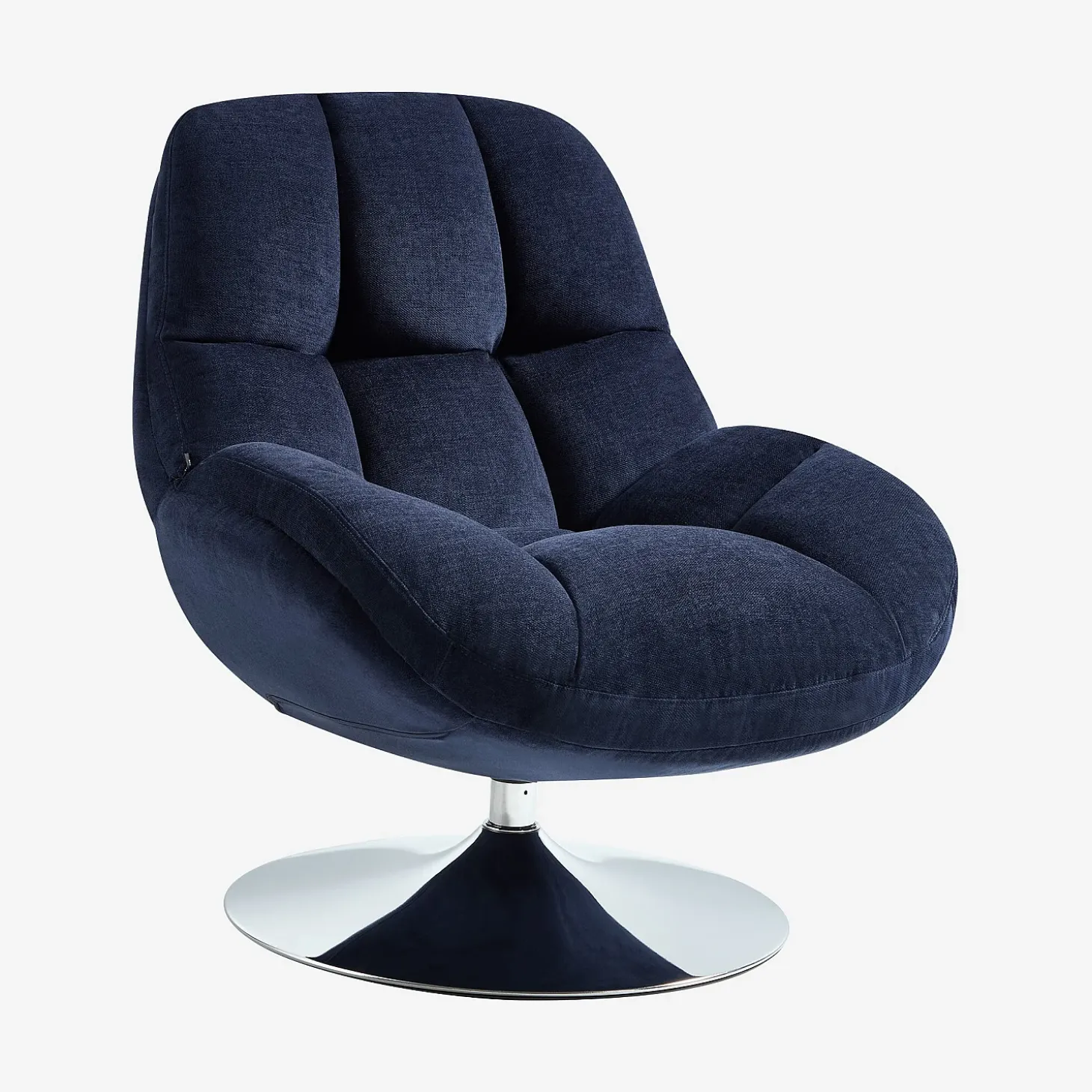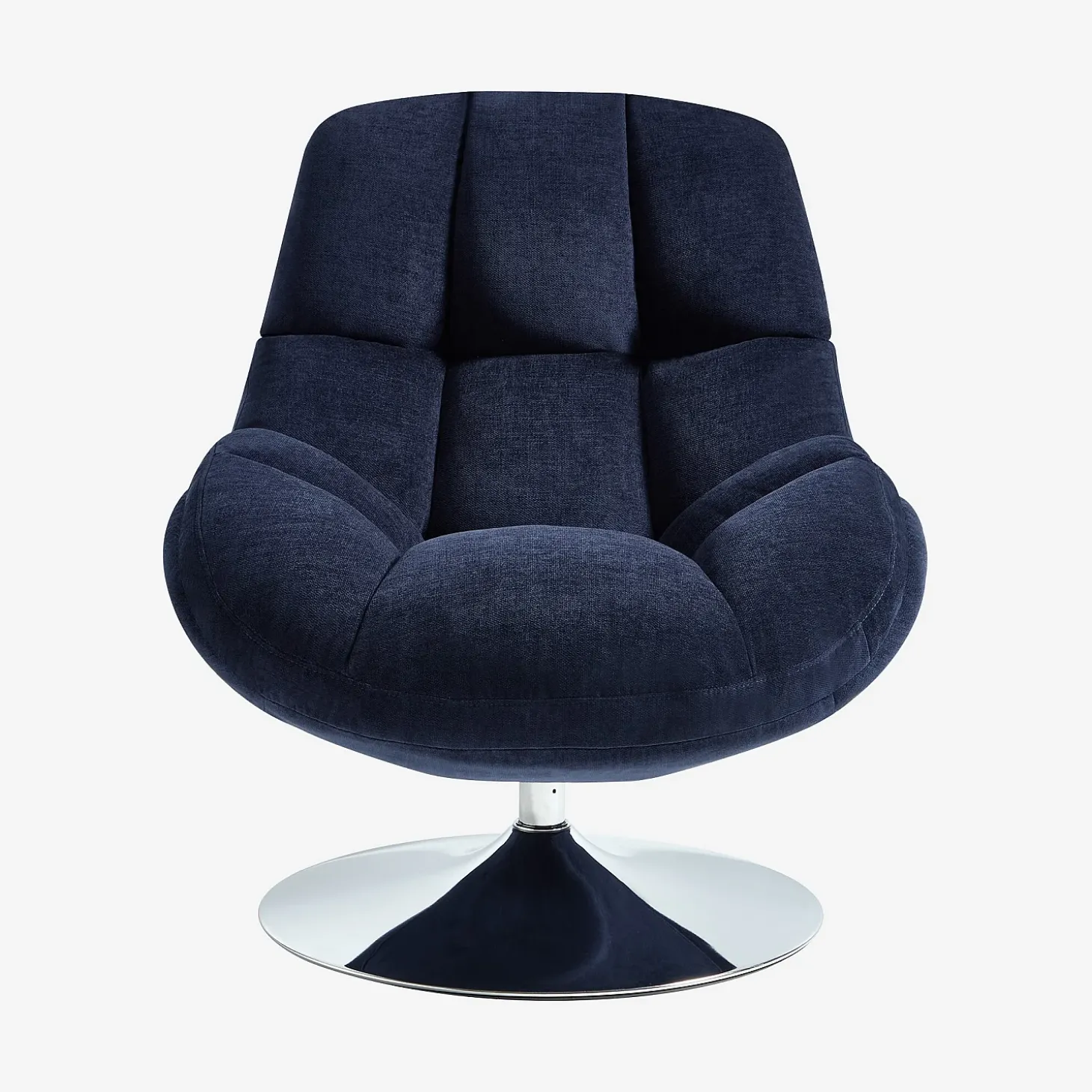 Inspiré par le style rétro, ce fauteuil marie harmonieusement une esthétique vintage avec des matériaux modernes comme son pied central en métal chromé. Sa teinte bleu nuit apporte une touche de couleur intense et apaisante.