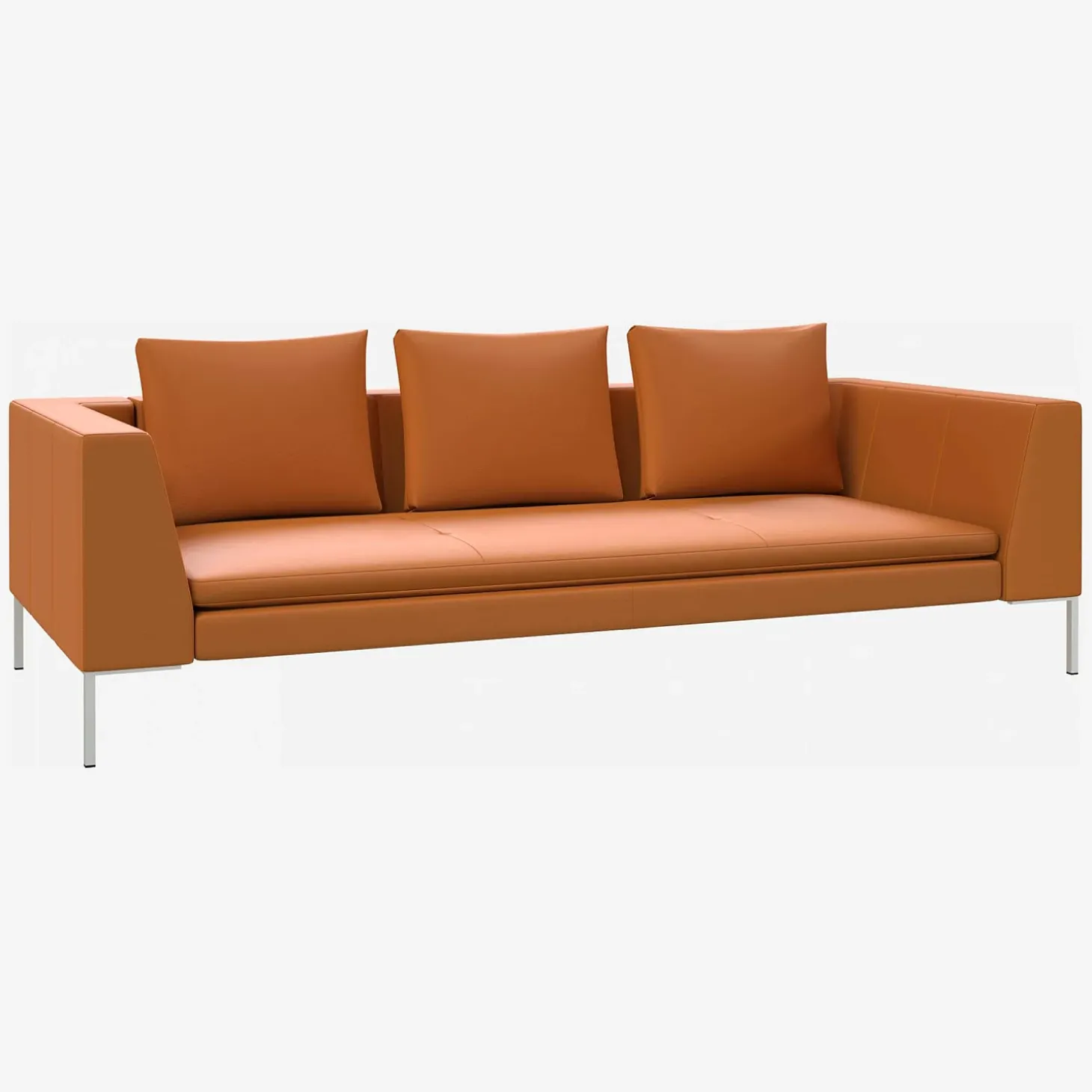 Charge maximale supportée : 390 kgAssise rectiligne, cuir lisse et piètement fin composent un canapé 3 places au style élégant et minimaliste. Une pièce intemporelle qui structure le salon avec légèreté et distinction.