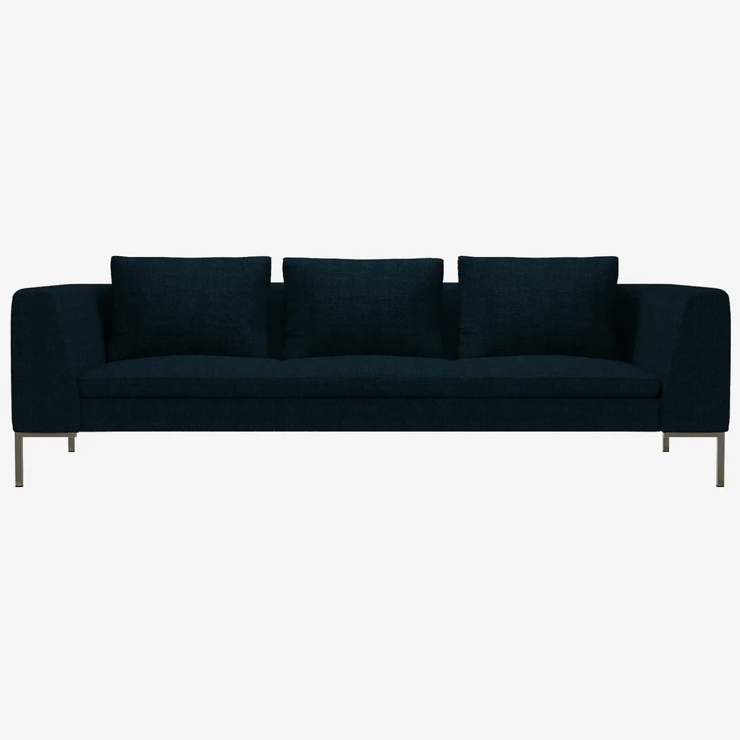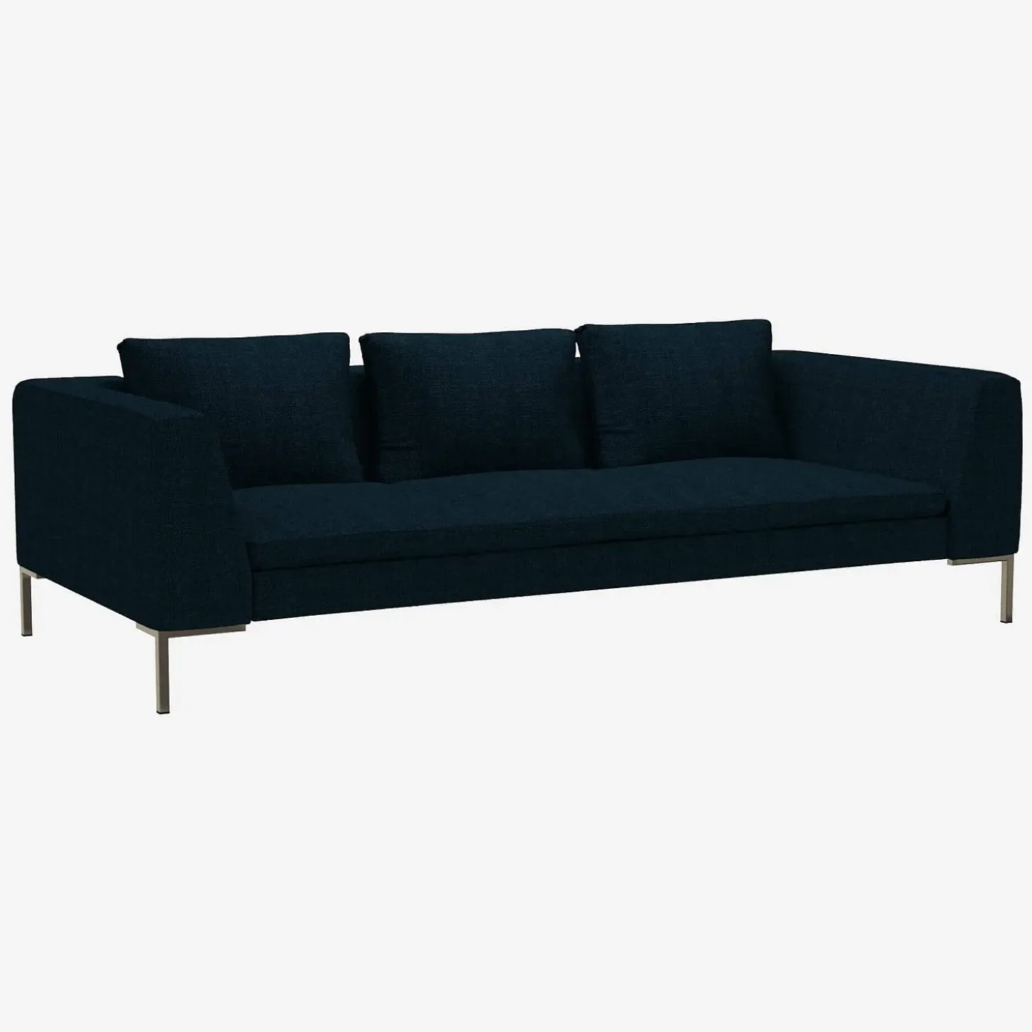 Le canapé 3 places Montino en tissu Melina bleu encre invite à la détente avec son assise moelleuse et ses accoudoirs hauts. Classiques et élégantes, ses lignes élancées et son design intemporel en feront la pièce maîtresse de votre salon.