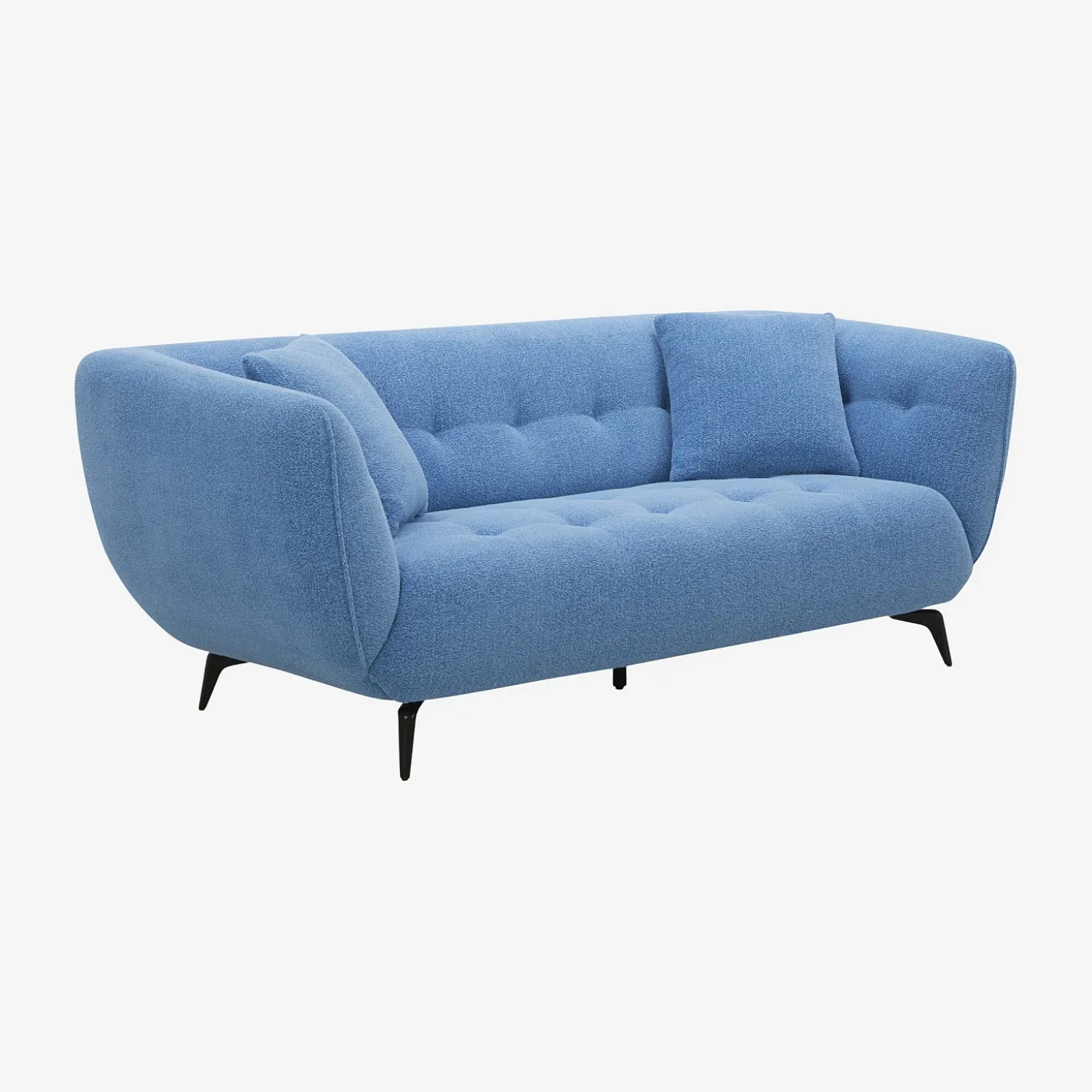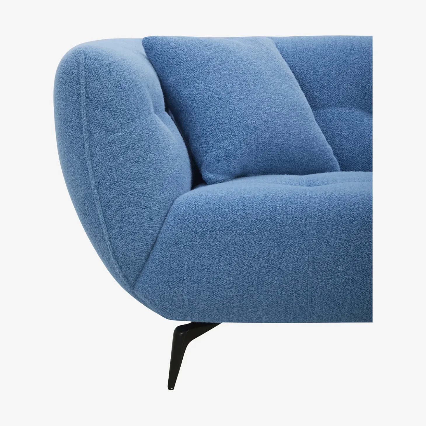 Sa structure incurvée repose sur des pieds fins en métal noir qui allègent visuellement l’ensemble tout en lui conférant une stabilité discrète. Revêtu d’un tissu texturé bleu vif, cette création propose un contraste dynamique entre forme douce et caractère affirmé.
