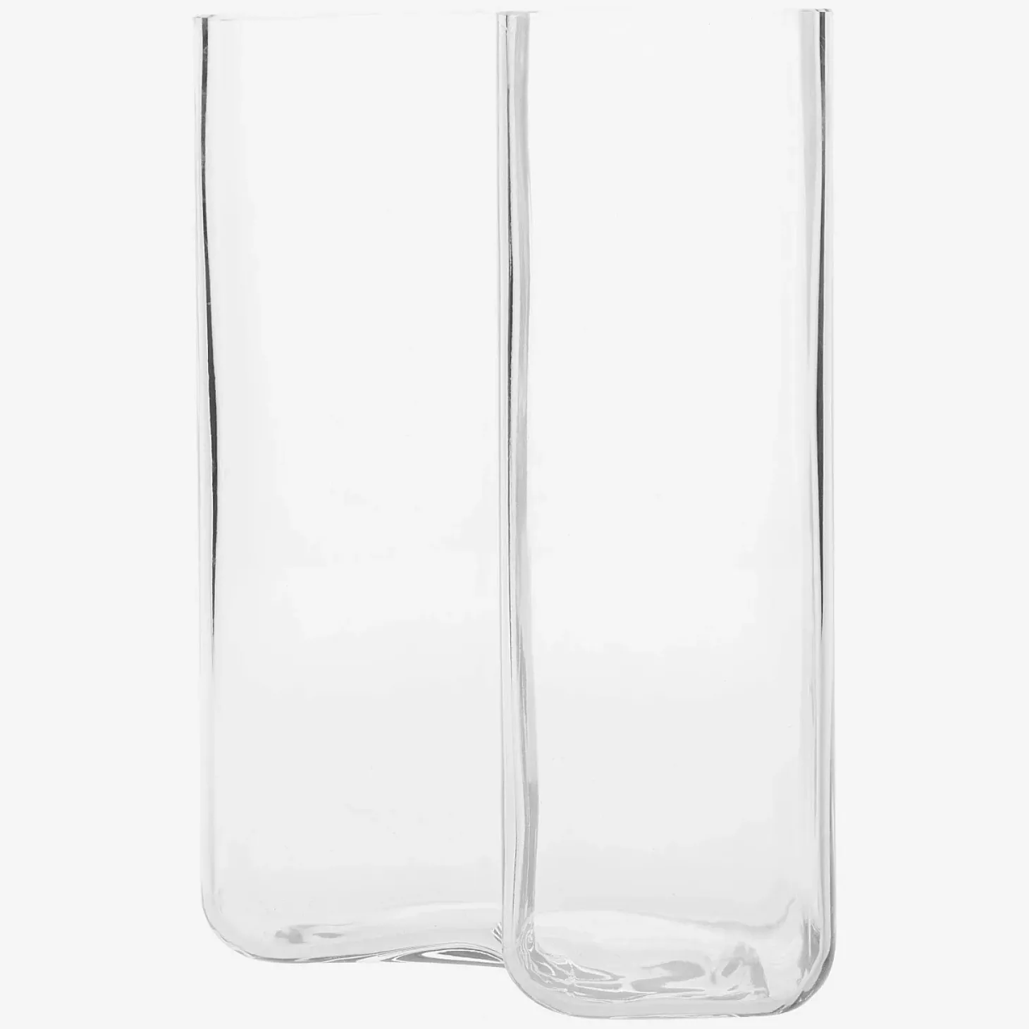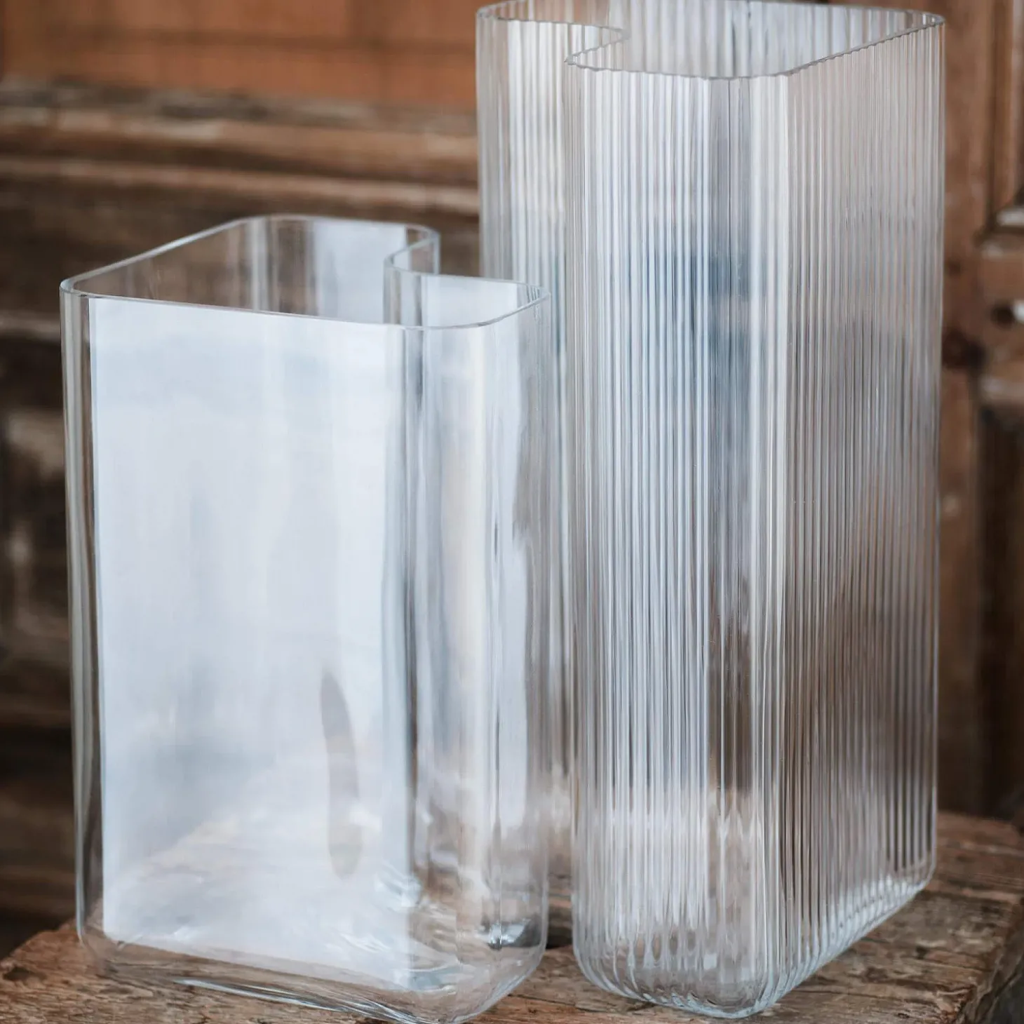 Le vase Nelson de 30 cm est en forme de coin avec un angle perpendiculaire. Il utilise le verre, un matériau classique et emprunte sa forme atypique au mouvement art déco.