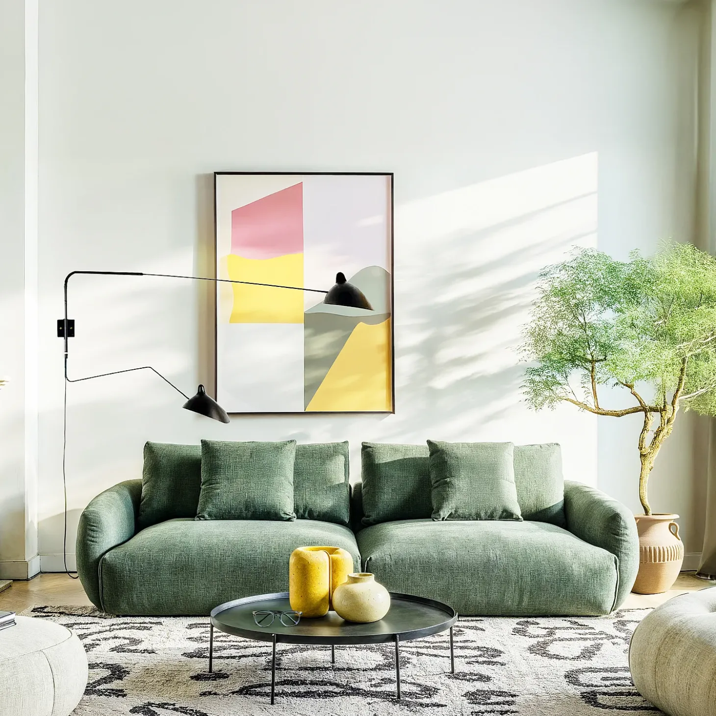 Son design épuré, souligné par des courbes douces, apporte une légèreté visuelle. Doté d’un tissu vert kaki, il révèle une touche organique et contemporaine.