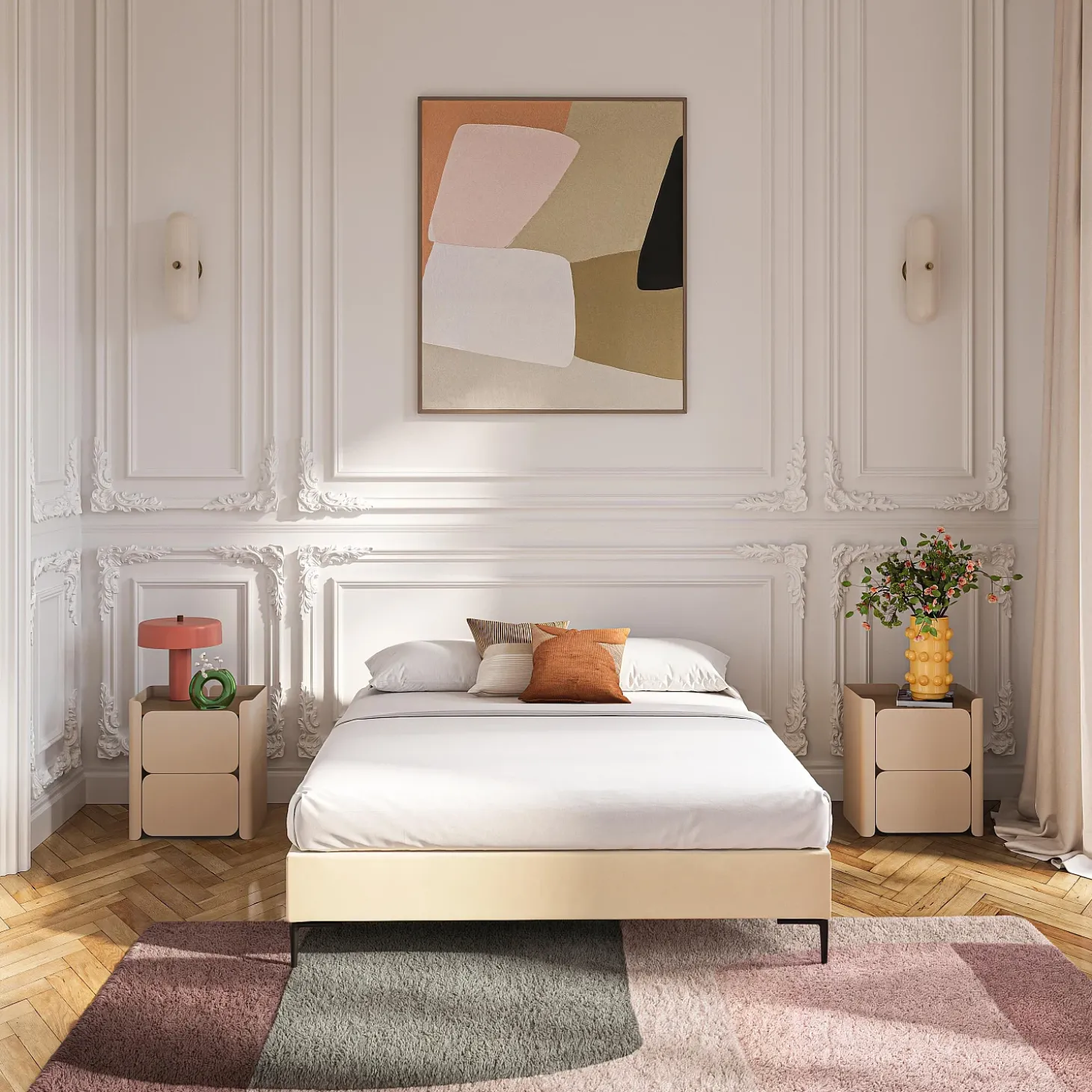 Son cadre repose sur des pieds fins en métal noir, apportant une touche graphique et contemporaine. La douceur du revêtement en tissu réchauffe la pièce, et la sobriété de sa couleur crème s’associe facilement à une tête de lit afin de personnaliser l’ensemble.