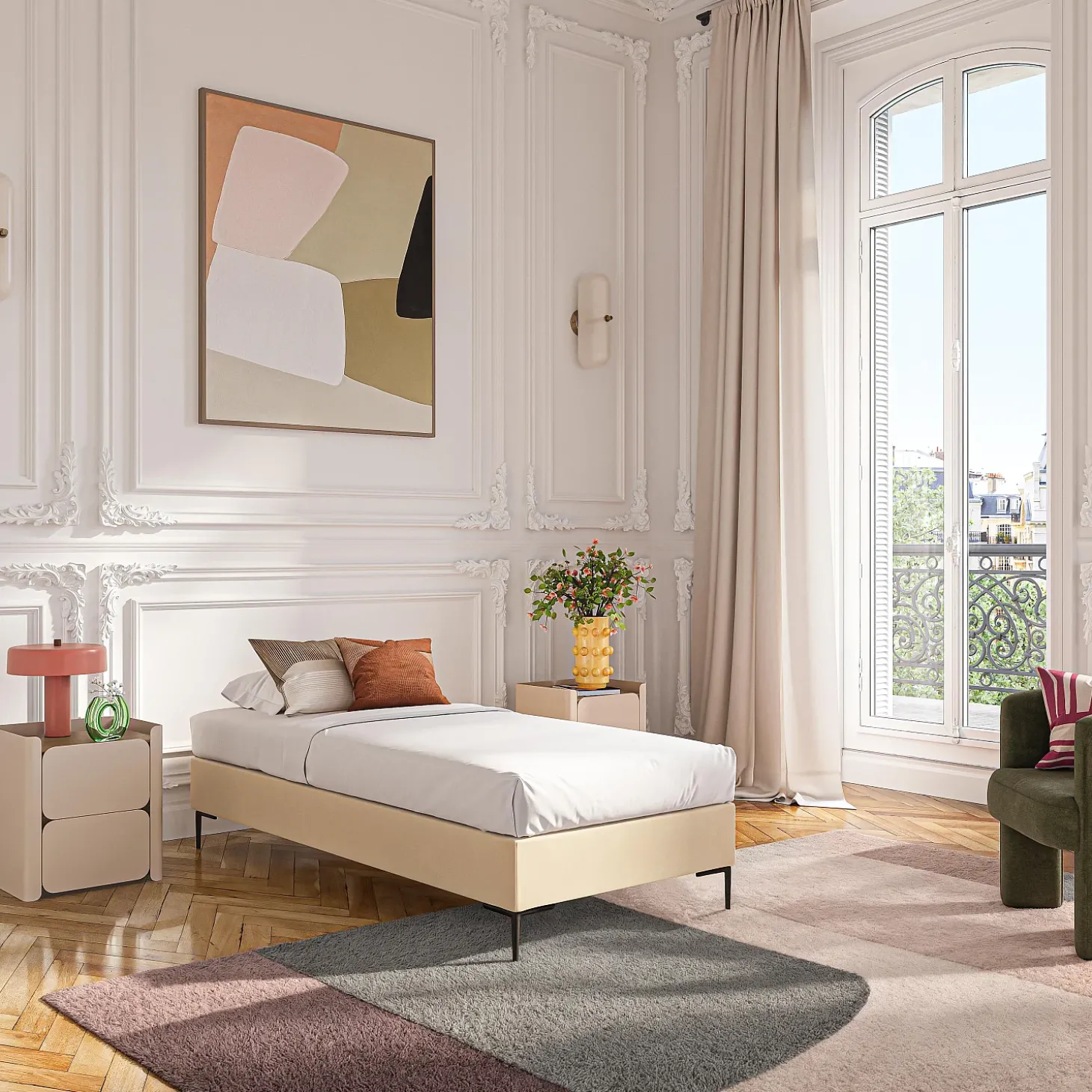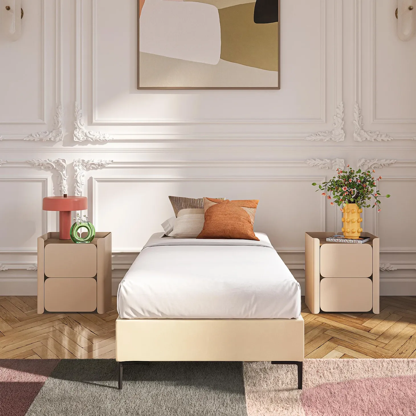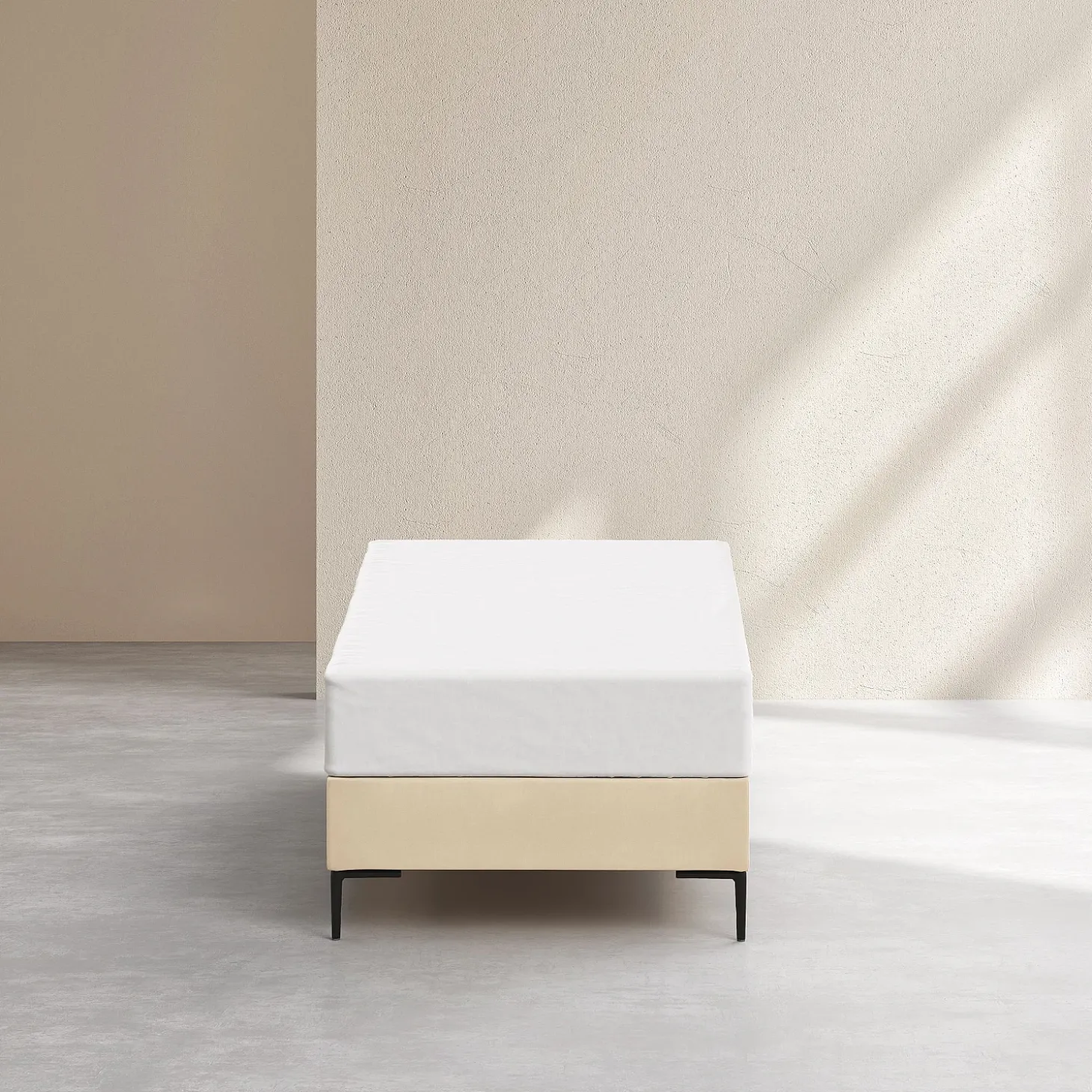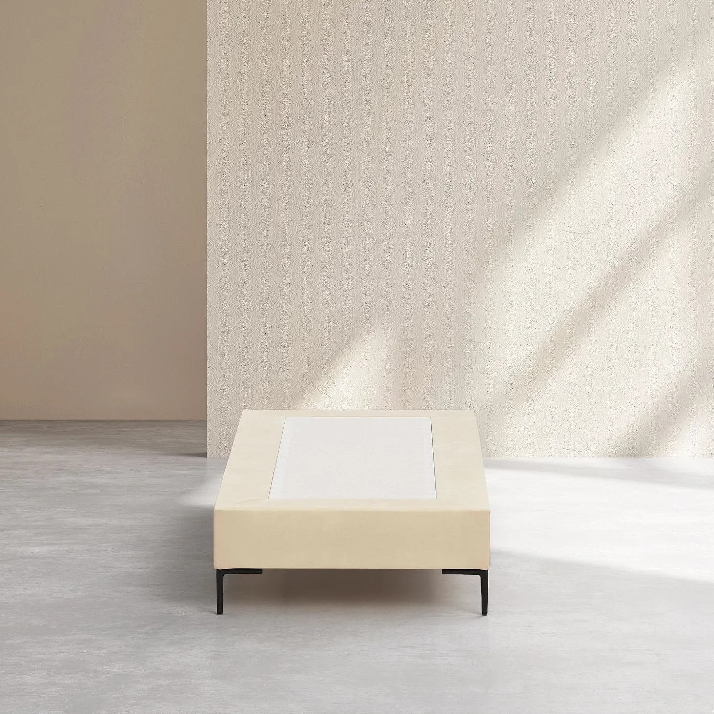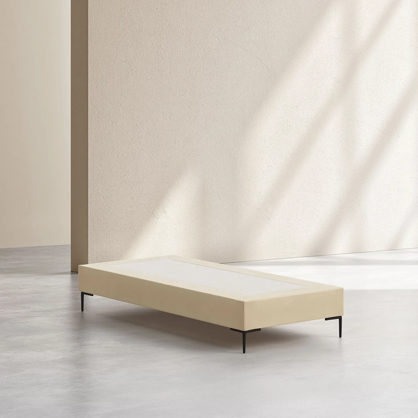 Son cadre repose sur des pieds fins en métal noir, apportant une touche graphique et contemporaine. La douceur du revêtement en tissu réchauffe la pièce, et la sobriété de sa couleur crème s’associe facilement à une tête de lit afin de personnaliser l’ensemble.