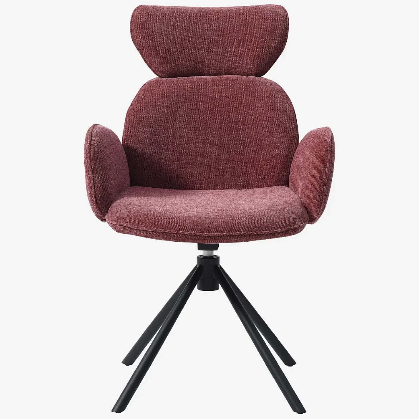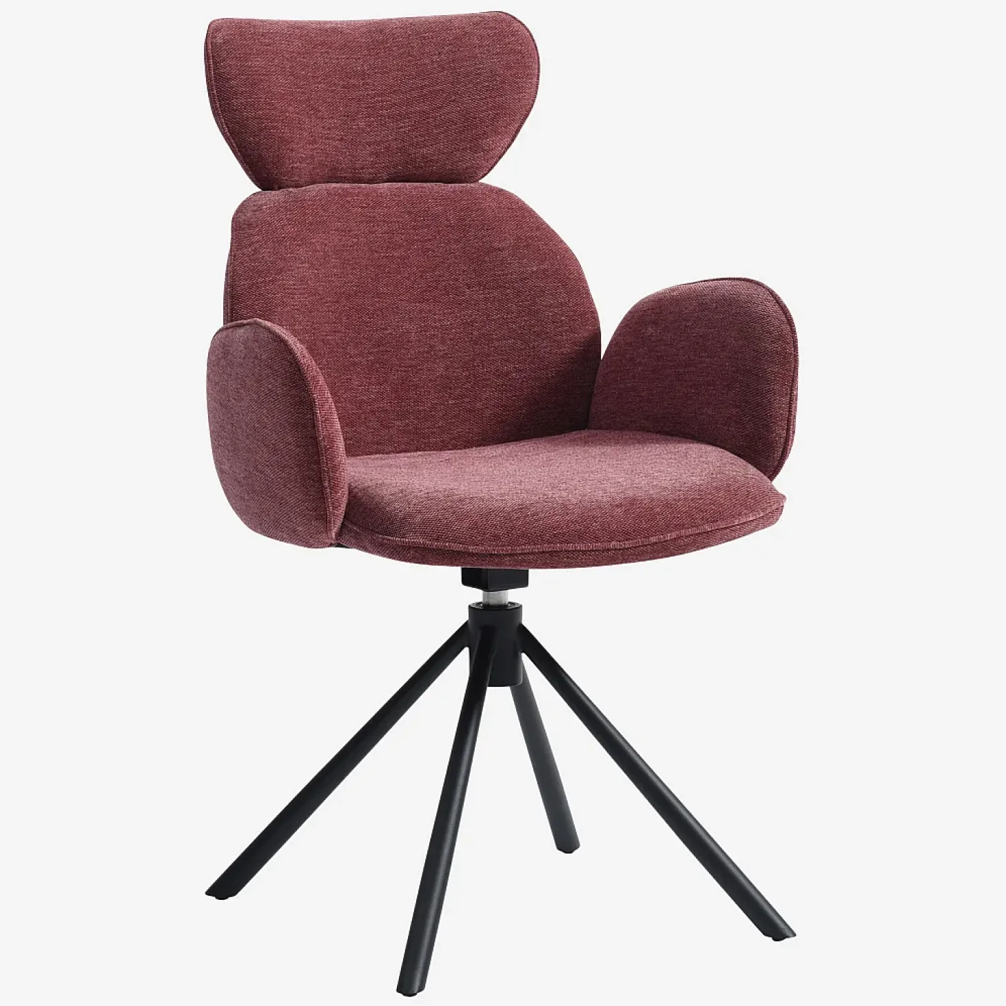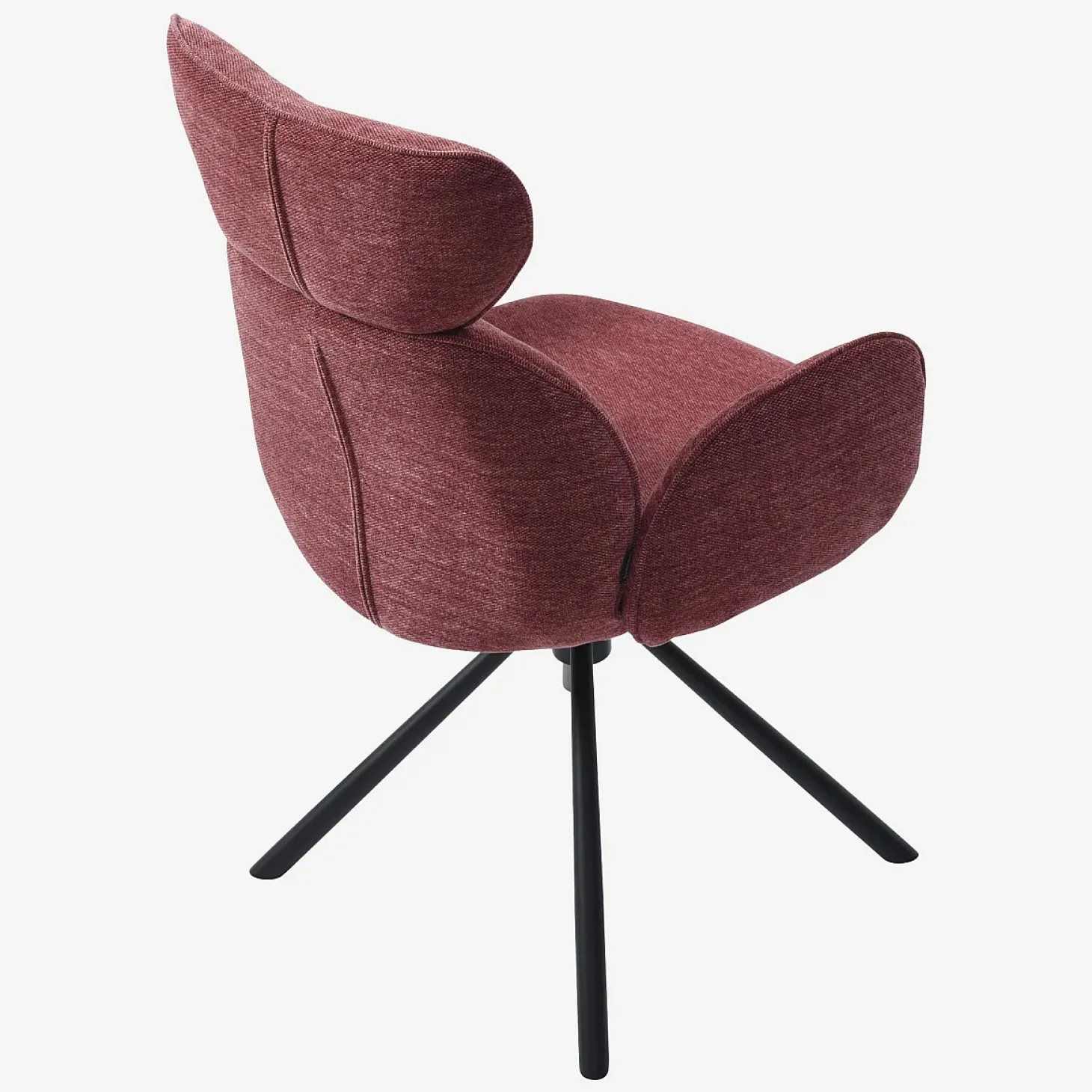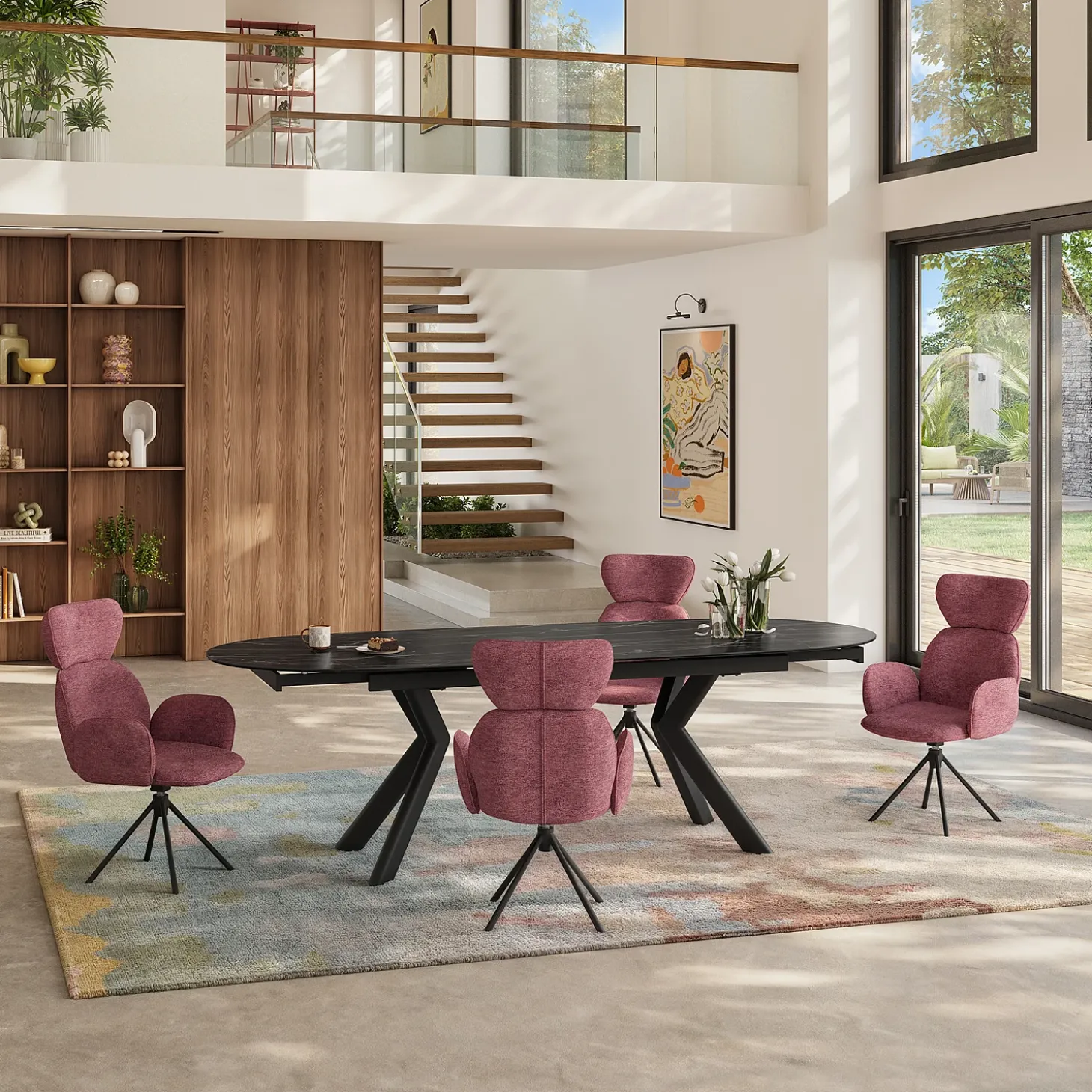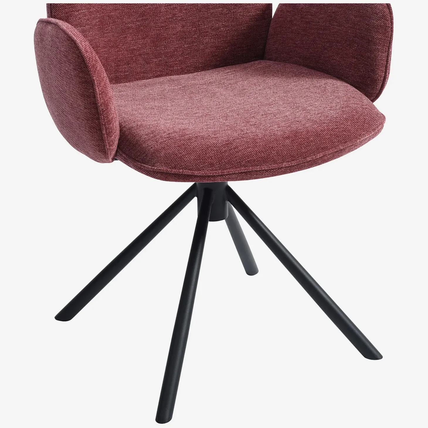 Ses pieds en métal noir mat apportent une touche graphique, tandis que son revêtement en tissu doux rouge parme insuffle une personnalité affirmée et chaleureuse à la pièce.
