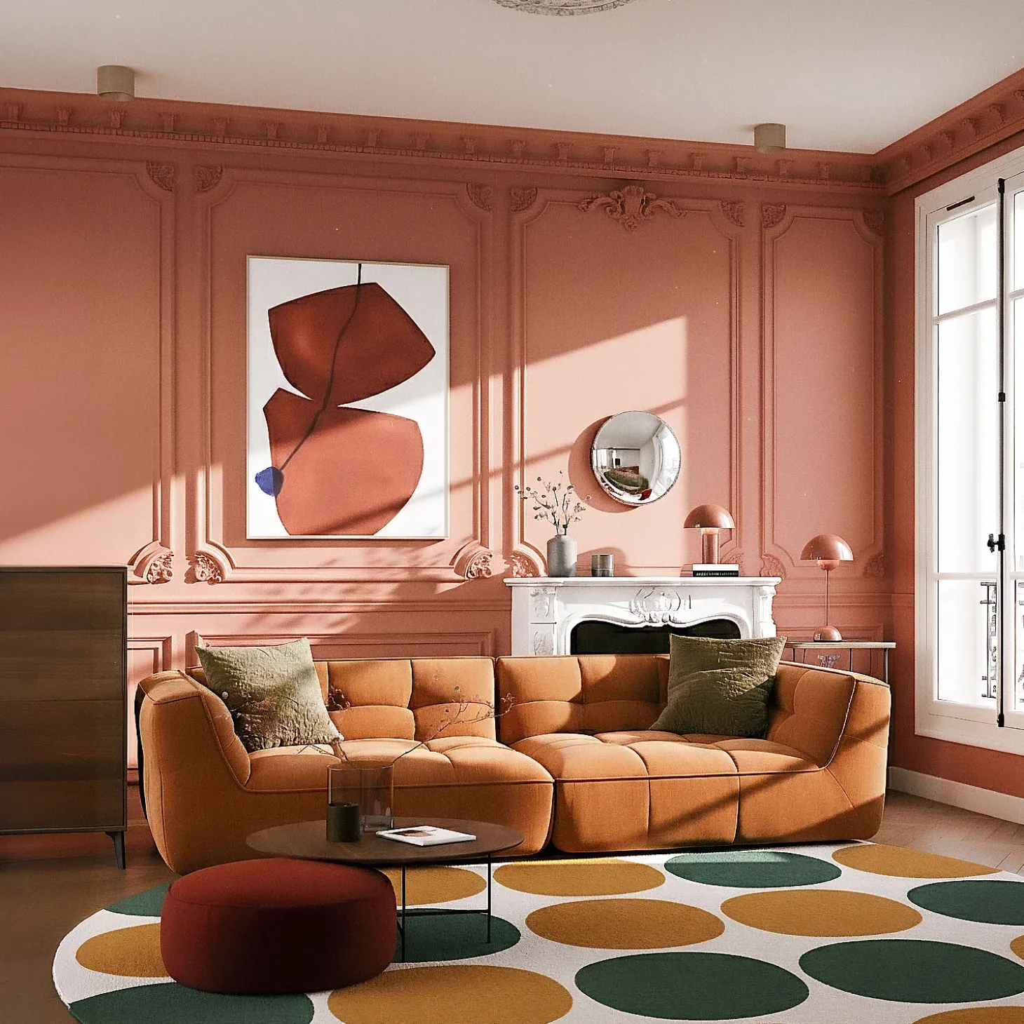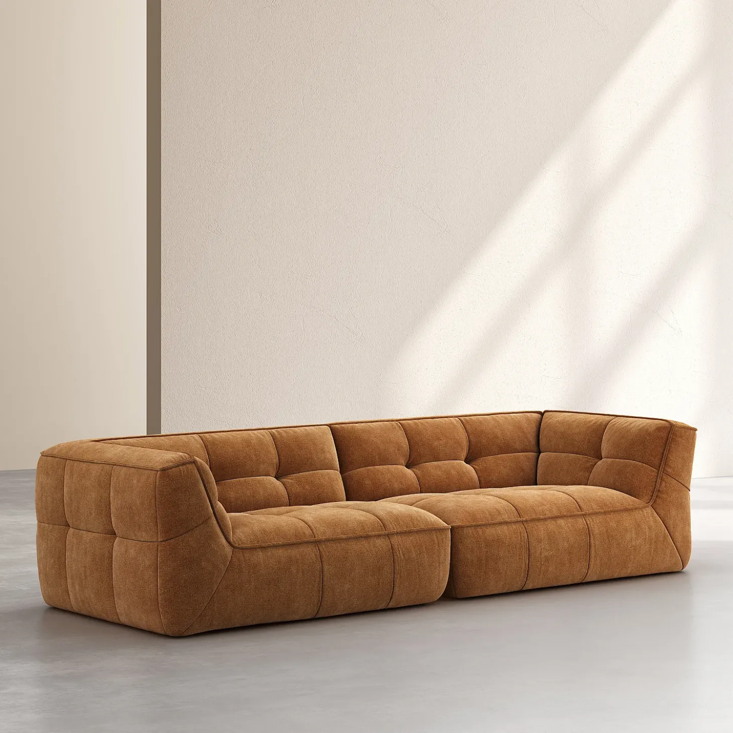 Ce modèle au design raffiné est recouvert d’un tissu ocre, il dégage une atmosphère sophistiquée, lumineuse et contemporaine, apportant une touche de chaleur et de caractère à l’espace.