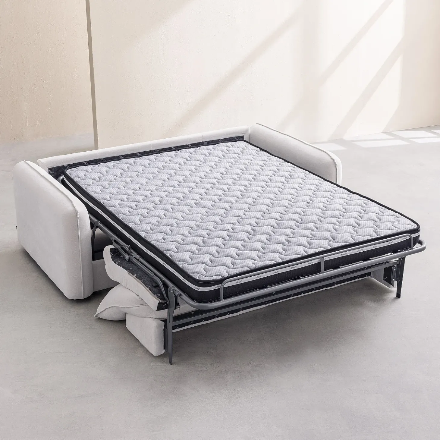 Il dissimule un couchage de 140 x 200 cm avec un matelas de 13 cm d’épaisseur, pensé pour offrir le confort d’un vrai lit au quotidien.