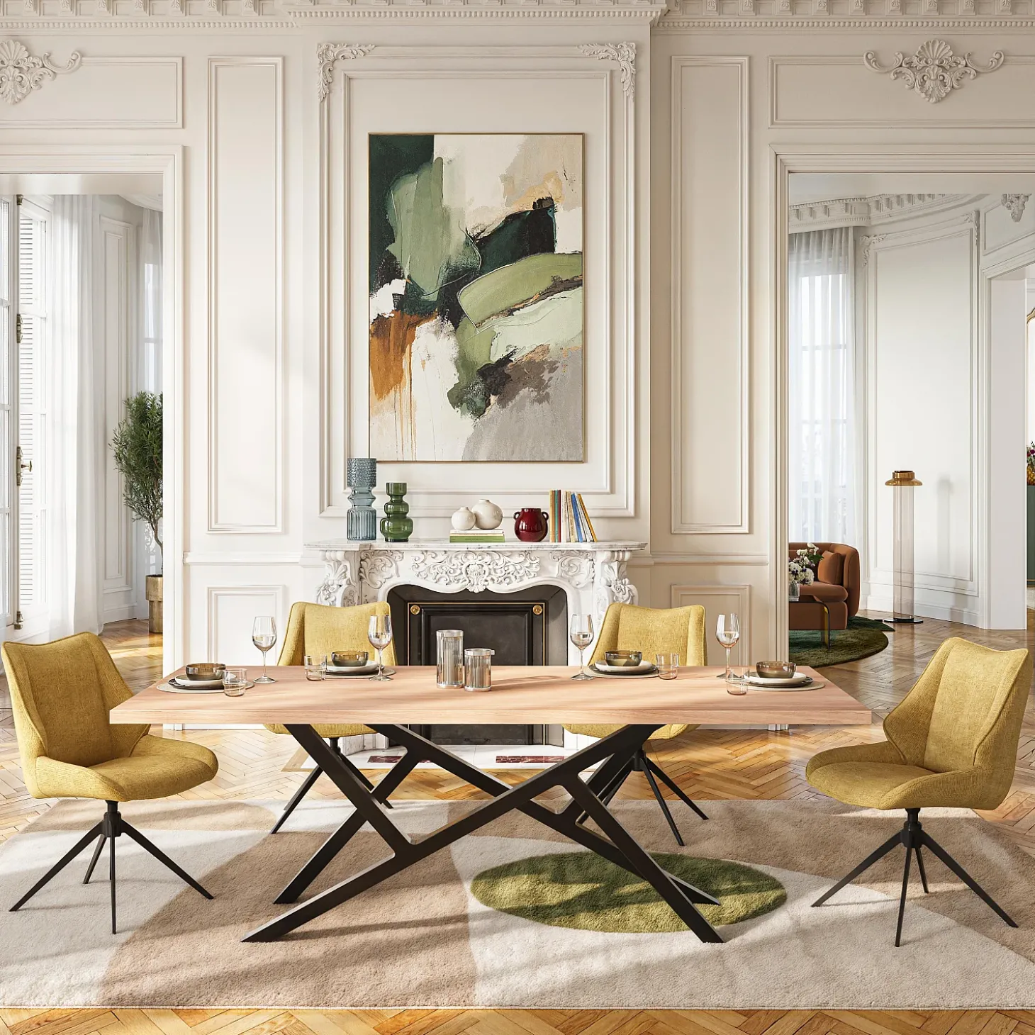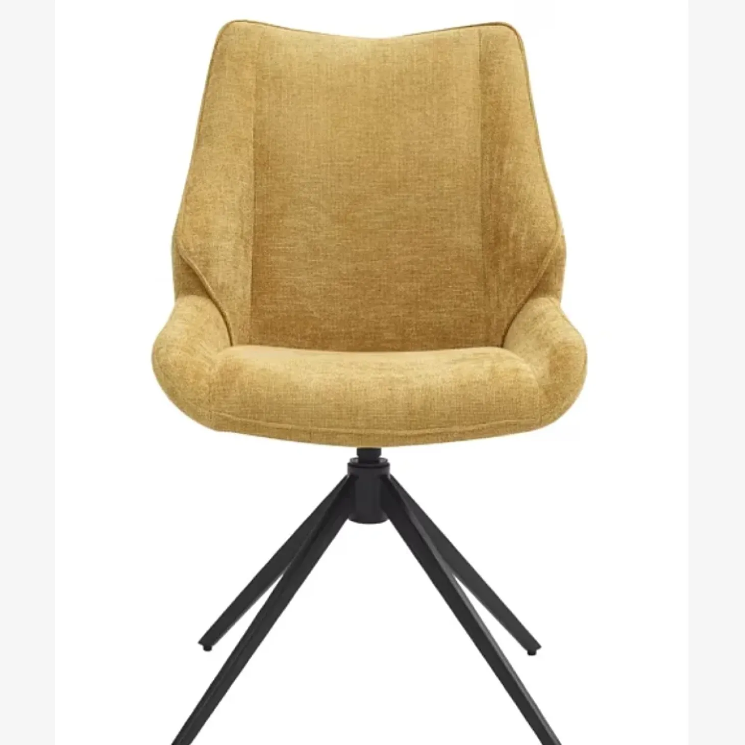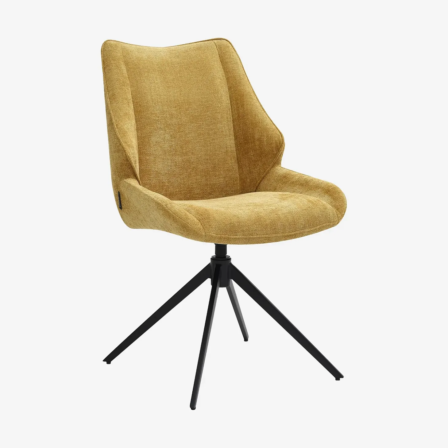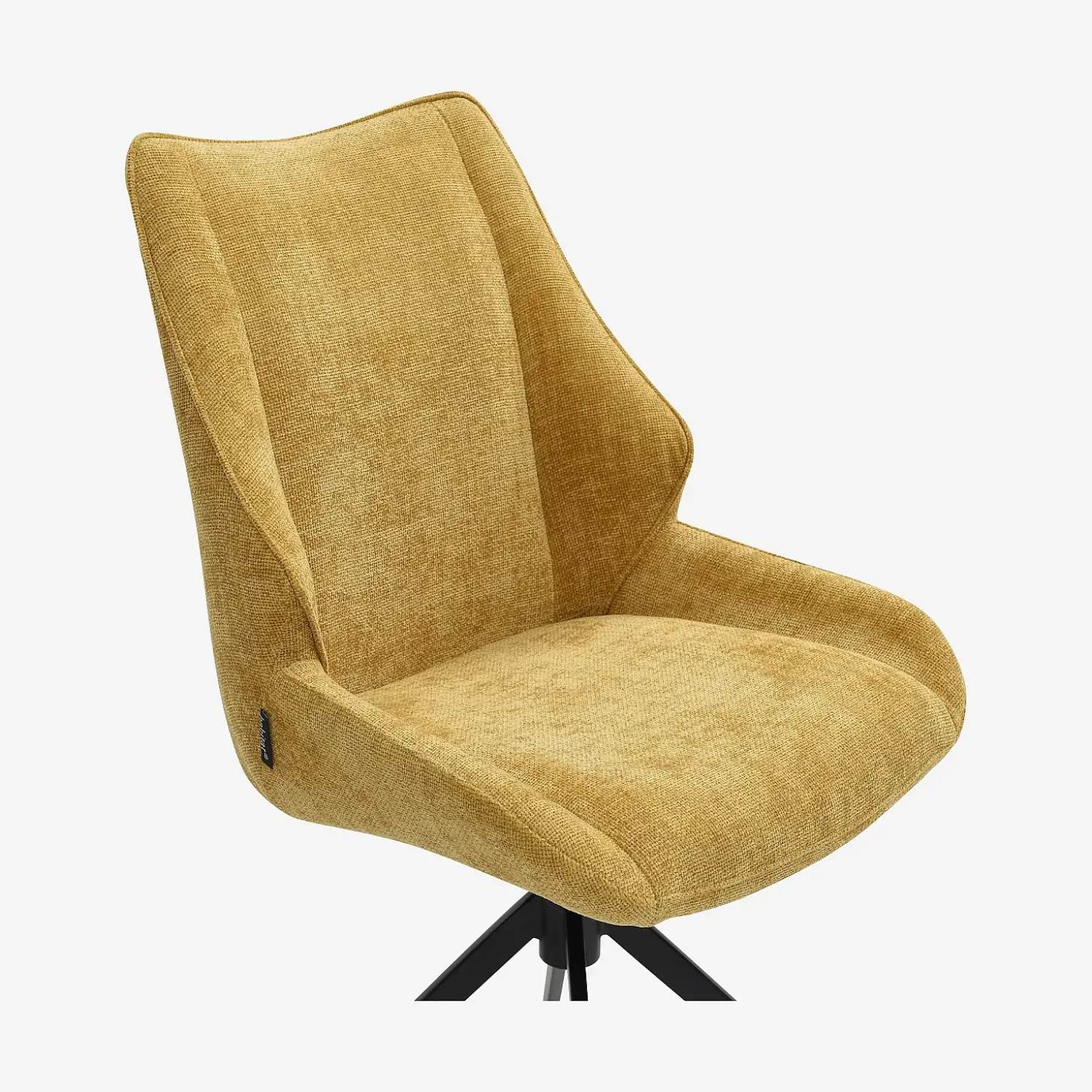 Leur revêtement en tissu chenille, au toucher doux et à l’aspect subtilement texturé, est mis en valeur par une teinte miel chaleureuse. Ce coloris lumineux souligne l’élégance de la chaise tout en apportant une note solaire à la pièce.