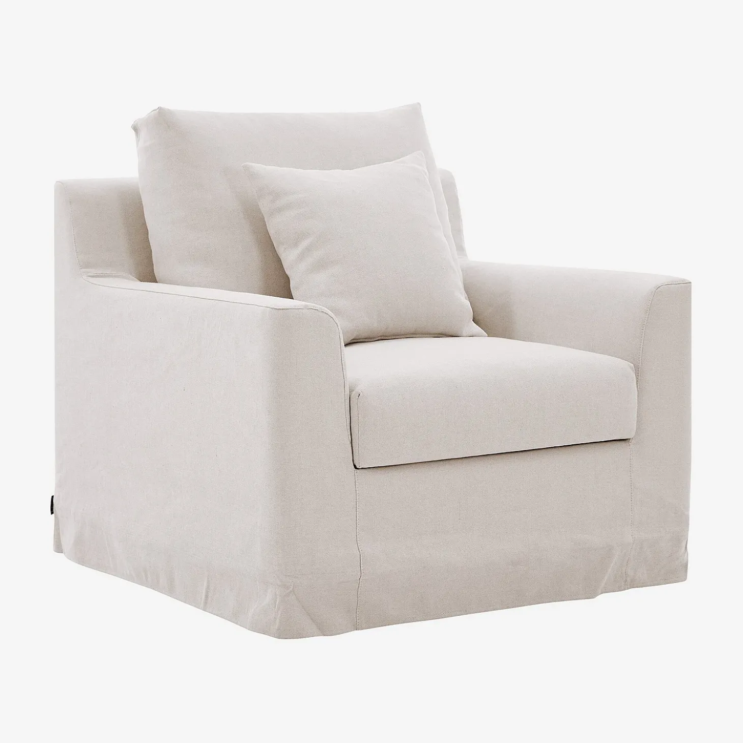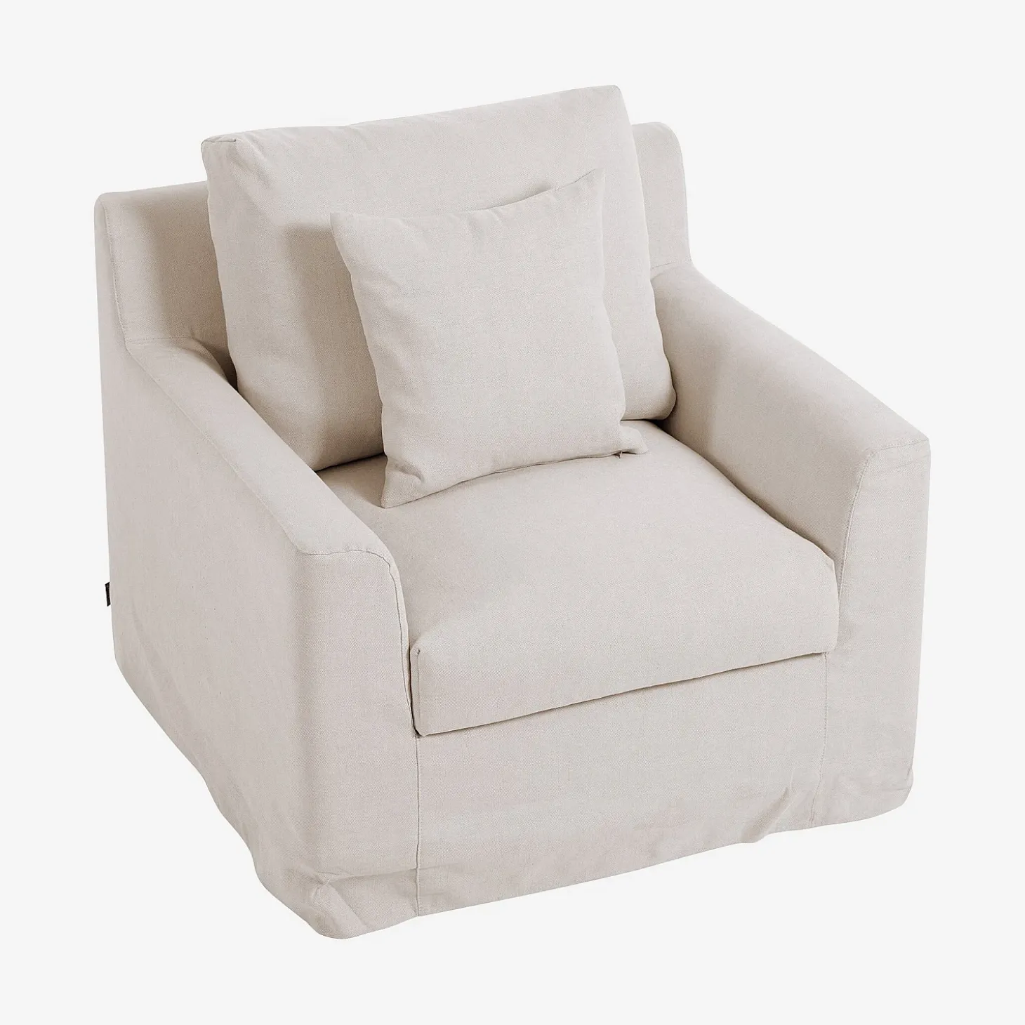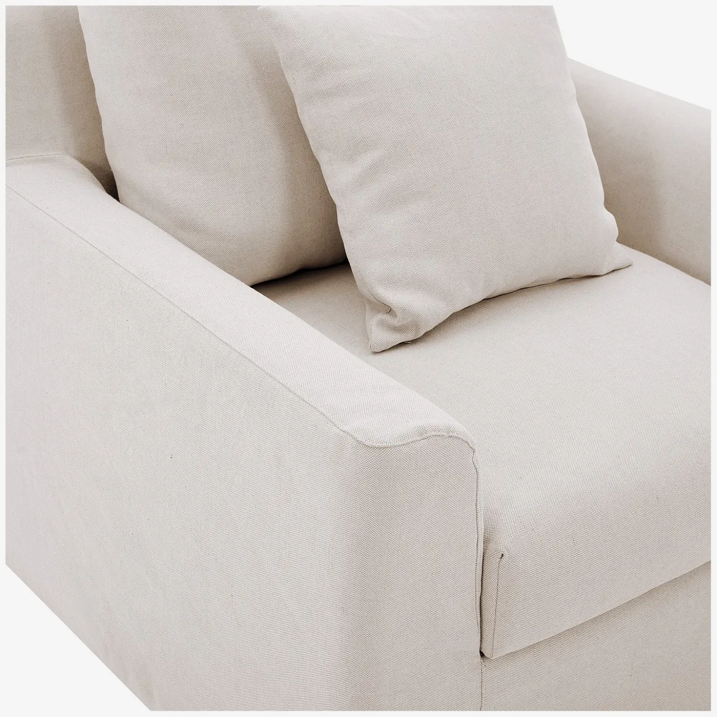 Son garnissage moelleux assure un confort enveloppant, idéal pour s’accorder une parenthèse de repos. Habillé d’un tissu en coton et lin, il présente une texture douce et légèrement irrégulière, qui renforce son charme brut et décontracté. Sa couleur sable blanc s’intègre avec simplicité dans de nombreuses ambiances en apportant luminosité et douceur.