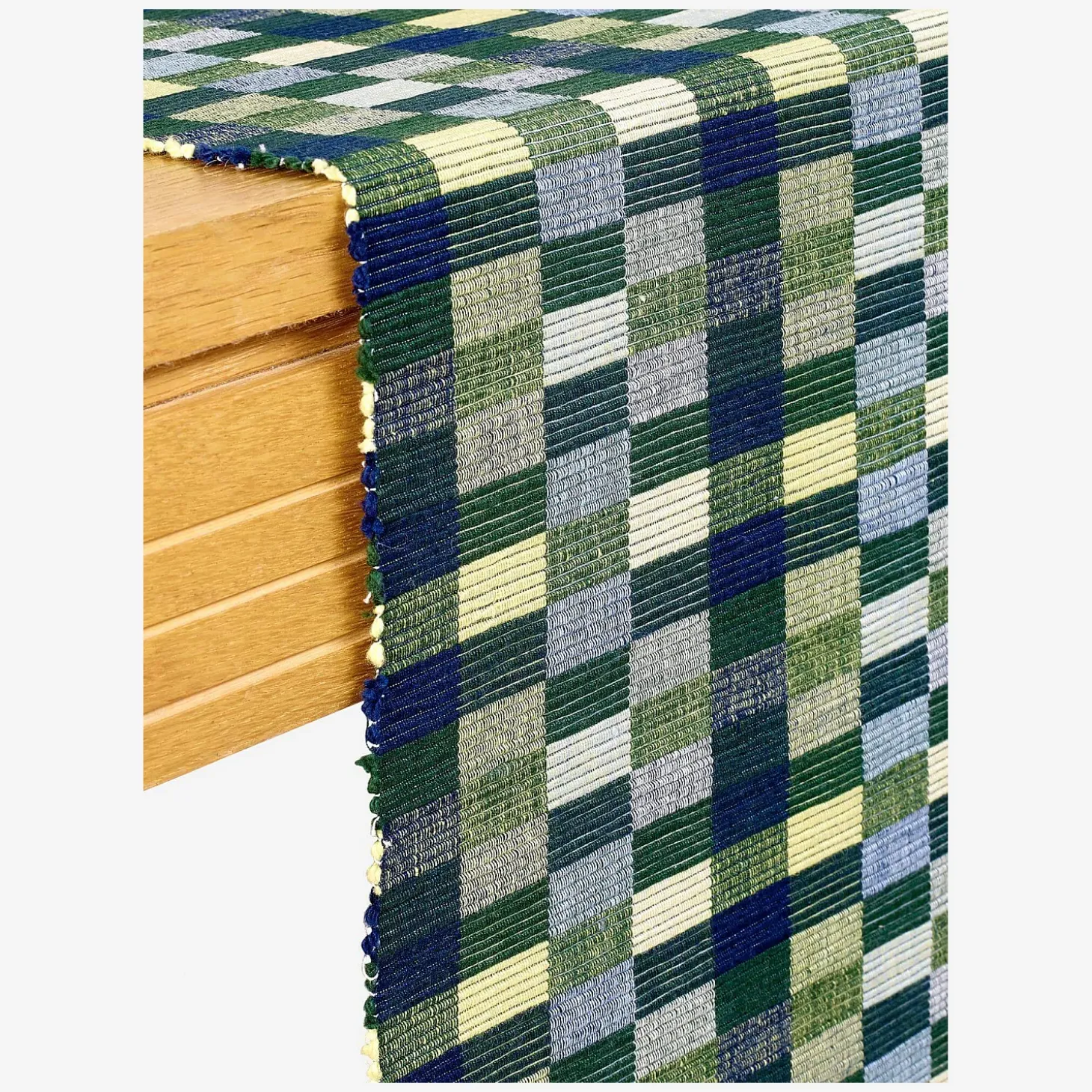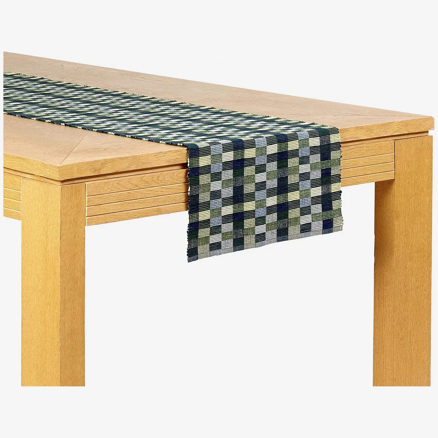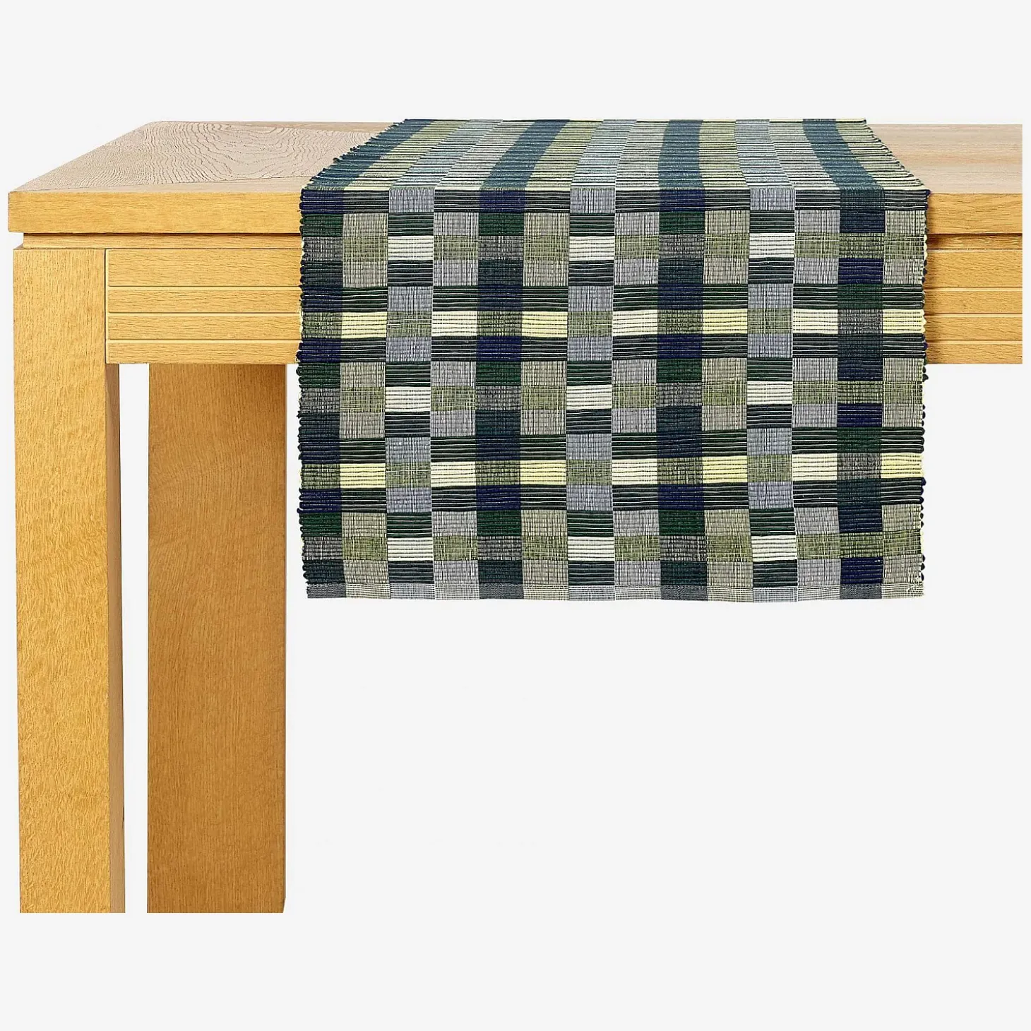 Le lot de deux travers de table Otman est en 100% coton. De dominante verte, son motif se compose de lignes et de rectangles imbriqués.