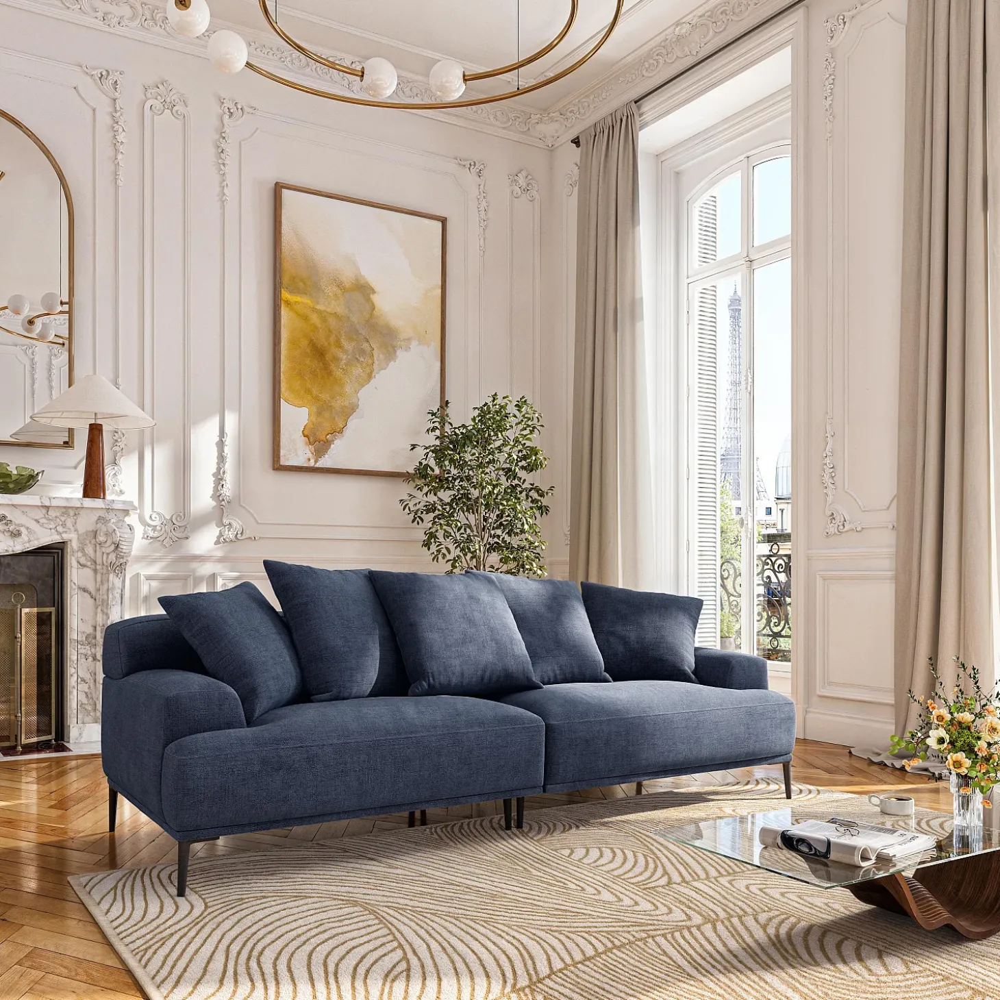 Le canapé 3 places Ottone II en coton et lin se décline en bleu afin d’apporter une note de couleur discrète et apaisante au salon.