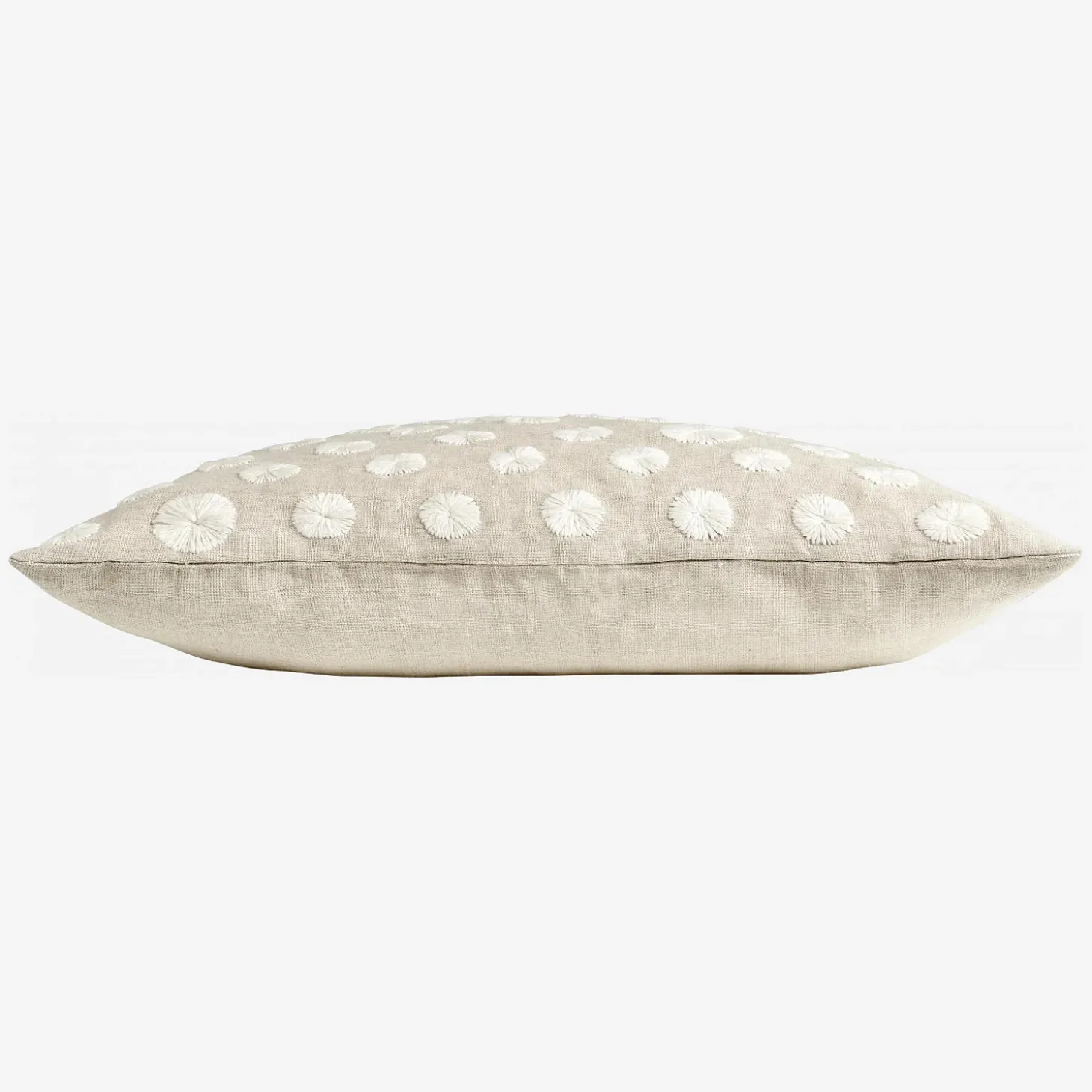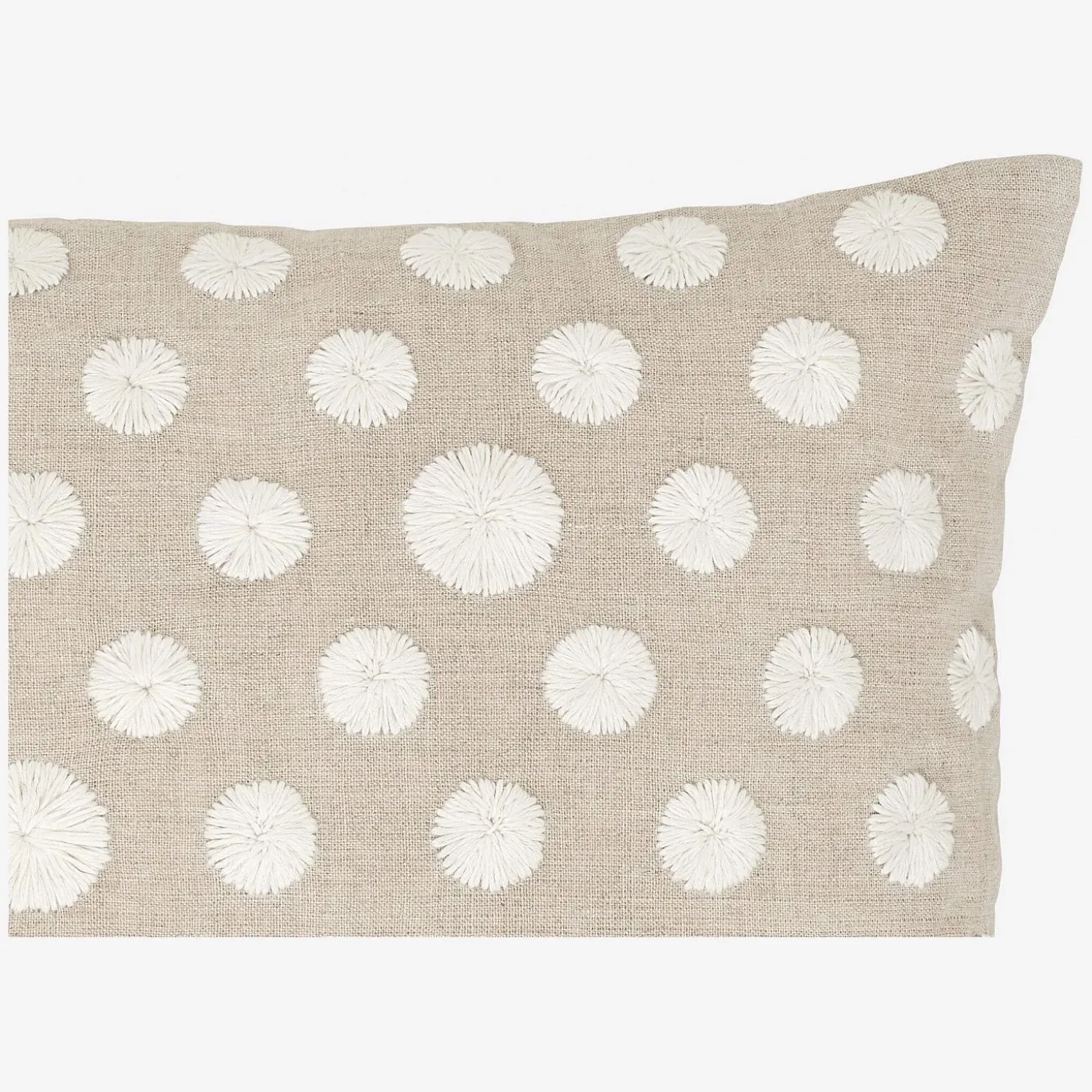 Padoue est un coussin inspiré de la nature. Sa toile de lin est parsemée de fleurs blanches brodées.