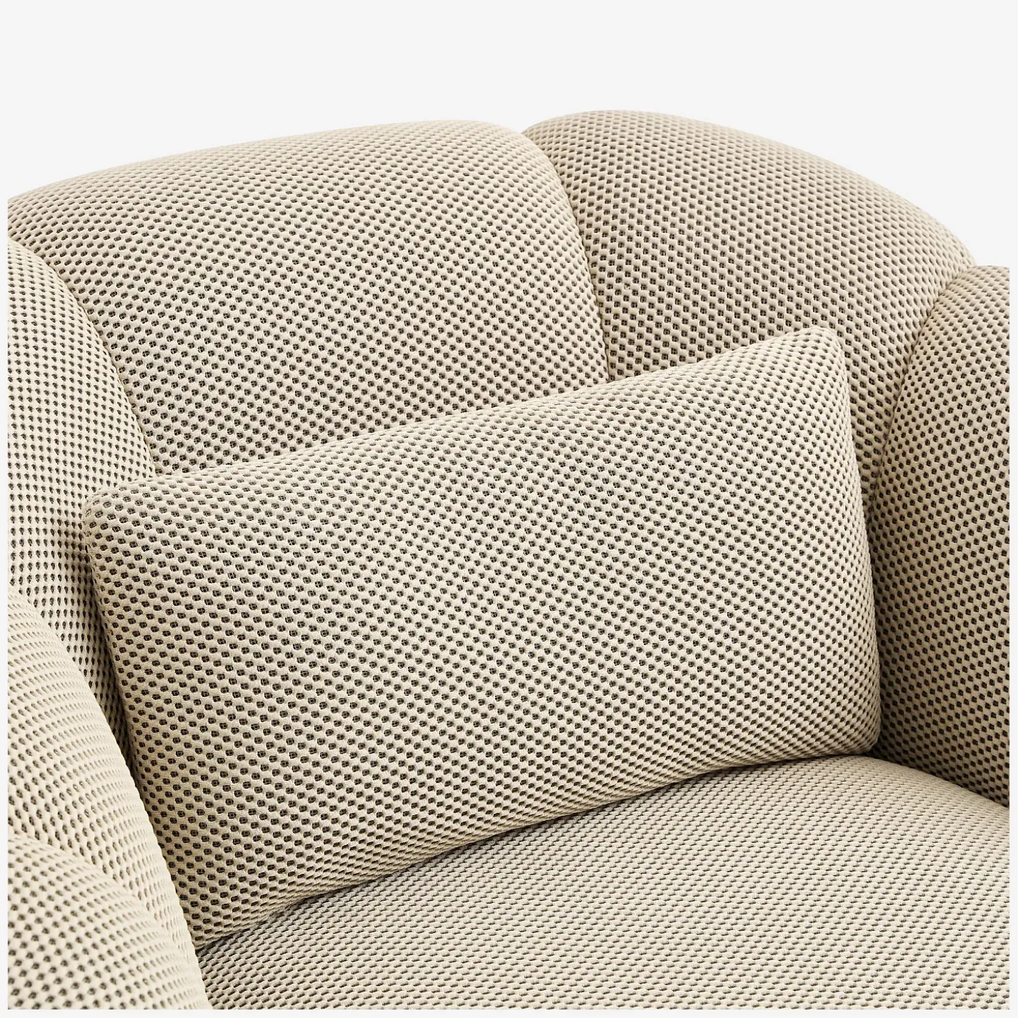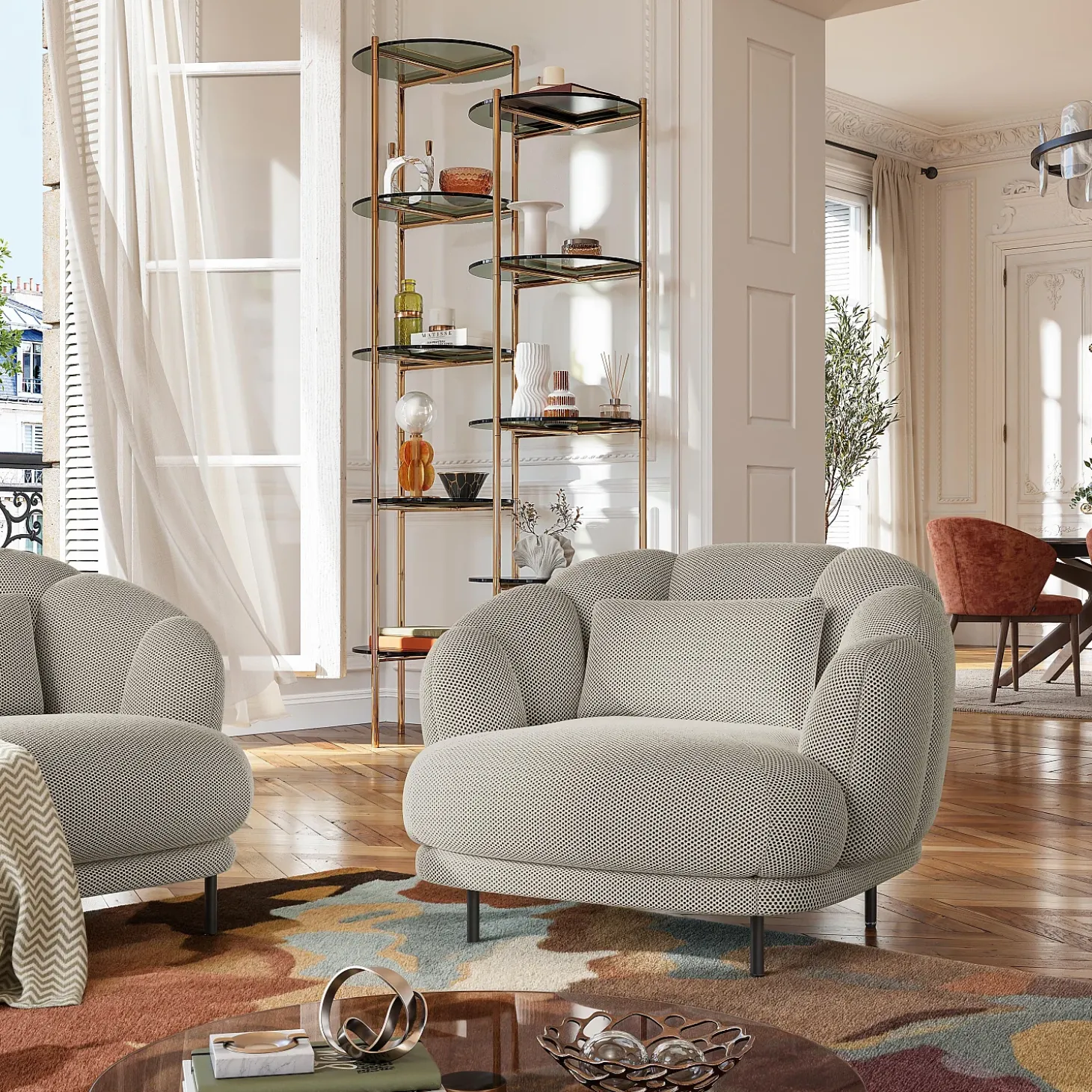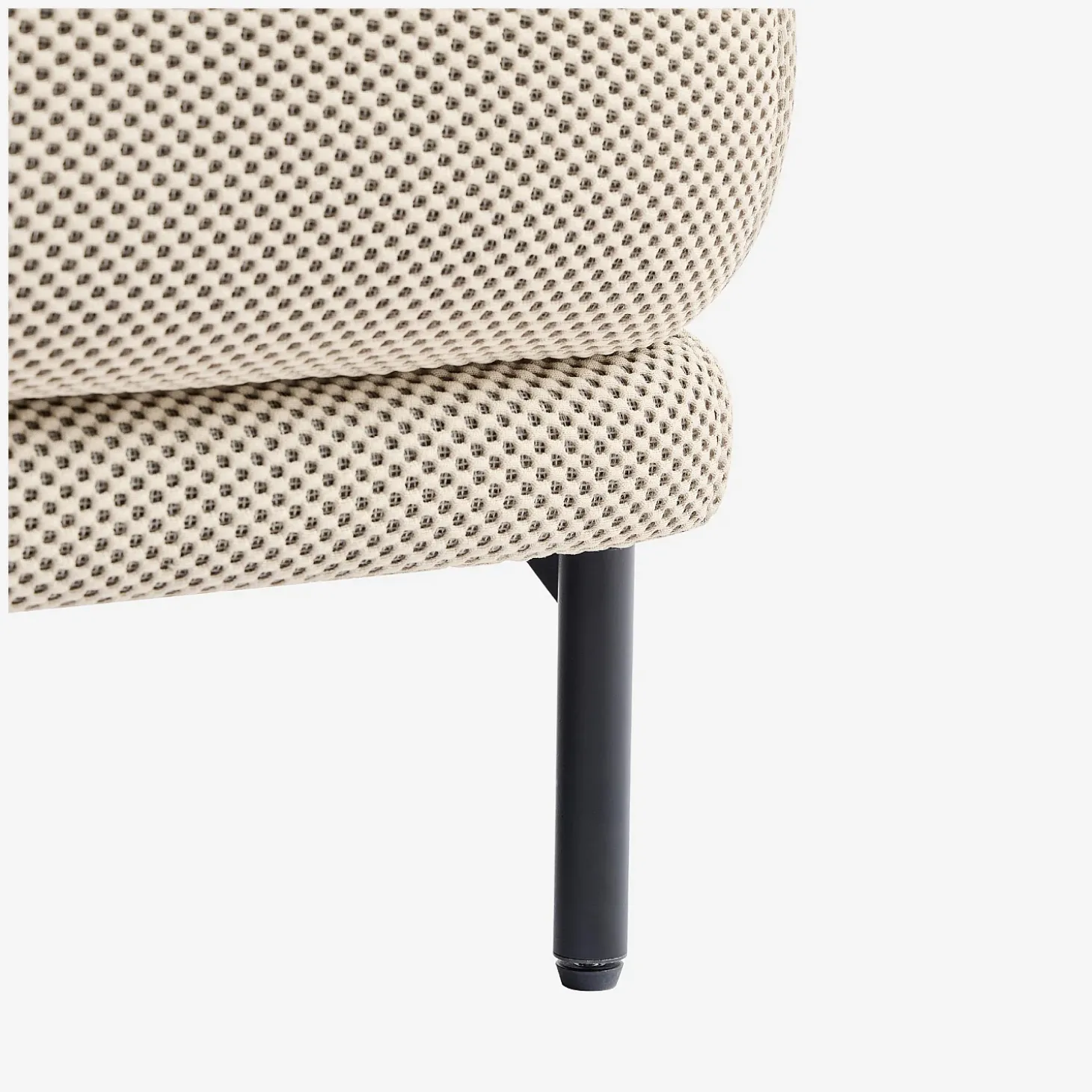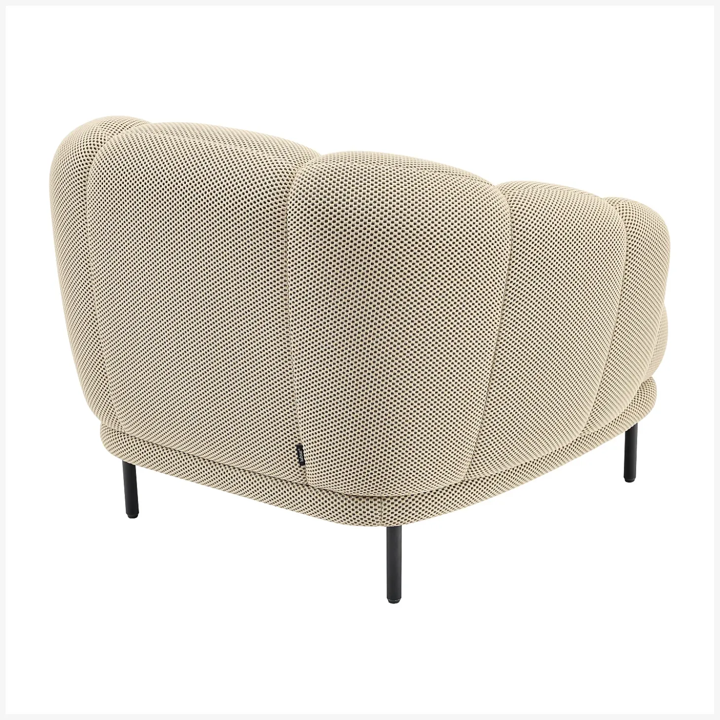 Le fauteuil Paraty en tissu 3D est sublimé par un piètement fin et délicat en métal noir mat, lui conférant une élégance aérienne. La douceur de sa teinte sable réchauffe l’atmosphère pour un ensemble apaisant, renforcé par son coussin assorti.