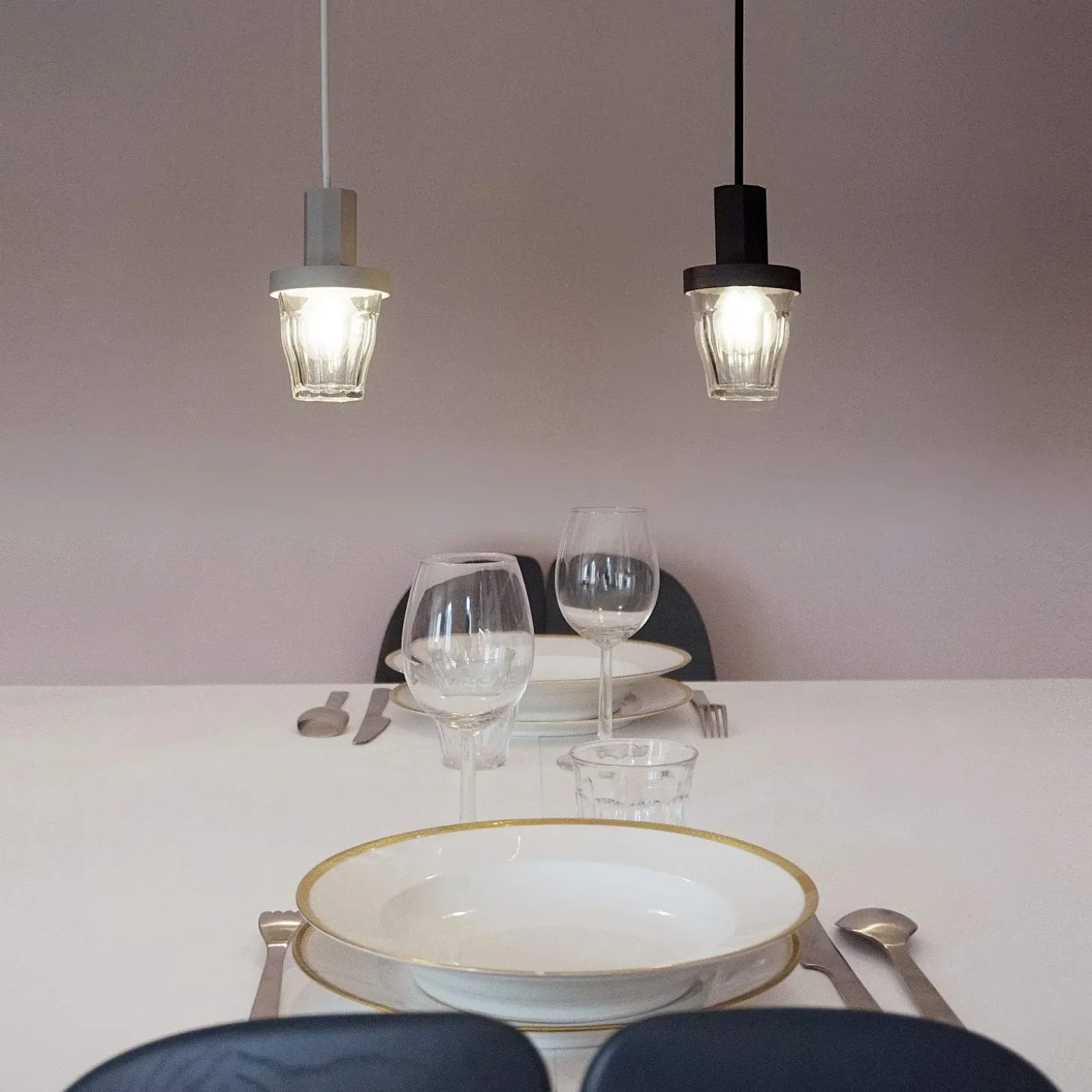 En verres de la marque Duralex, modéle Picardie et accessoire en TPE (caoutchouc thermoplastique) injecté, câble électrique avec gaine silicone, douille E14 et serre-cables en plastique.La suspension en verre Picardie revisite l’iconique verre Duralex en un luminaire élégant.