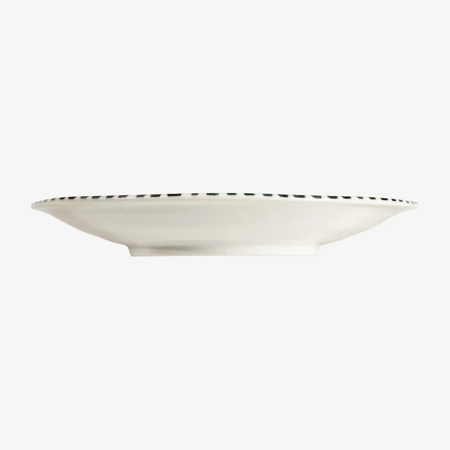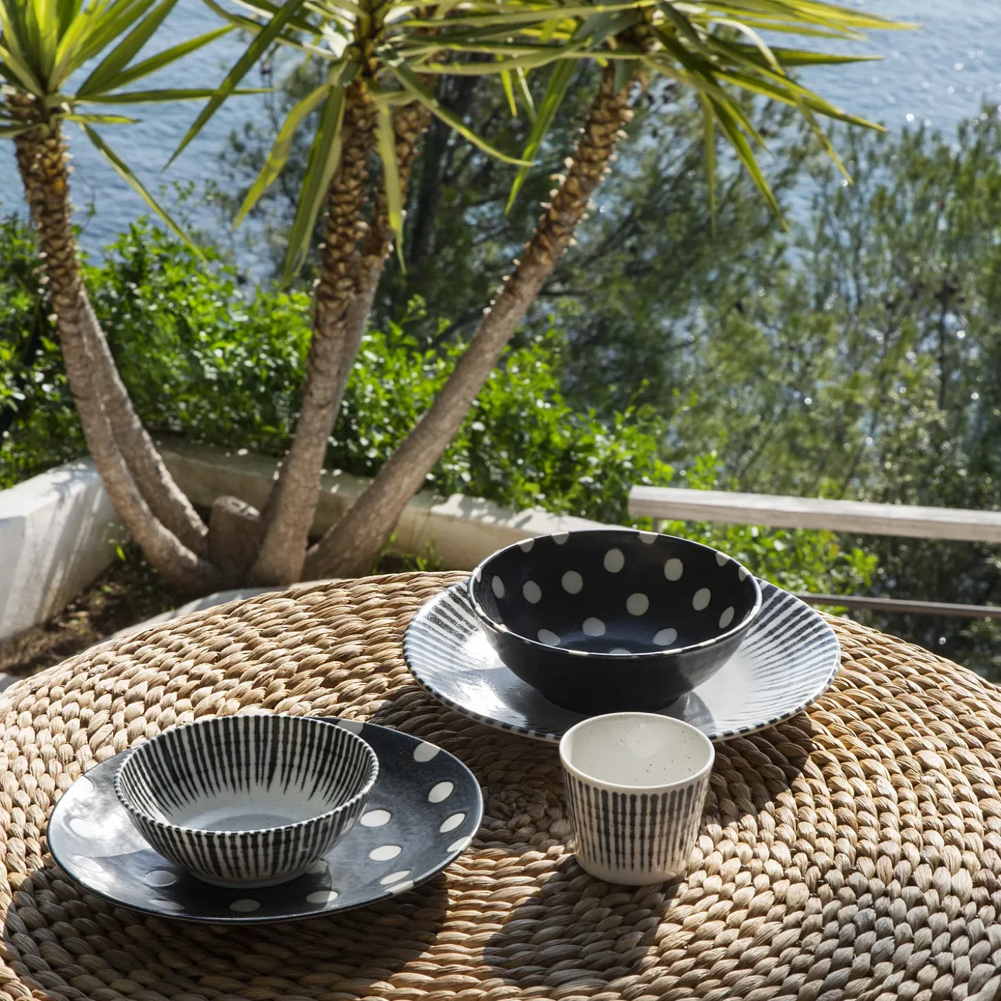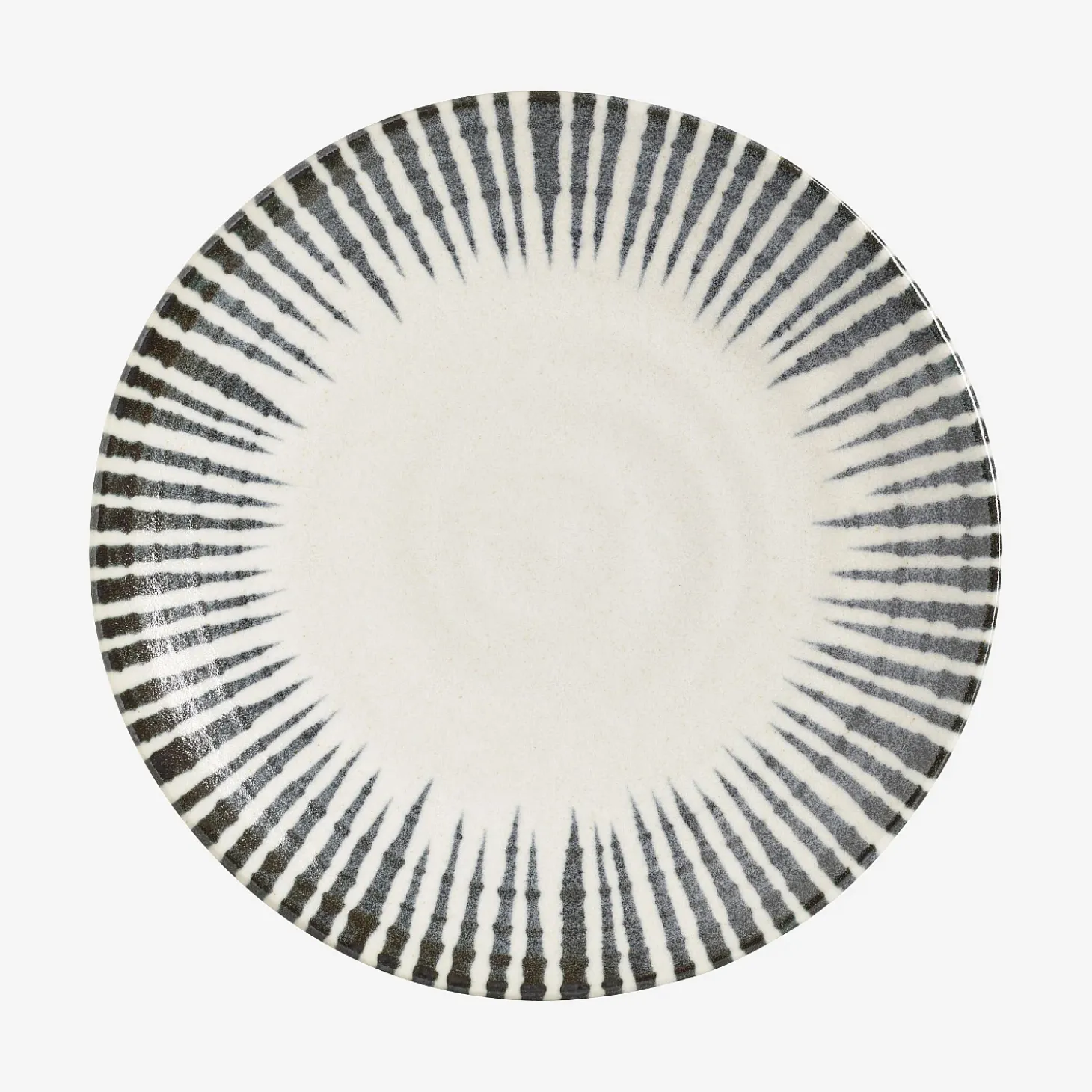 L’assiette plate Pinako en porcelaine mesure 26 cm de diamètre. Son motif à lignes bleues a été appliqué au tampon.