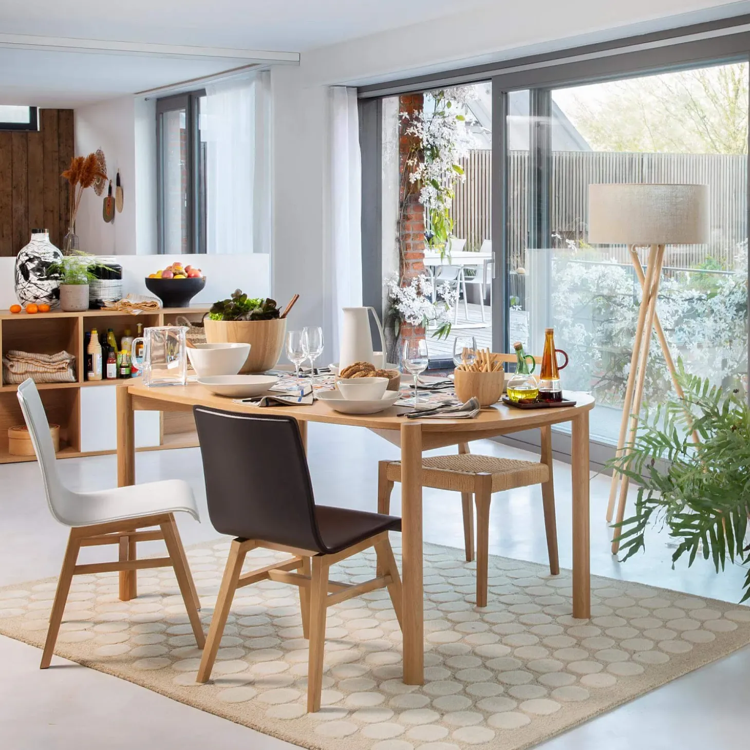 Cette chaise existe dans différentes finitions, pour être associée à une table en chêne, en verre ou en céramique.