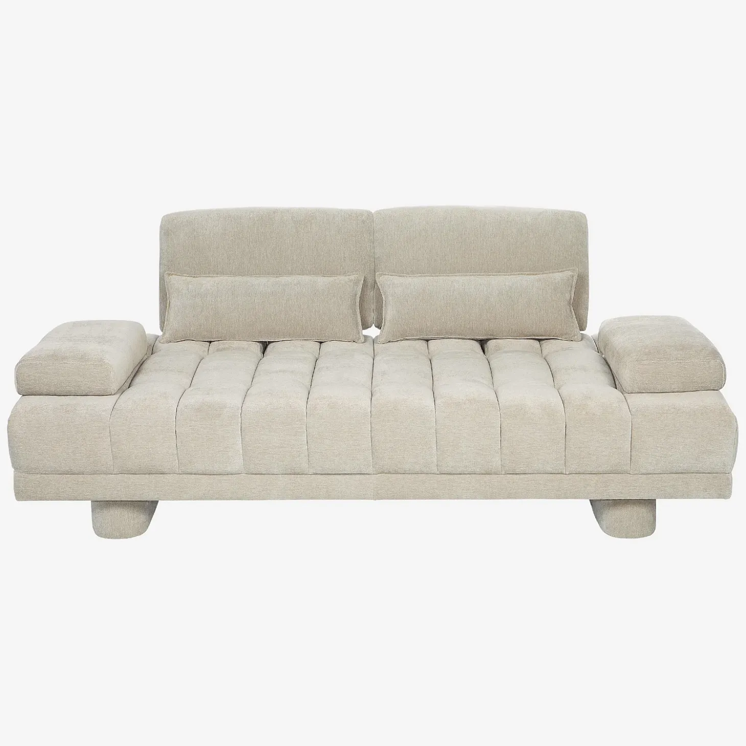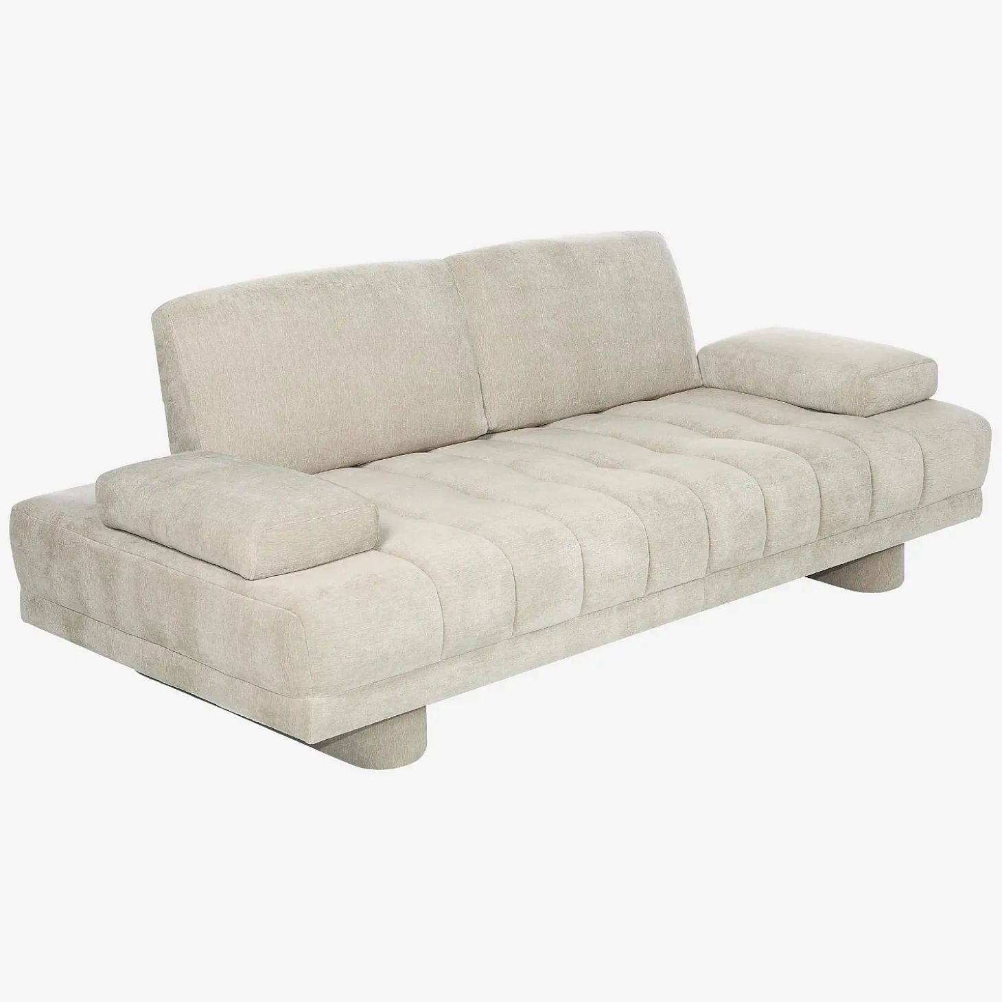 L’allure épurée de ce canapé, avec une assise à la fois matelassée et capitonnée, crée un espace de détente raffiné. Sa silhouette unique, aux pieds à l’allure innovante, se démarque des modèles plus classiques.