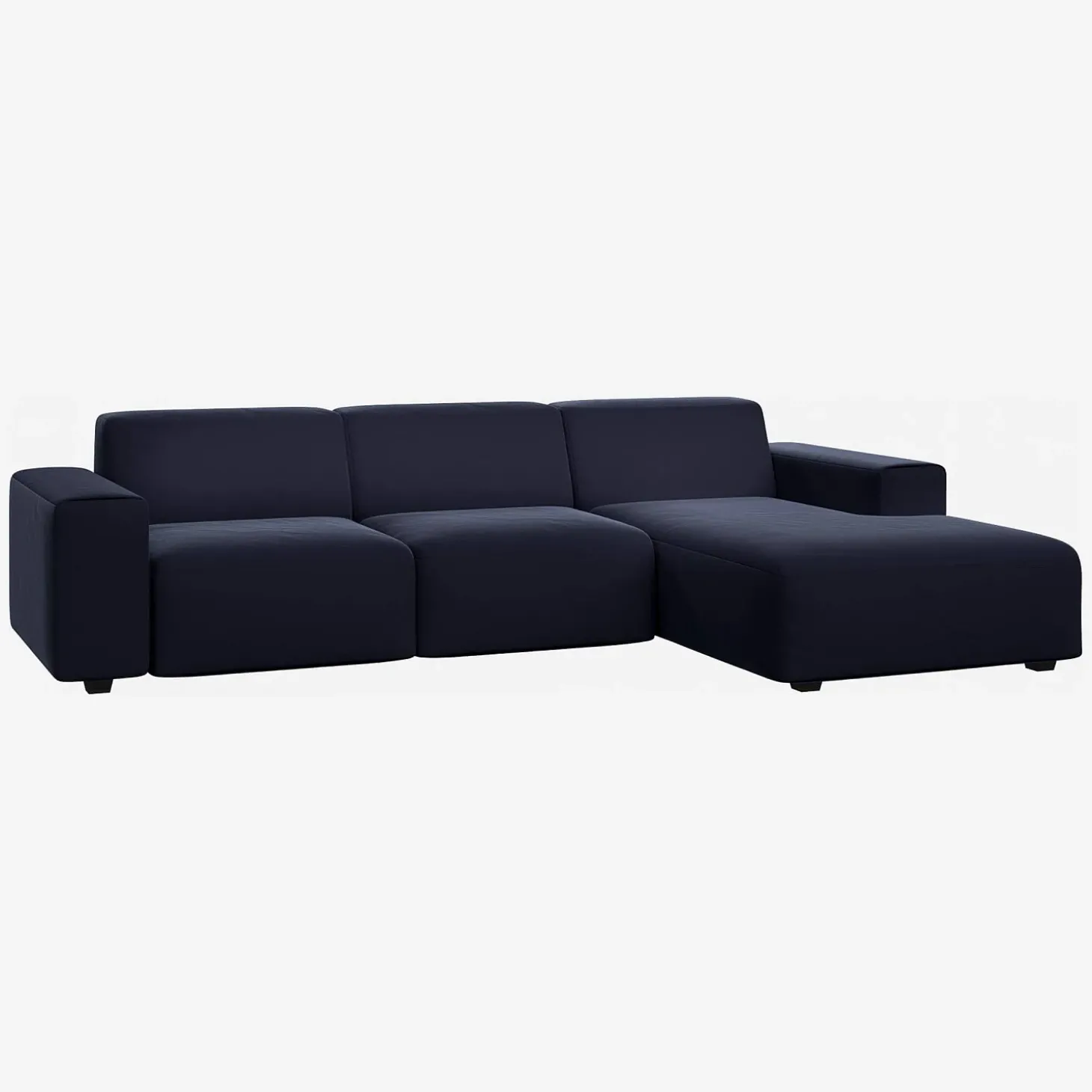 Le canapé d’angle droit Posada en velours bleu encre est un canapé d’une grande élégance. Son design soigné se retrouve dans ses coutures et les finitions en ourlet de ses accoudoirs.