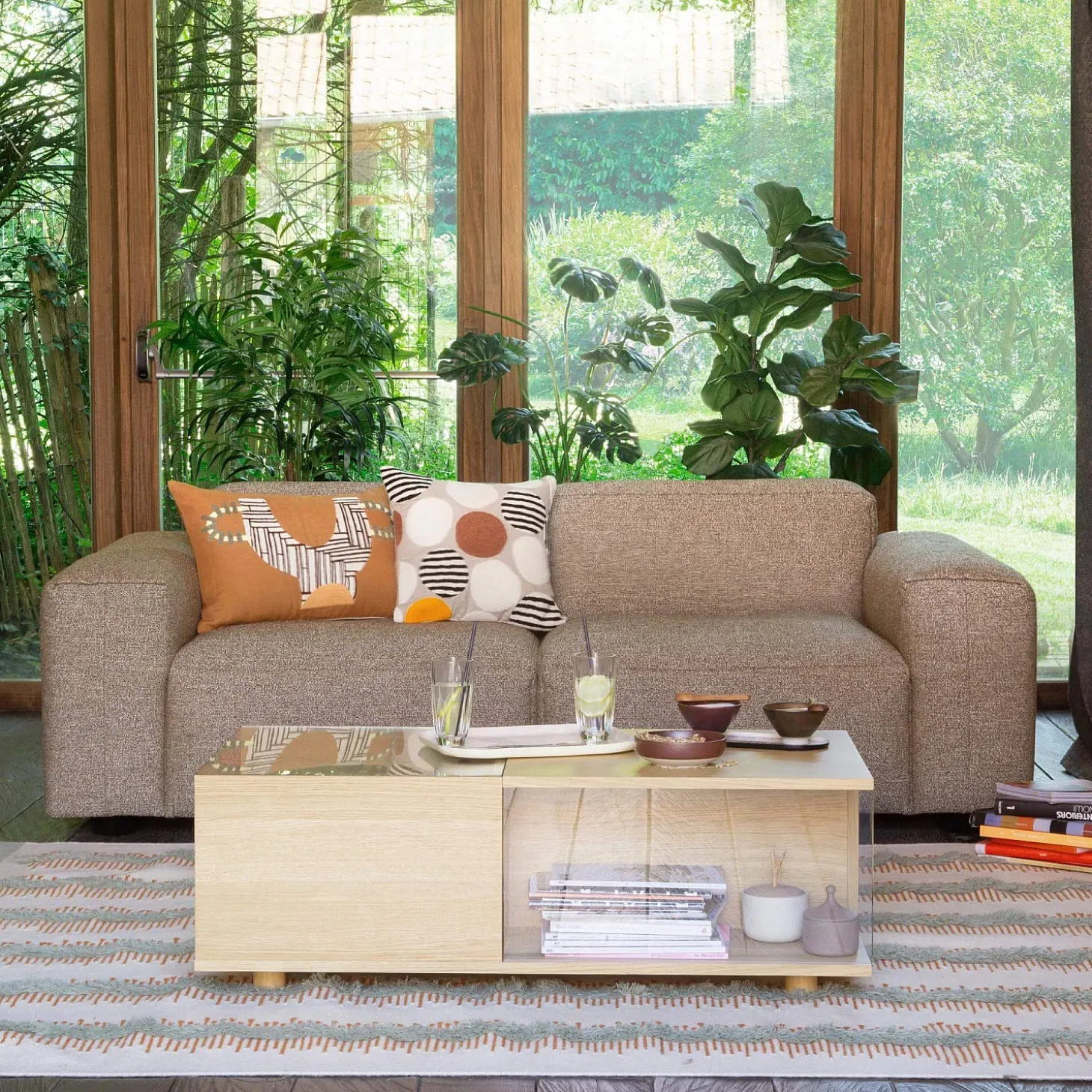 Disponible ici en tissu Venezia vert lichen , il existe aussi en différents coloris et d’autres revêtements. Le tissu Venezia est un textile exclusif Habitat, composé de polyester, de viscose, de coton et de lin.