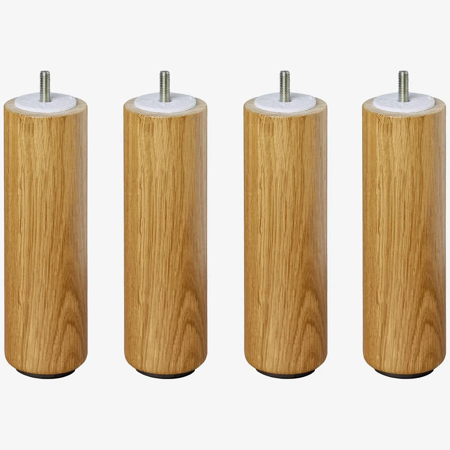 Ce set se compose de 4 pieds de lit de forme cylindrique en bois de chêne. Ces pieds mesurent 6,2 cm de diamètre et 16 cm de hauteur.