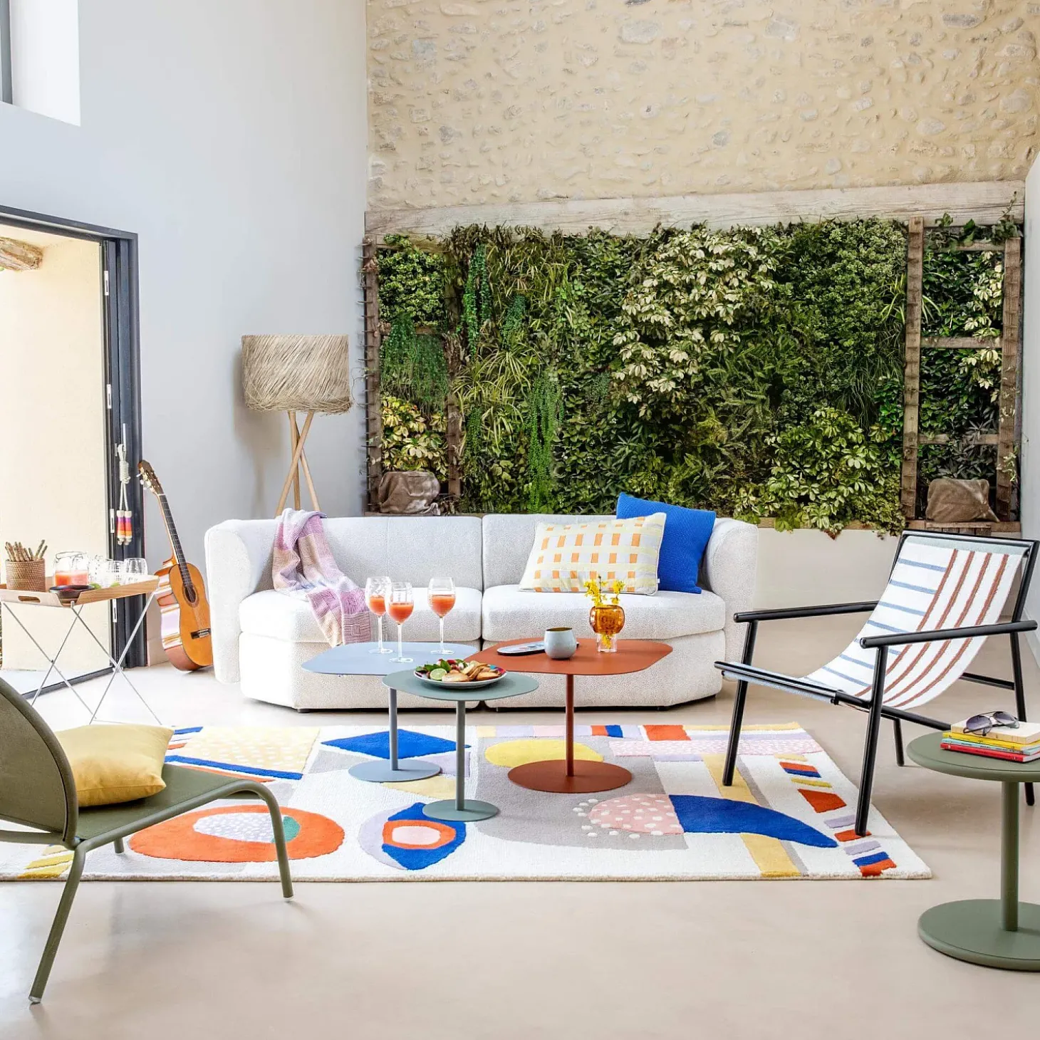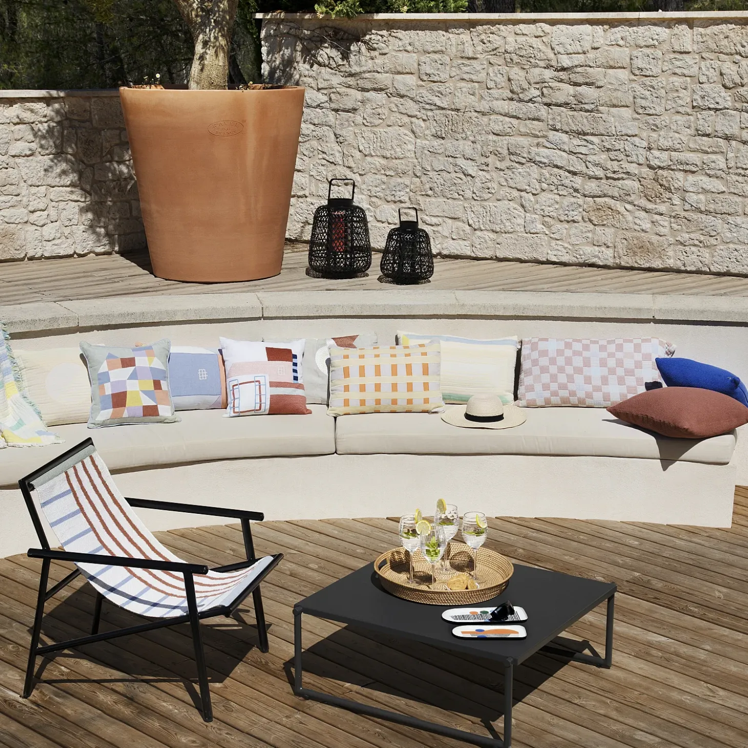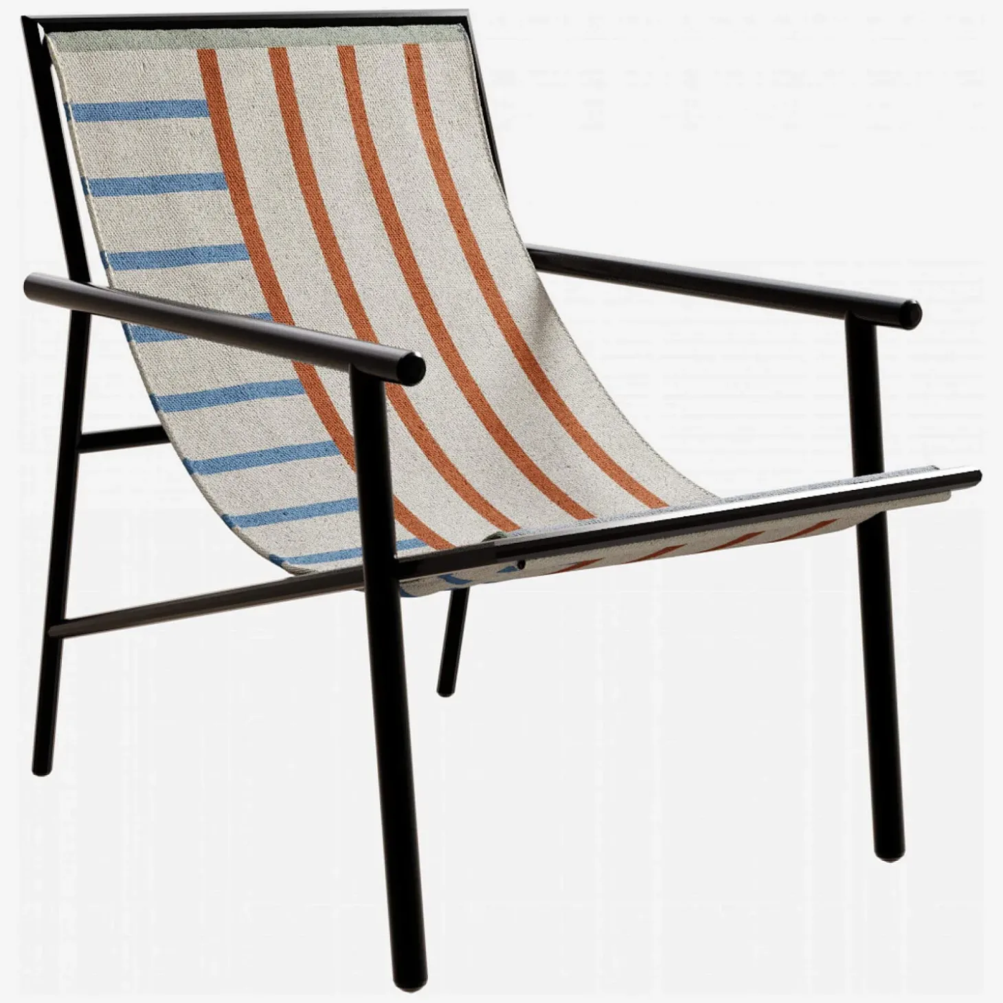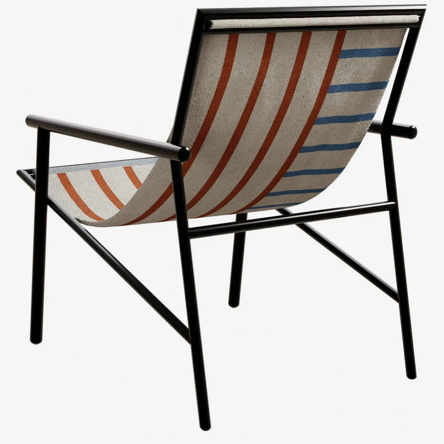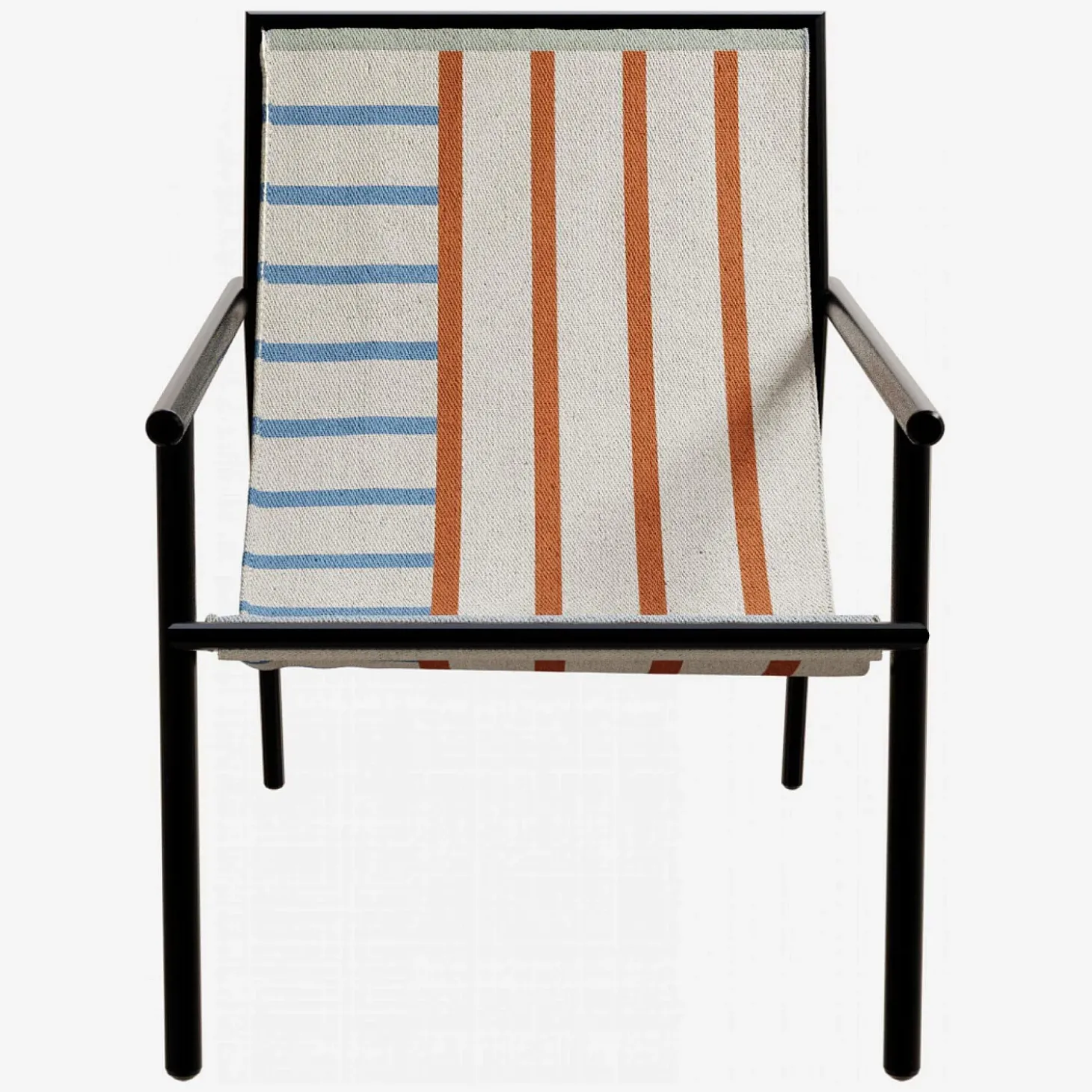 Cette assise se compose d’une structure en métal noire et d’une toile tendue en coton. Cette dernière se pare d’un motif exclusif, signé Floriane Jacques, graphiste au sein du Habitat Design Studio. Il met en scène un jeu de lignes colorées et intemporel pour intégrer en douceur tous les styles de décoration.