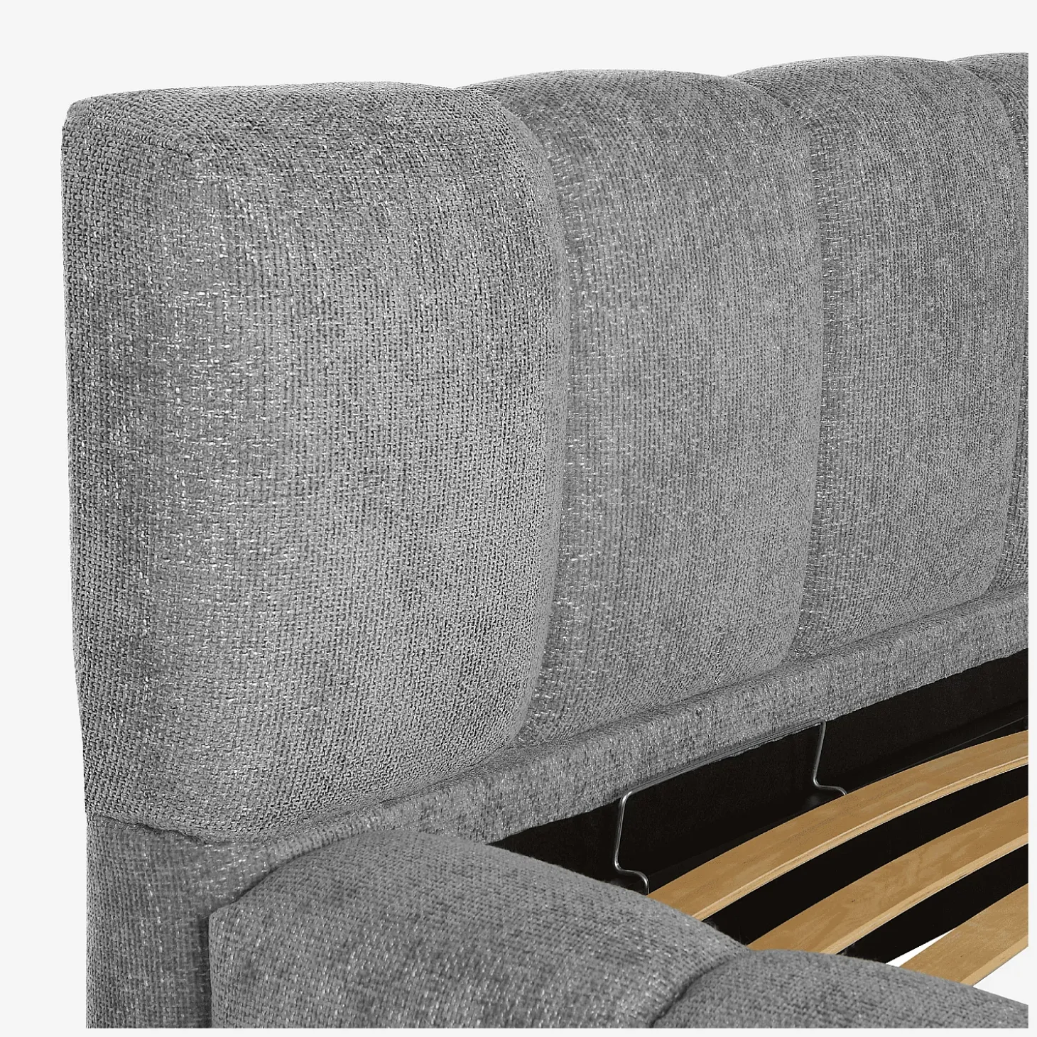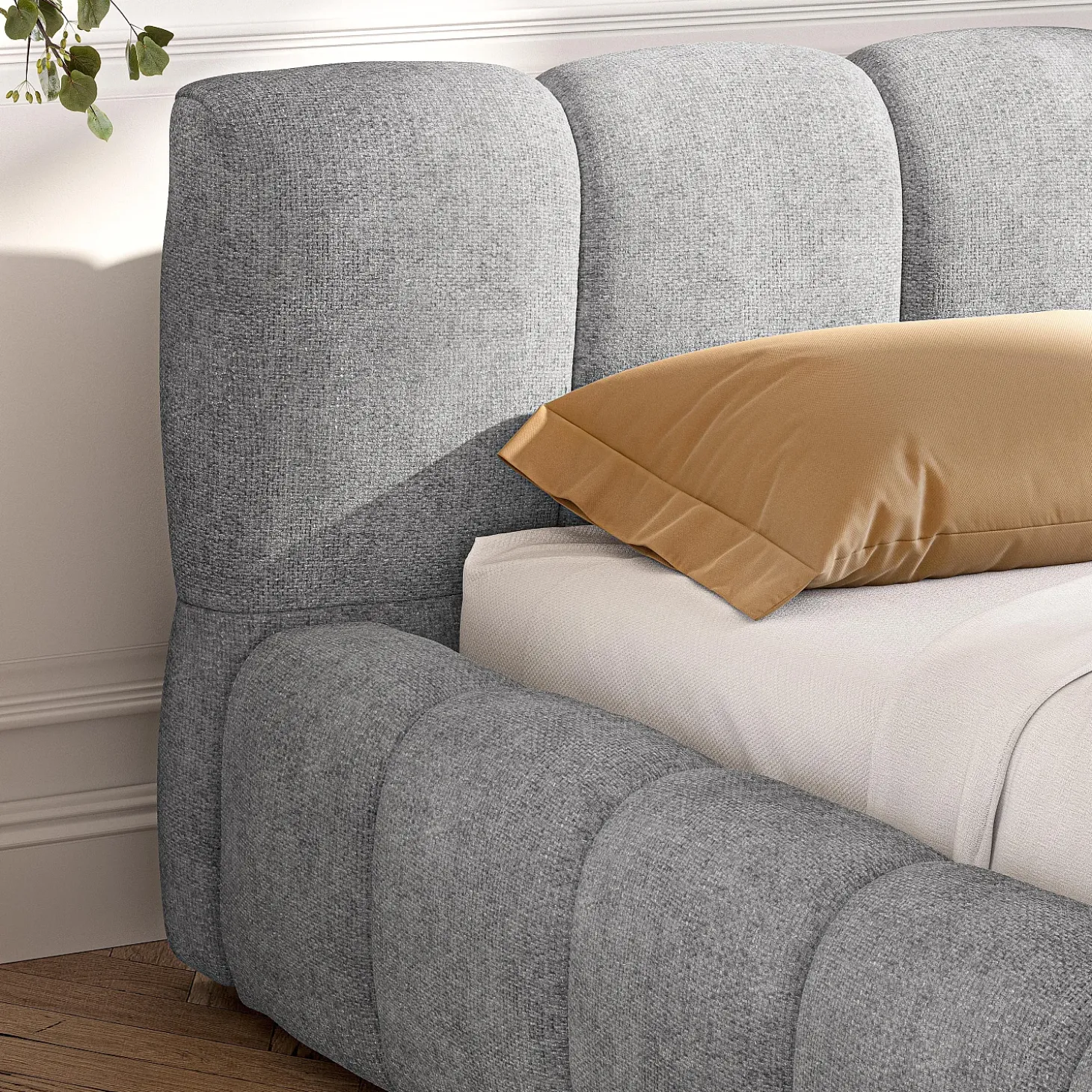 Véritable cocon, sa tête de lit garnie de mousse invite à s’y adosser pour profiter d’un moment de détente avant la nuit. Son revêtement en tissu chenille assure un toucher doux et délicat, sublimé d’une teinte gris galet intemporelle. L’effet monochrome se poursuit sur le cadre de lit, pour un ensemble contemporain assumé.