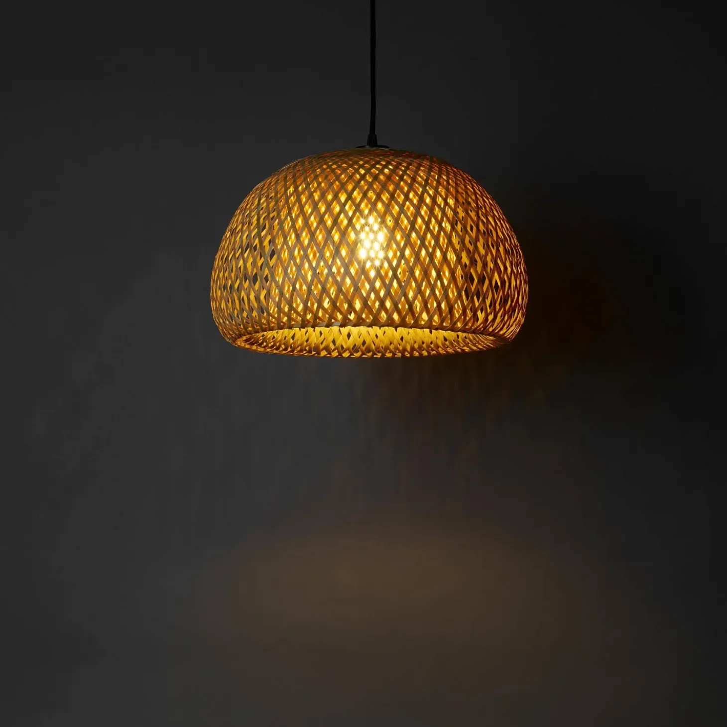 L’abat-jour pour suspension Sime en bambou mesure 40 cm de diamètre. Il se compose de deux cloches tressées à la main et imbriquées l’une dans l’autre pour un éclairage feutré et une ambiance chaleureuse.