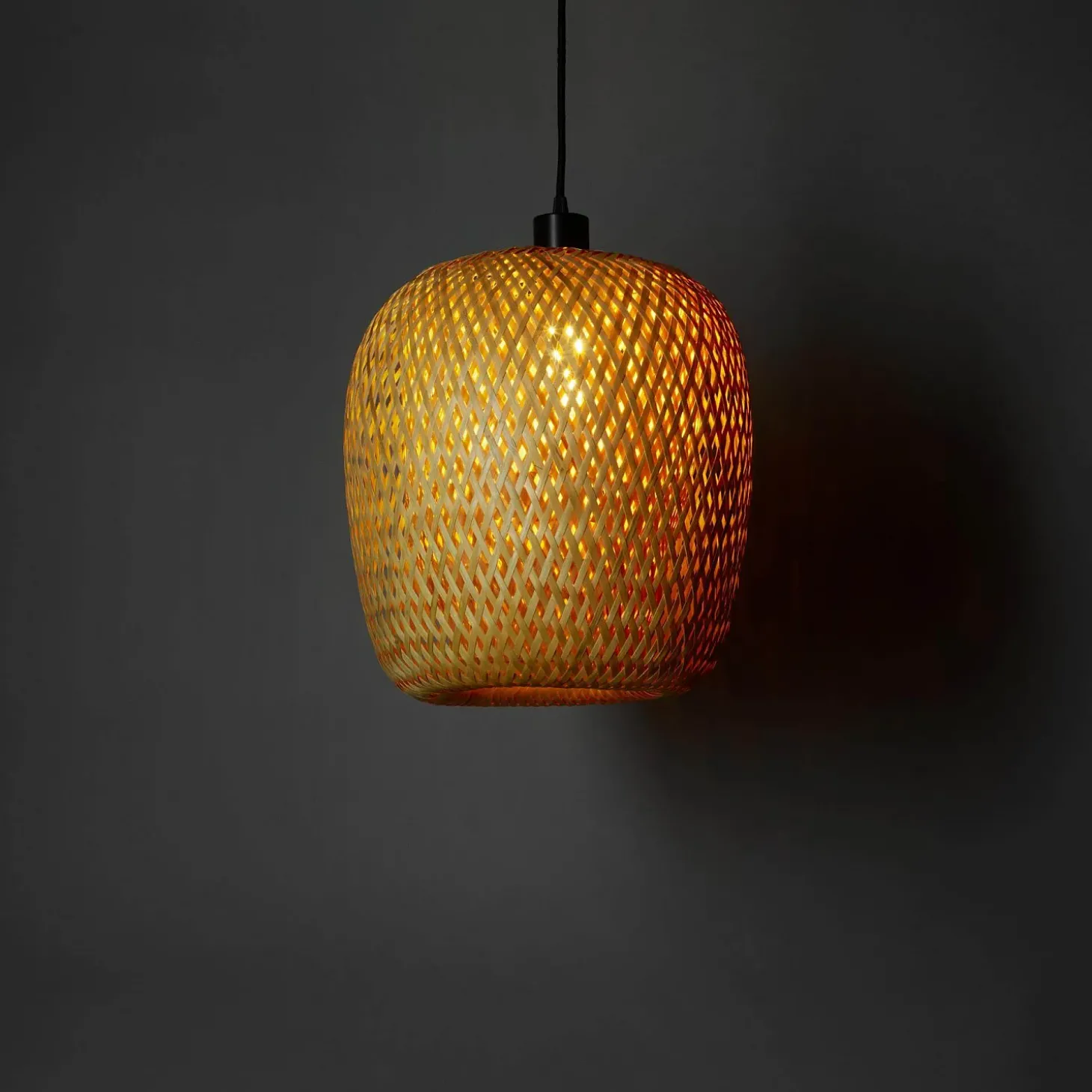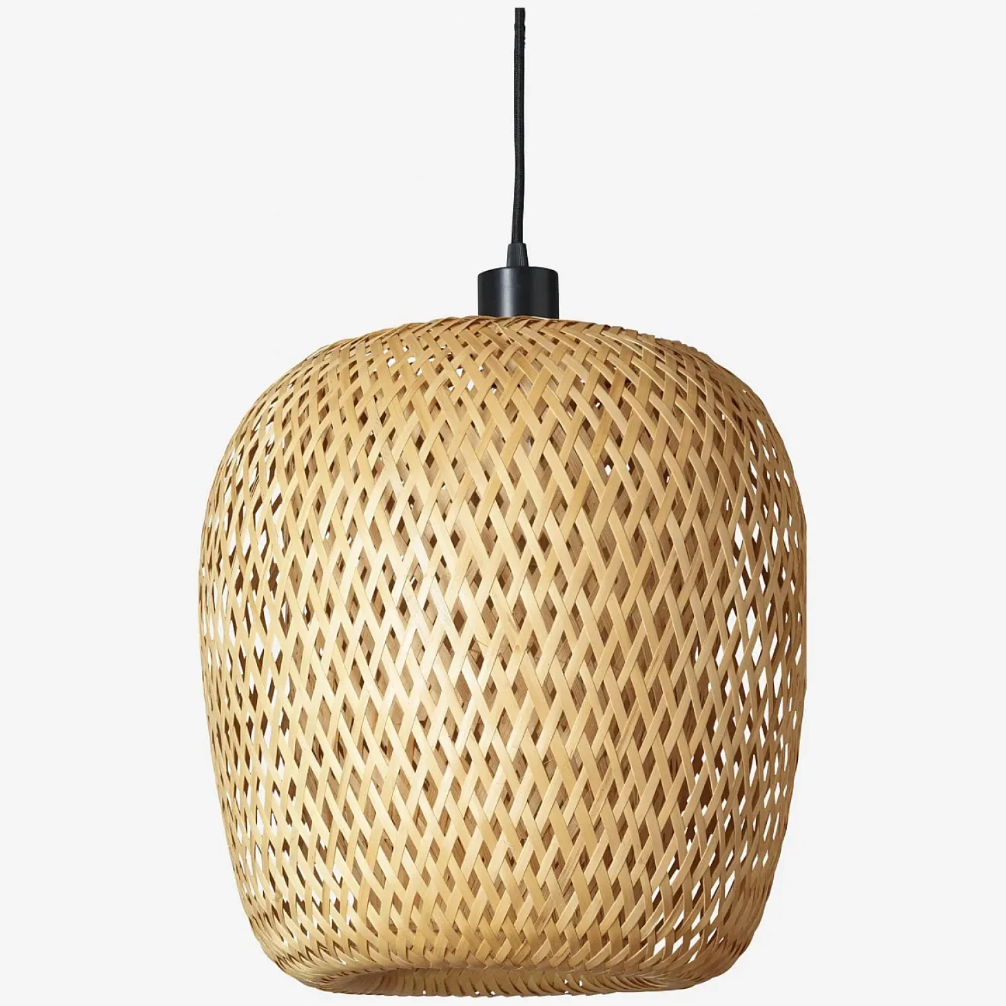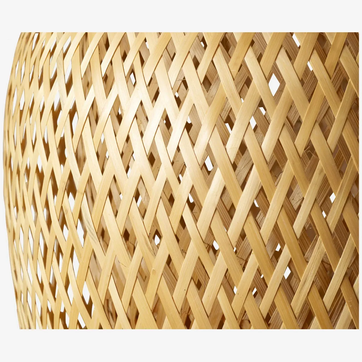 L’abat-jour pour suspension Sime en bambou mesure 37 cm de diamètre. Il se compose de deux cloches tressées à la main et imbriquées l’une dans l’autre pour un éclairage feutré et une ambiance chaleureuse.