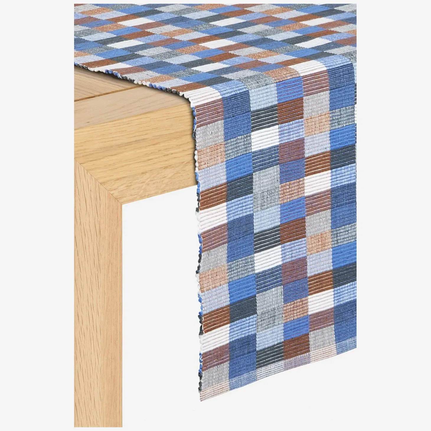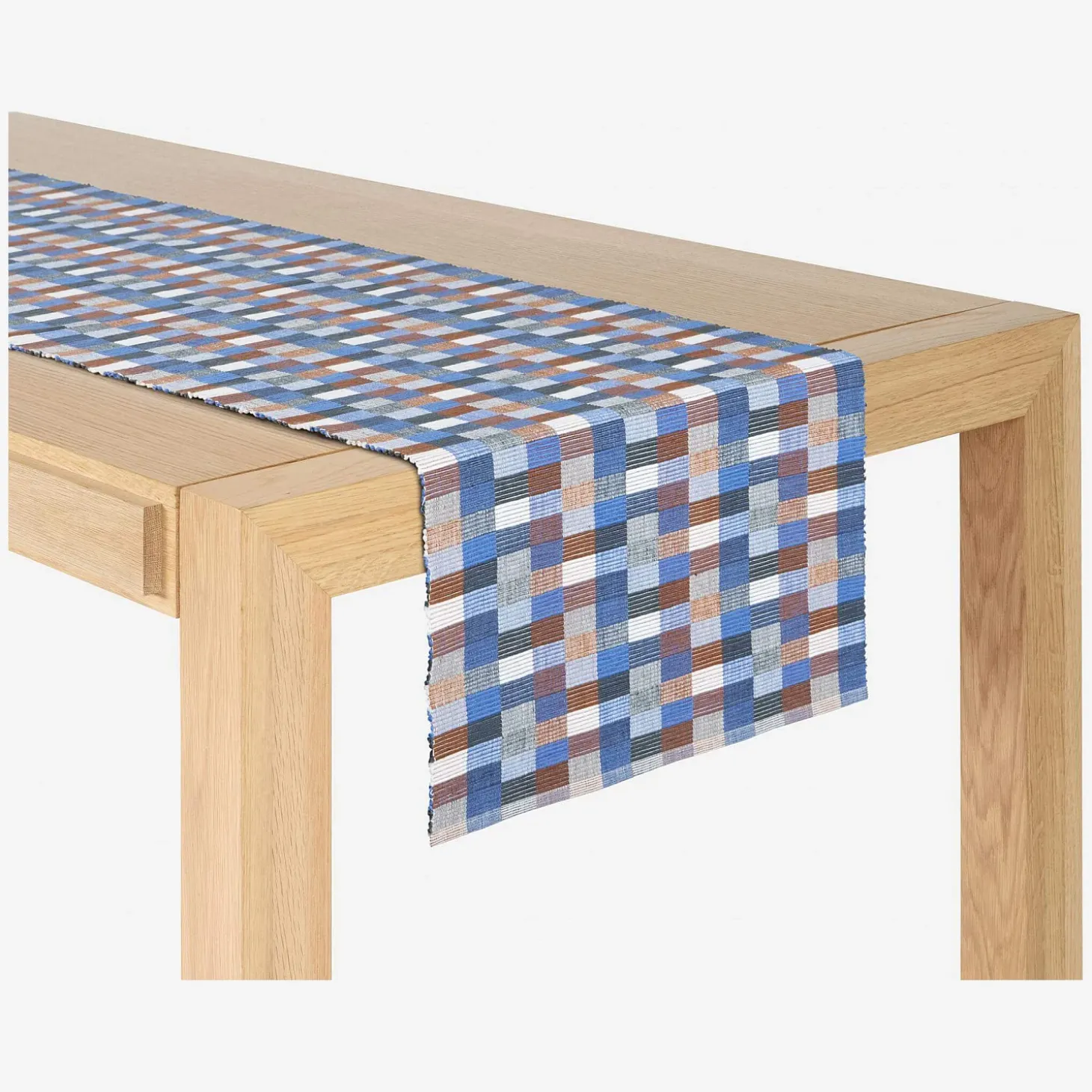 Les travers de table en coton de 140 x 40 cm affichent un motif composé de rectangles bleus et beiges.