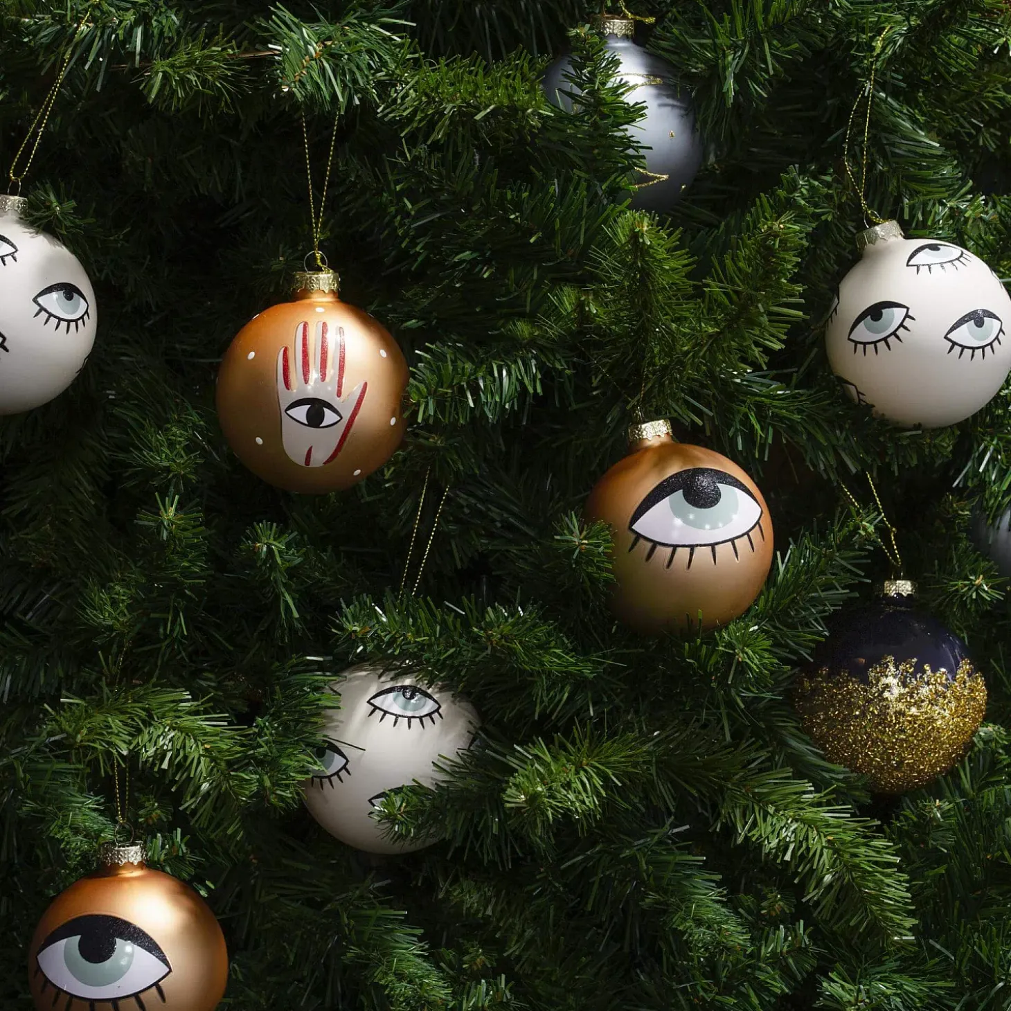 En verreTasha apporte une touche fantaisiste à vos fêtes avec ces boules de Noël en verre rose ornées d’un motif graphique.