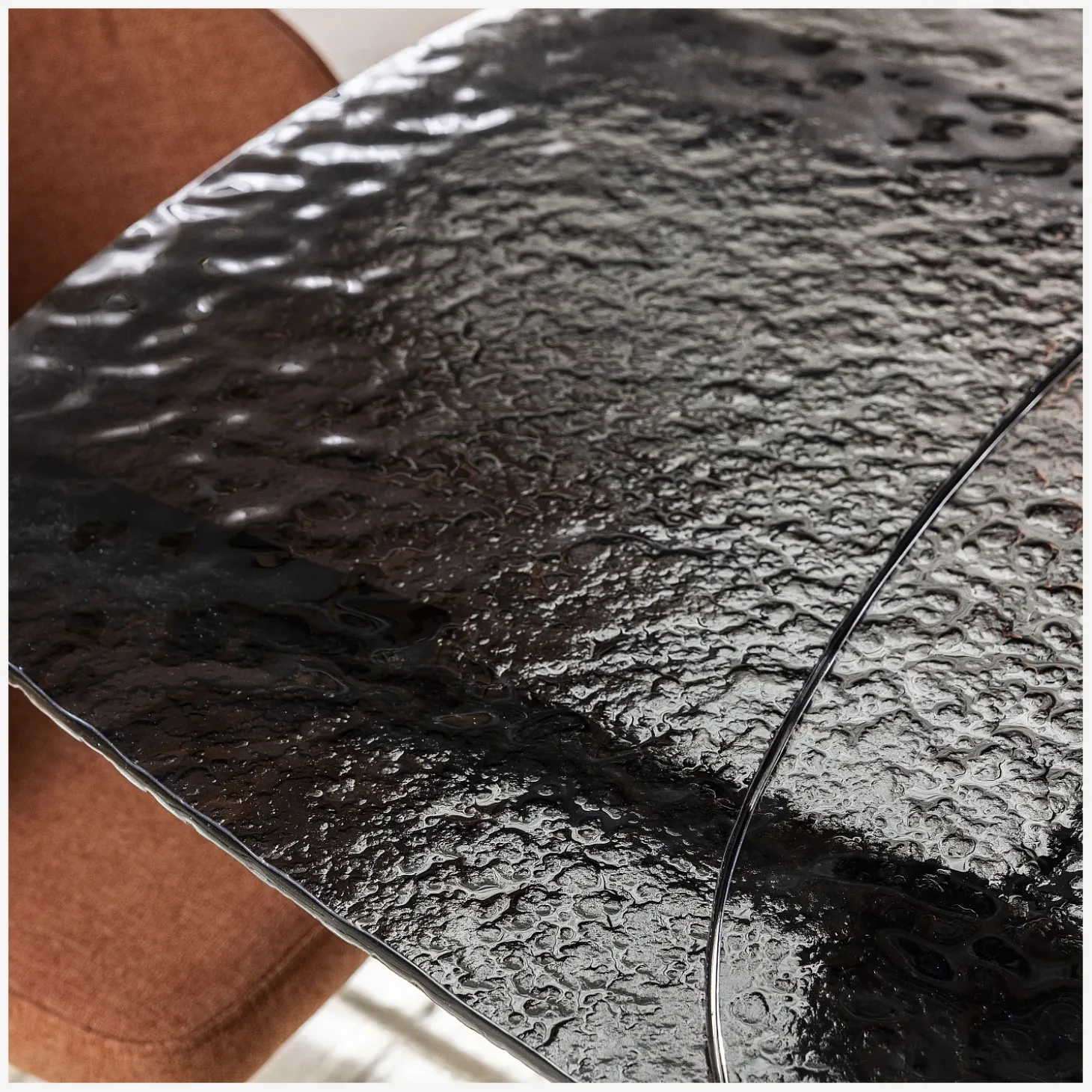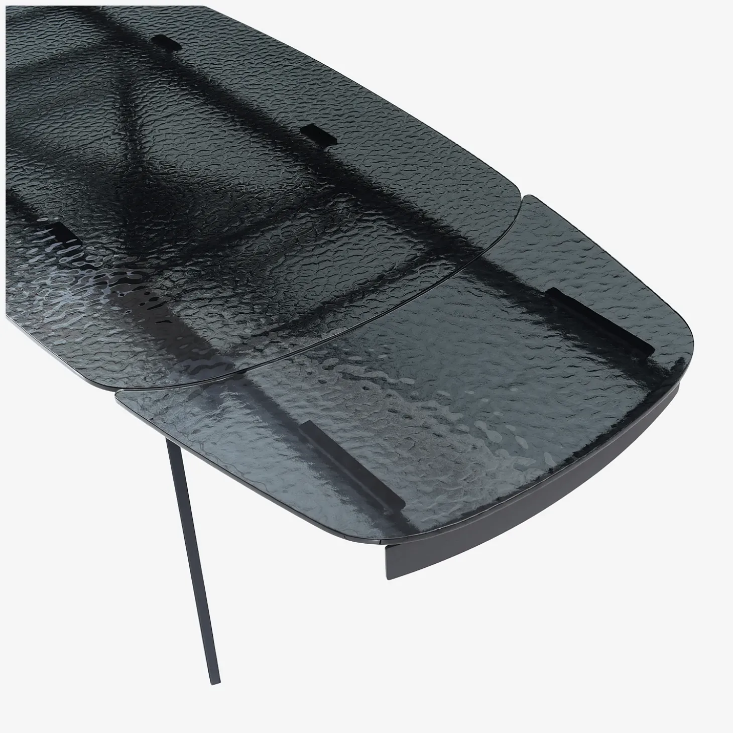 Son plateau, s’inscrivant dans la tendance actuelle du verre trempé bullé, joue subtilement avec la transparence et le relief du matériau, créant un rendu audacieux dynamisant la pièce. Ce design innovant est mis en valeur par un piètement en métal noir mat, apportant un contraste subtil.
