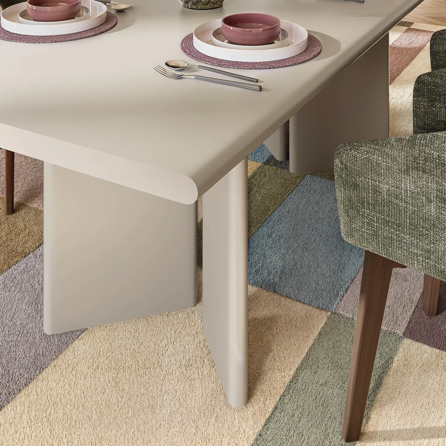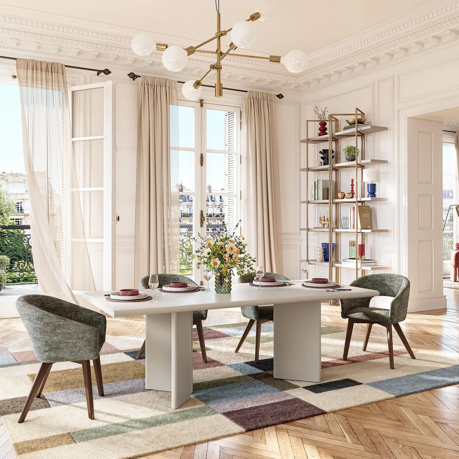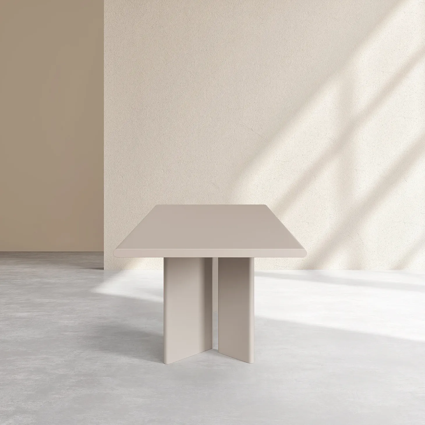 Son plateau rectangulaire aux bords arrondis repose sur un piètement croisé asymétrique, composé de volumes rectangulaires et allongés qui se décalent avec subtilité. Ce jeu de proportions inattendu crée un équilibre graphique affirmé. Sa surface généreuse est pensée pour rassembler avec aisance, que ce soit pour les repas du quotidien ou les grandes occasions.