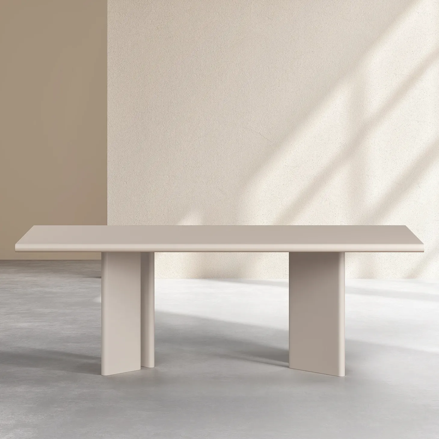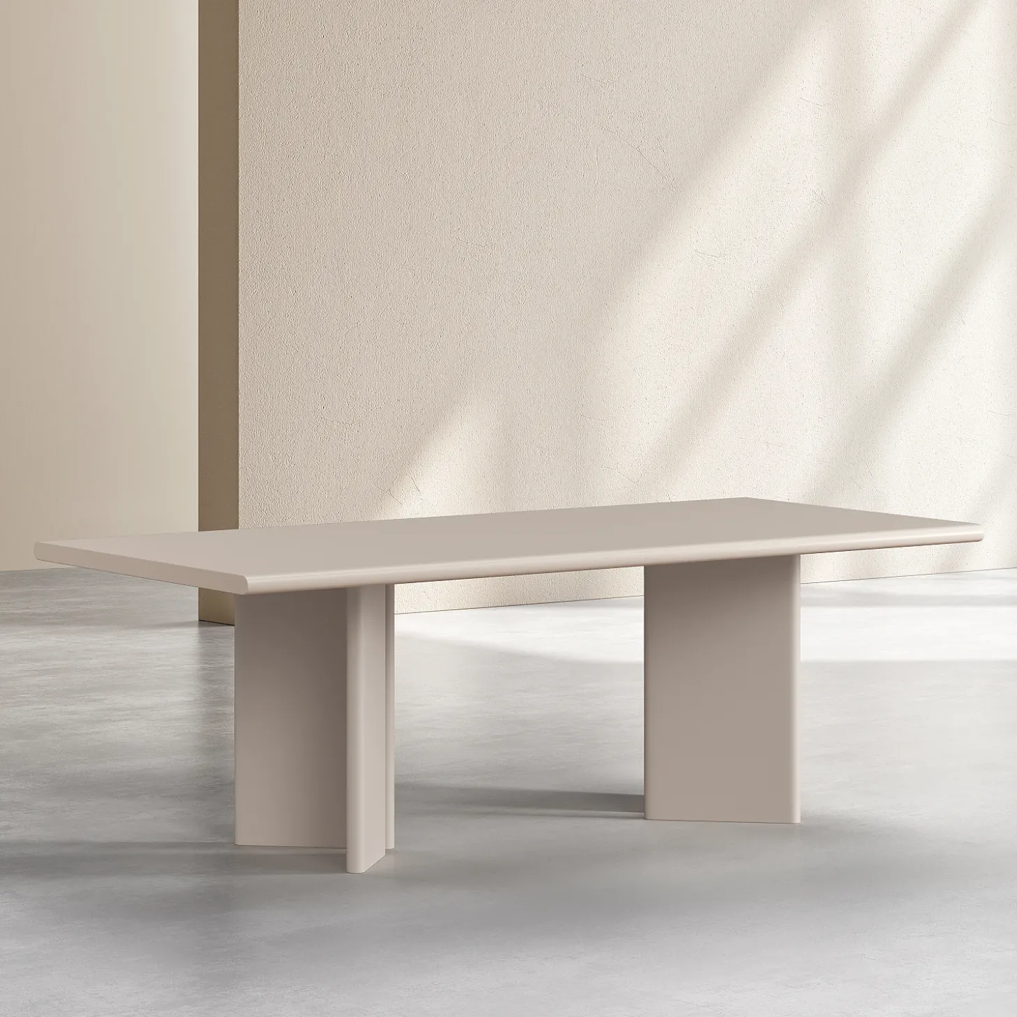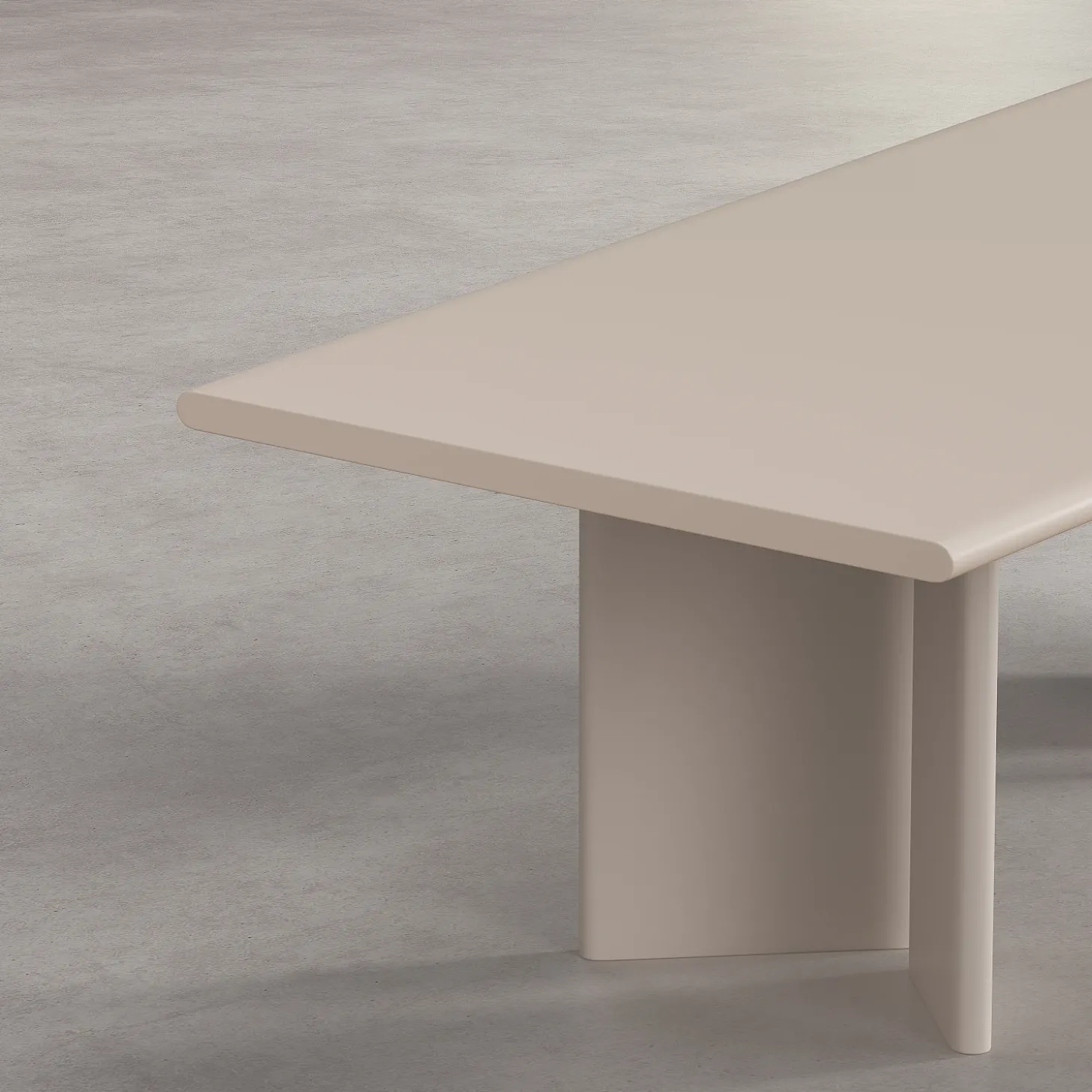Son plateau rectangulaire aux bords arrondis repose sur un piètement croisé asymétrique, composé de volumes rectangulaires et allongés qui se décalent avec subtilité. Ce jeu de proportions inattendu crée un équilibre graphique affirmé. Sa surface généreuse est pensée pour rassembler avec aisance, que ce soit pour les repas du quotidien ou les grandes occasions.