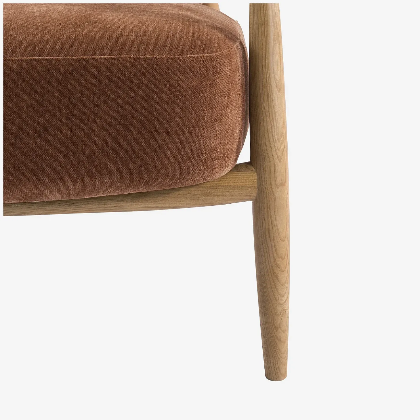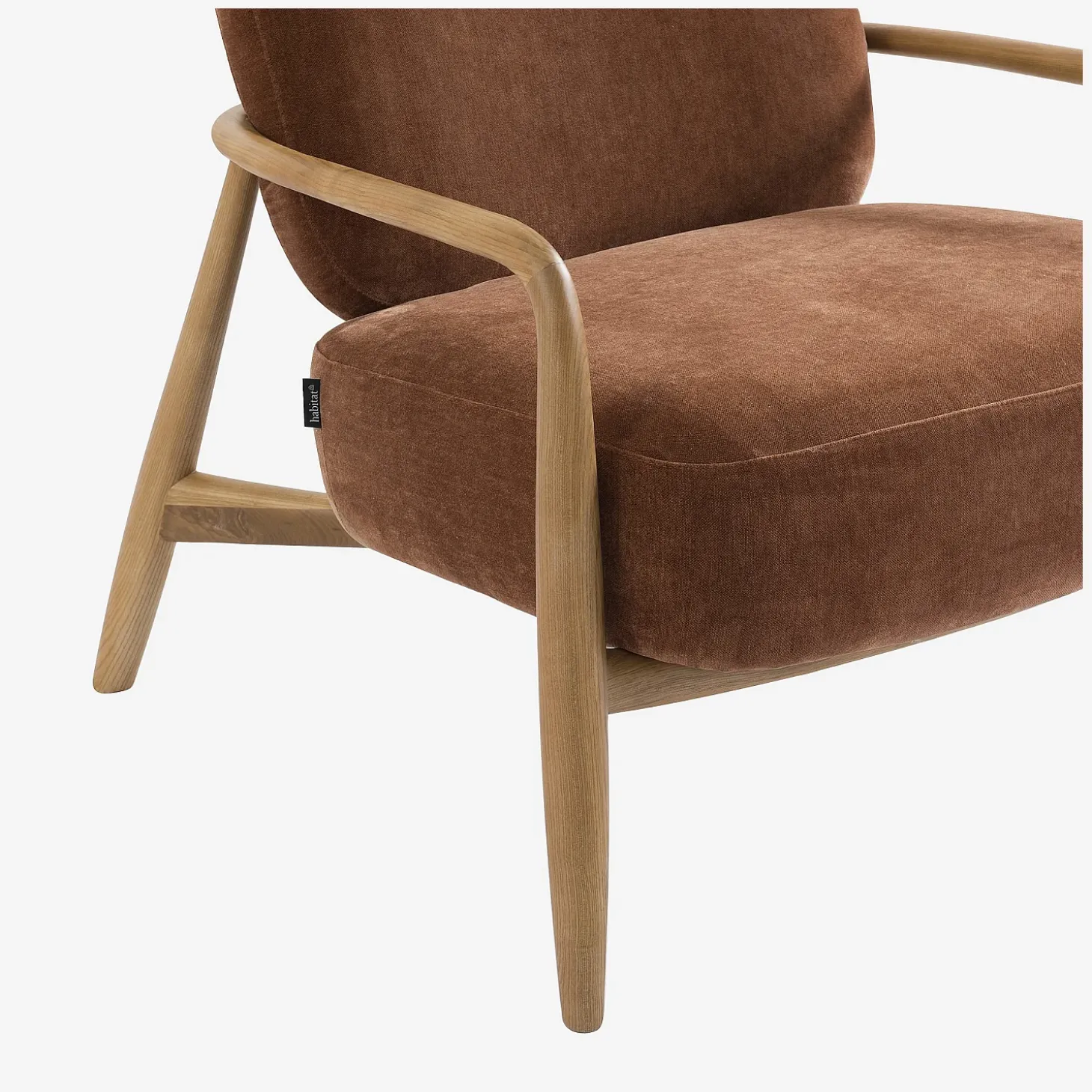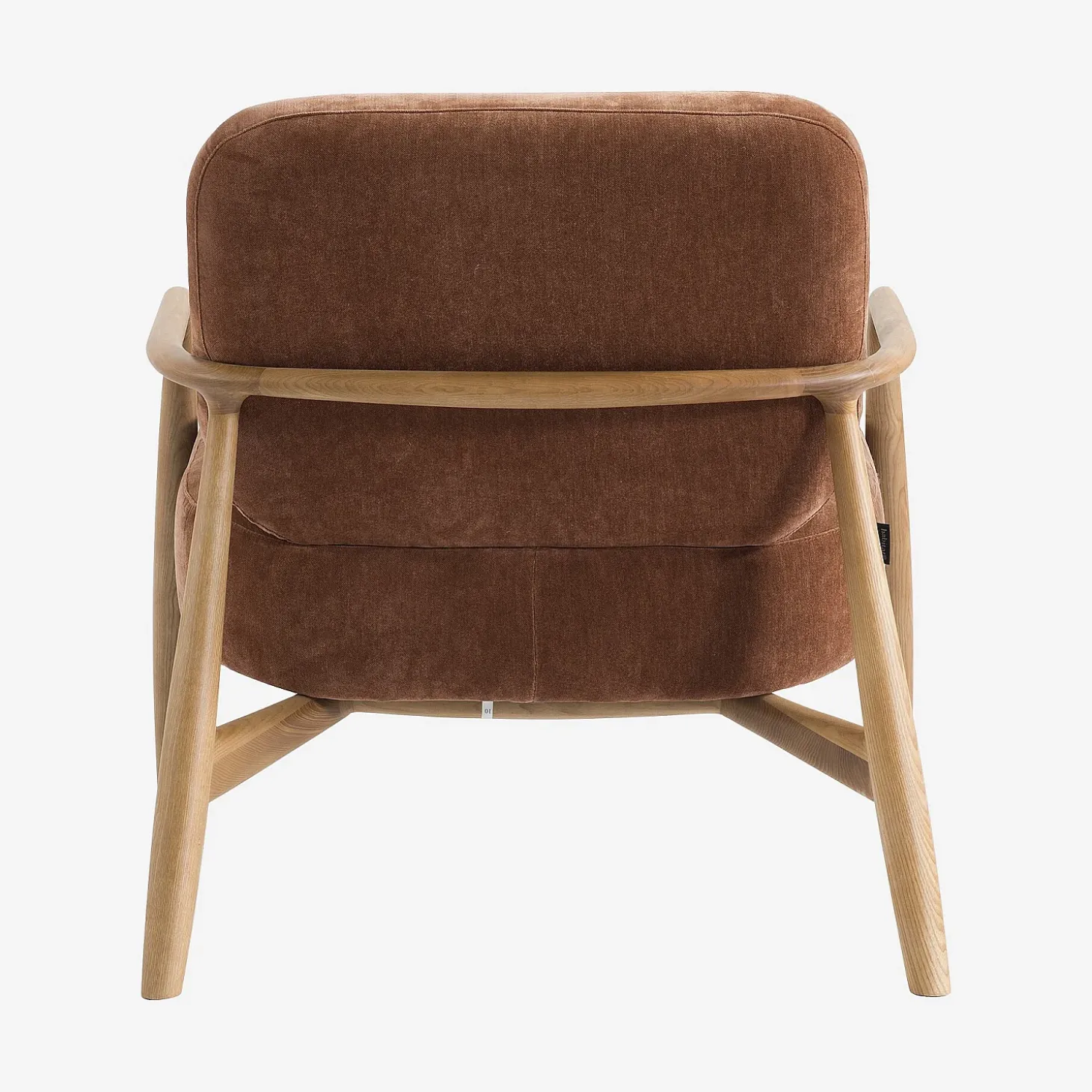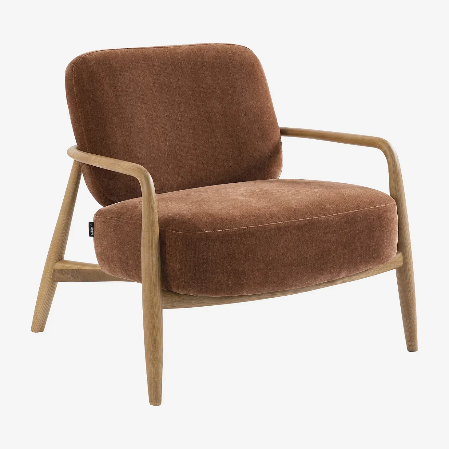 Le tissu marron cuivré, choisi pour sa tonalité apaisante et chaleureuse, enveloppe le fauteuil d’une douceur visuelle propice aux instants de calme. Son assise accueillante et son dossier confortable offrent une sensation feutrée qui fait de Velika une pièce aussi rassurante que raffinée.
