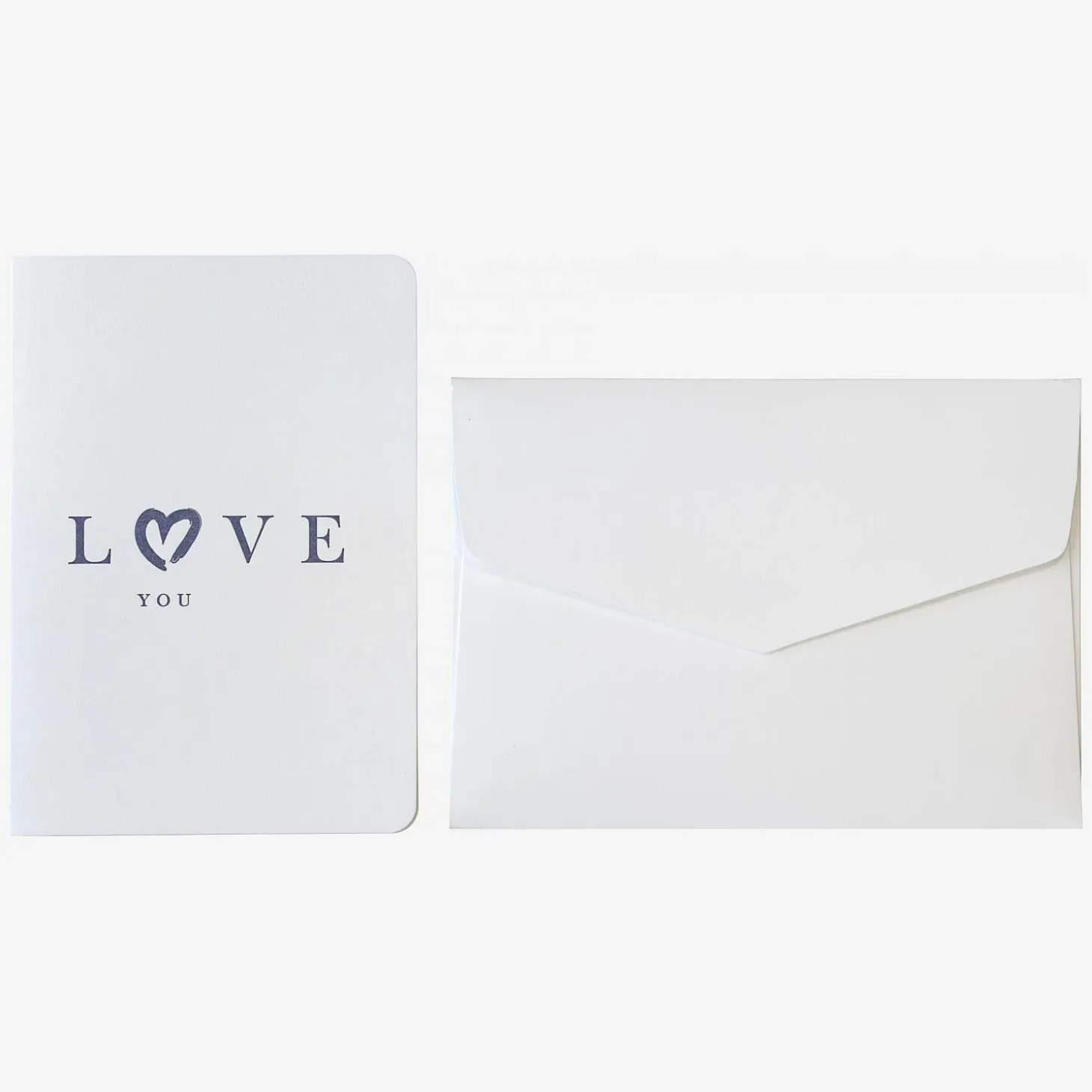 Verso signe une carte « Love you » au charme artisanal, imprimée en typographie et accompagnée de son enveloppe blanche.