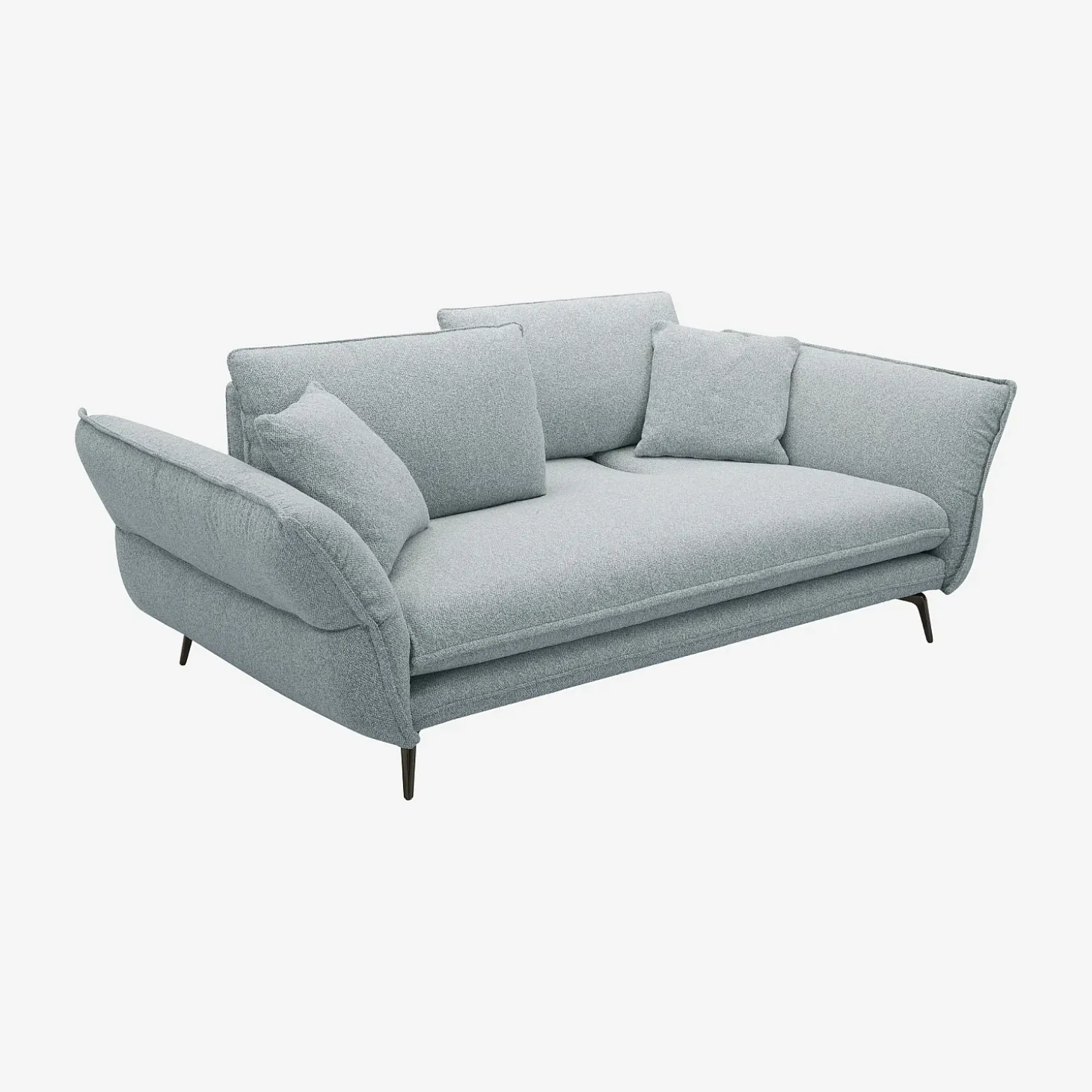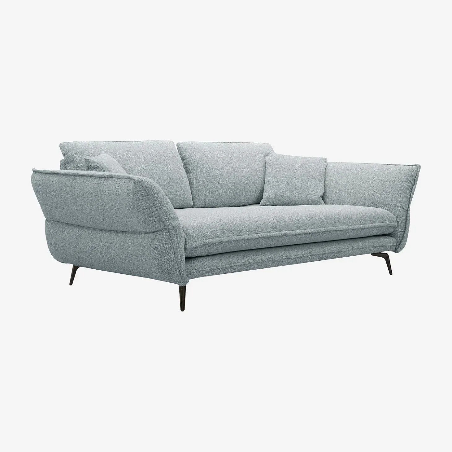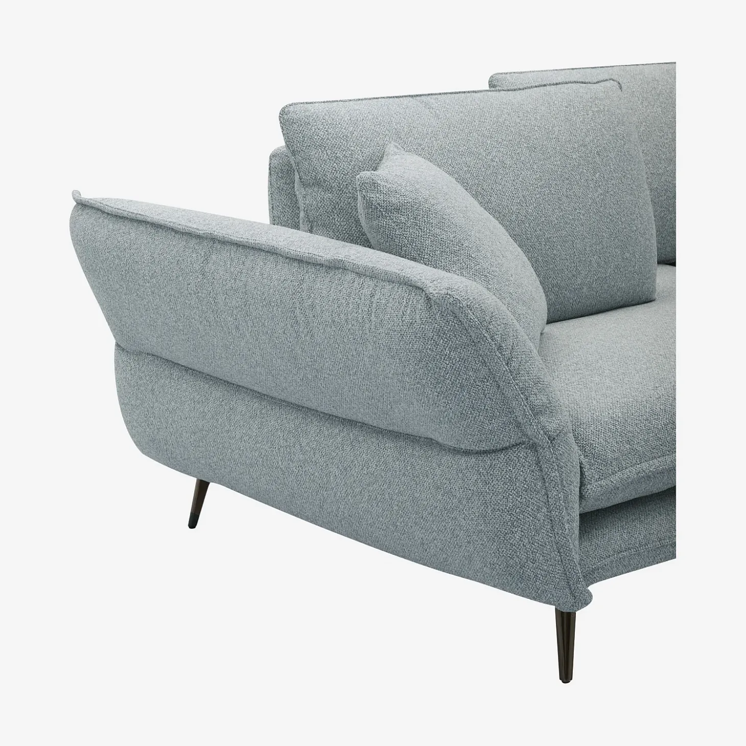 Revêtu d’un tissu texturé bleu glacier, ce canapé séduit par son aspect moderne et distingué. La structure légèrement évasée des accoudoirs, qui se replient sur eux-mêmes, ainsi que les pieds fins en métal accentuent son allure aérienne.