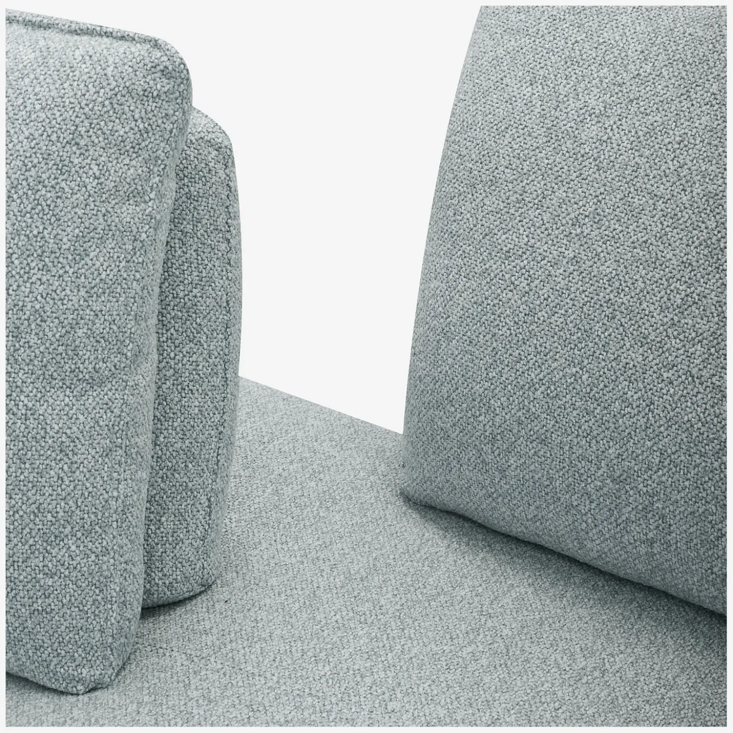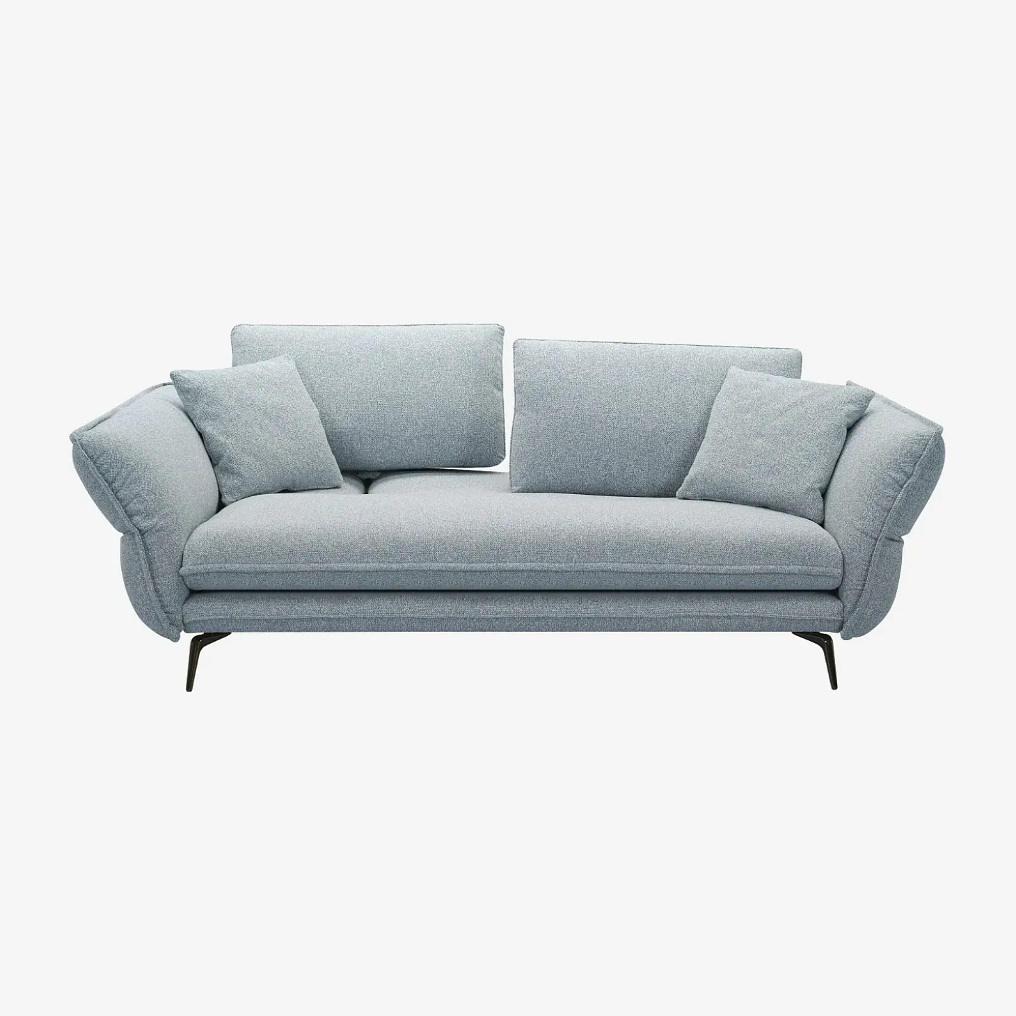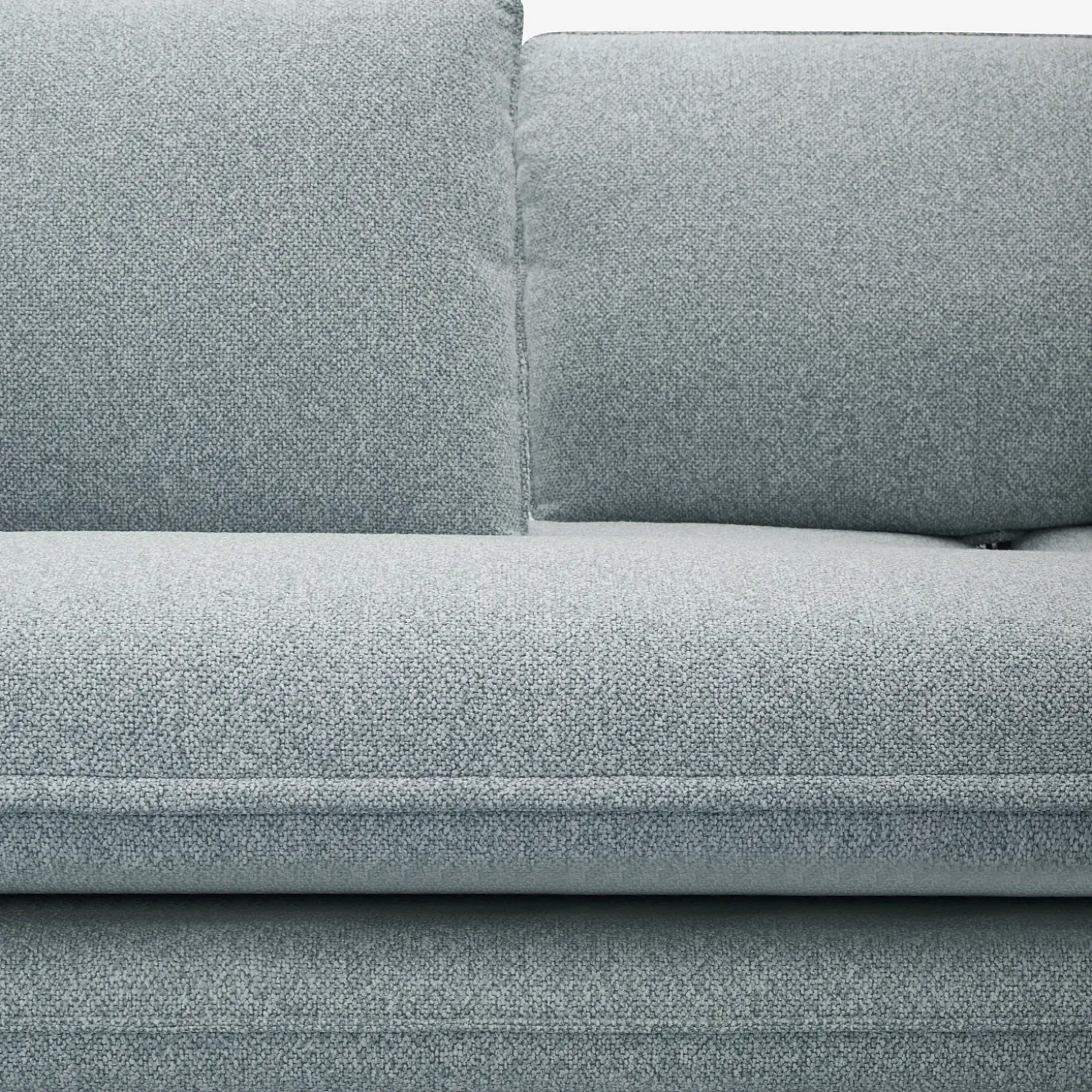 Revêtu d’un tissu texturé bleu glacier, ce canapé séduit par son aspect moderne et distingué. La structure légèrement évasée des accoudoirs, qui se replient sur eux-mêmes, ainsi que les pieds fins en métal accentuent son allure aérienne.