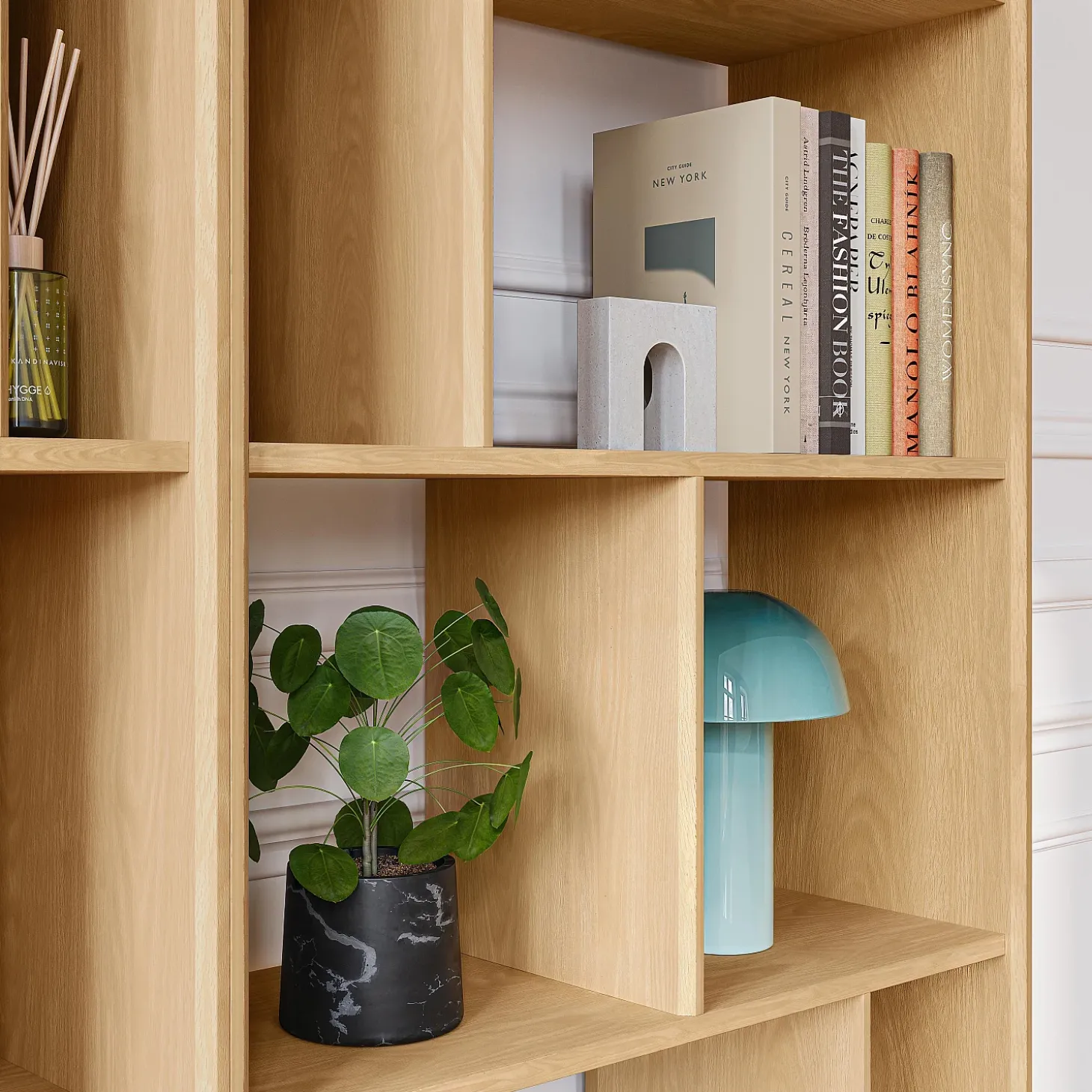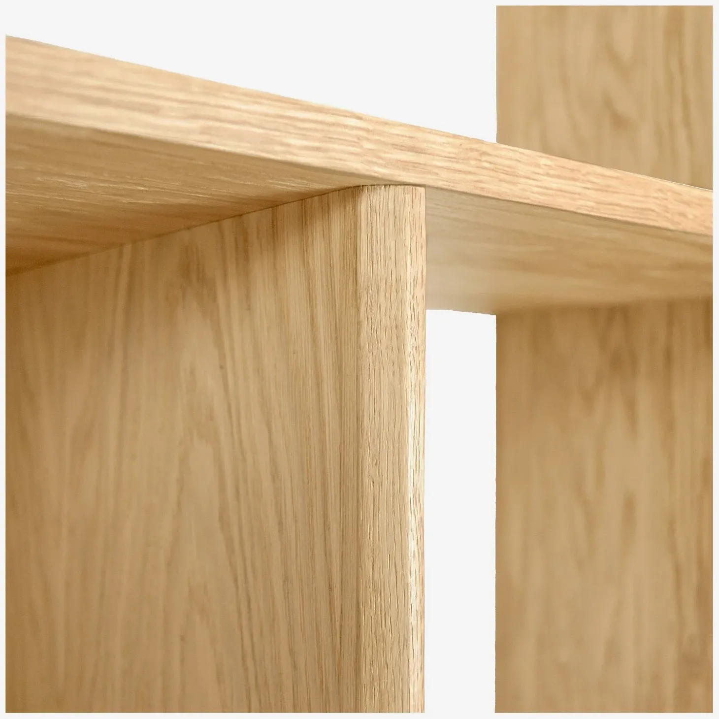Ses ouvertures multiples partiellement ajourées créent un rythme visuel subtil laissant circuler la lumière et permettent un jeu de profondeur. L’agencement asymétrique structure la pièce tout en valorisant les objets exposés.