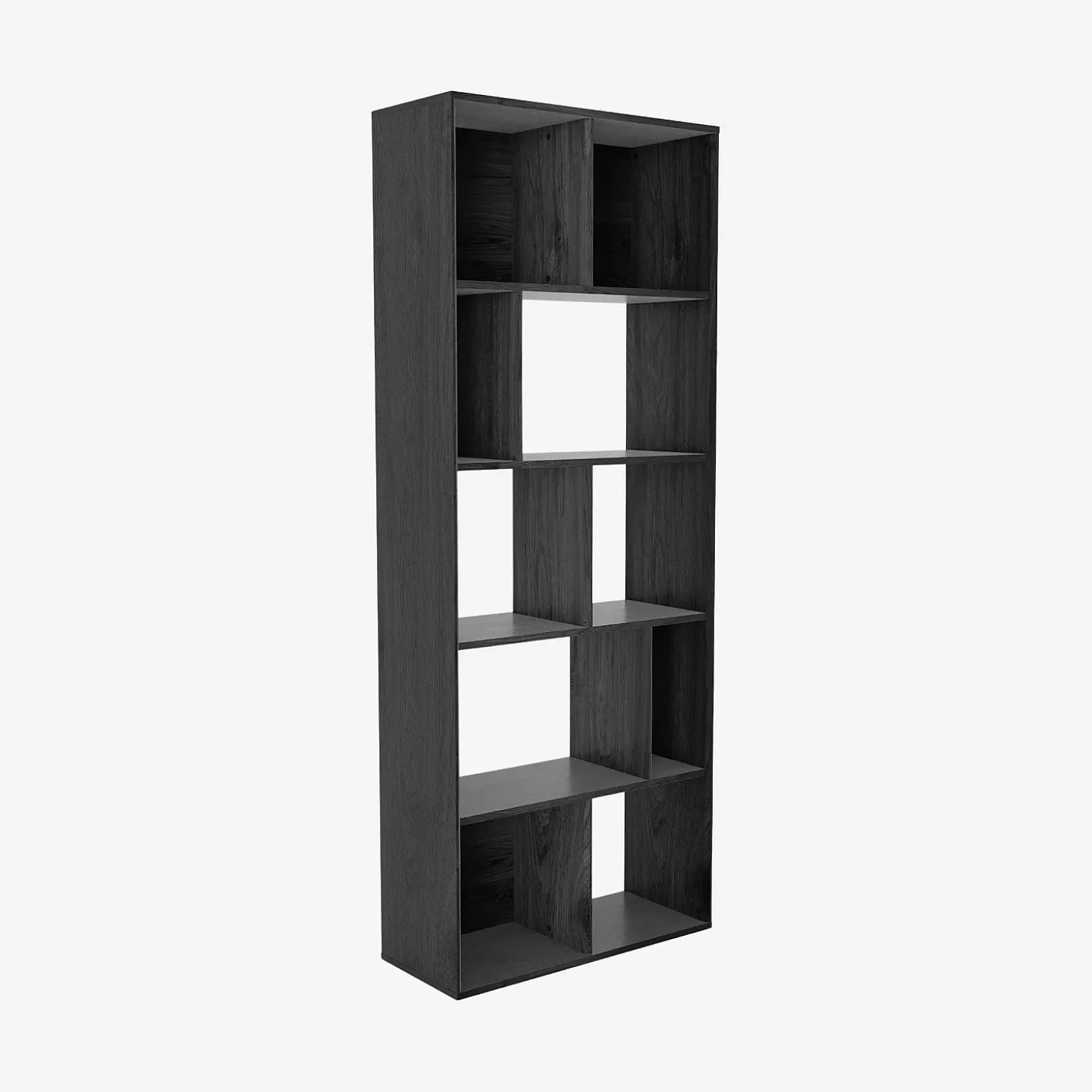 Ses ouvertures multiples partiellement ajourées créent un rythme visuel subtil laissant circuler la lumière et permettent un jeu de profondeur. L’agencement asymétrique structure la pièce tout en valorisant les objets exposés.