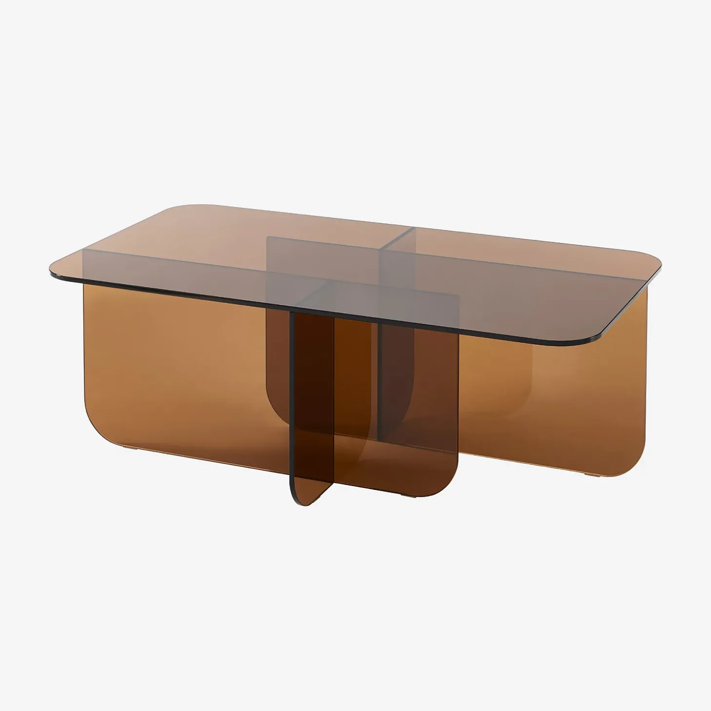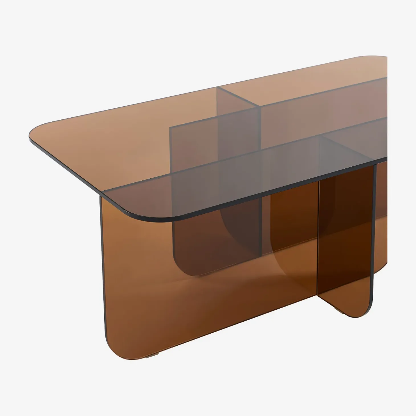 Son plateau rectangulaire marron ambré diffuse une lumière chaleureuse, révélant une profondeur raffinée qui anime l’espace. Les lignes aux angles adoucis insufflent fluidité et équilibre, tandis que le piètement, composé de formes semi-circulaires assemblées en croix, déploie une architecture intérieure spectaculaire. Selon l’angle de vue, sa silhouette évolue, laissant apparaître des facettes différentes de son design et donnant l’impression d’un piètement en perpétuelle métamorphose.
